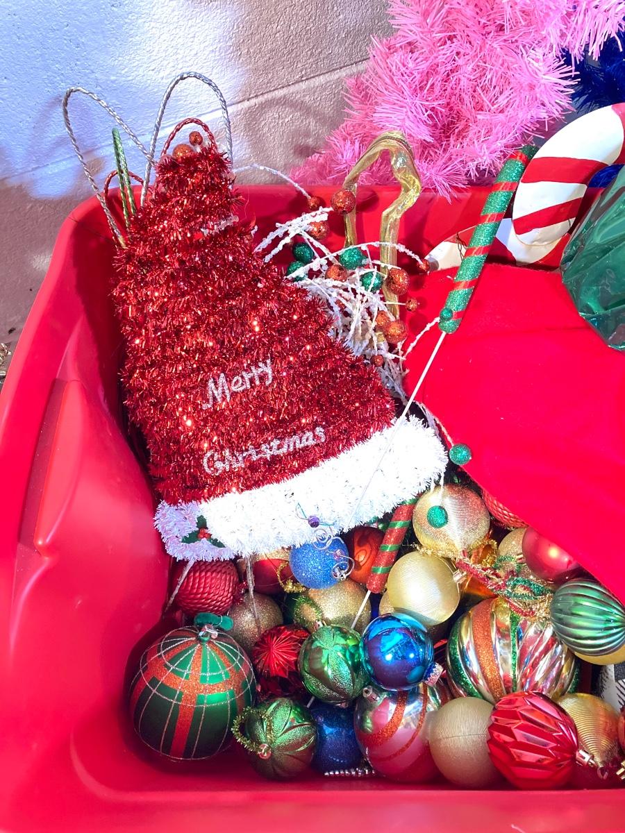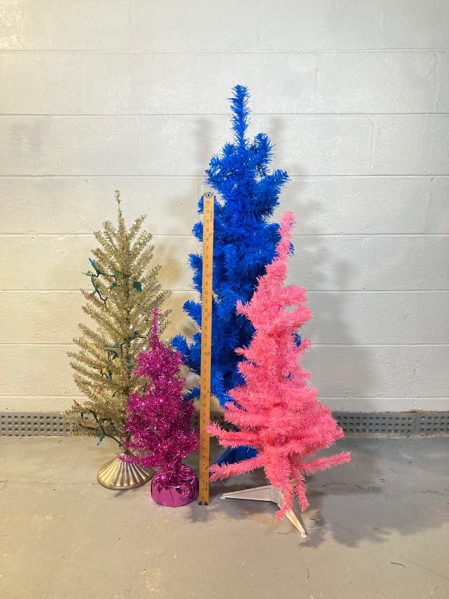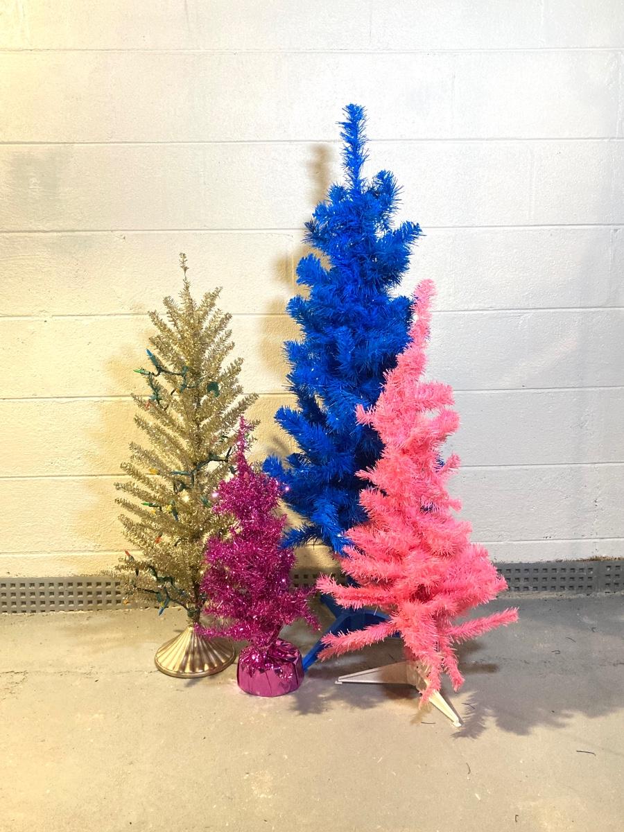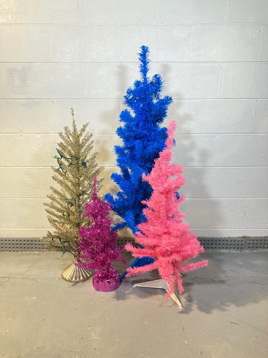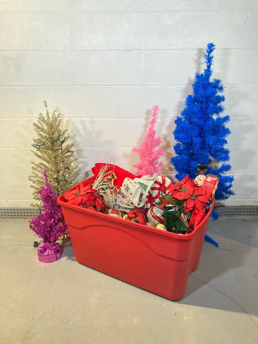 LOT 59: Colorful Christmas Trees and Tote filled with Decorations