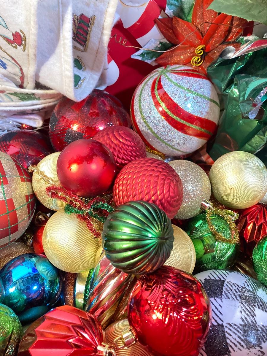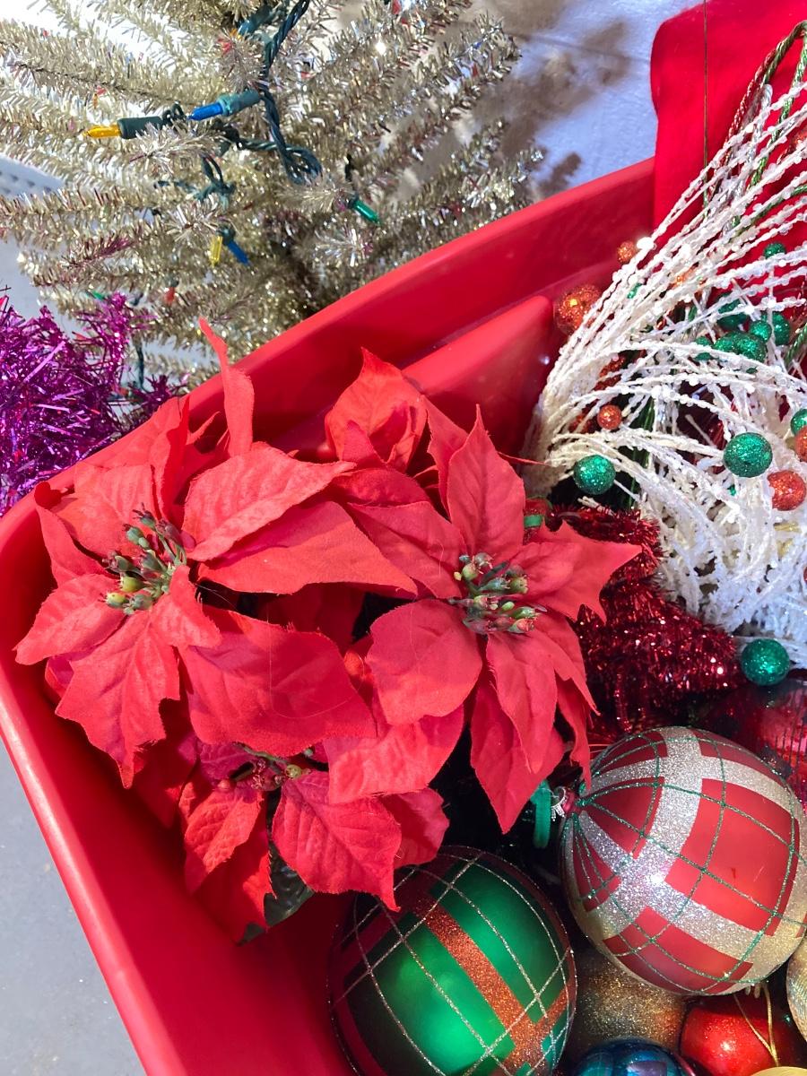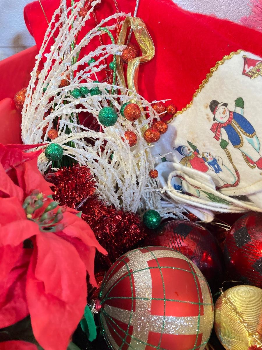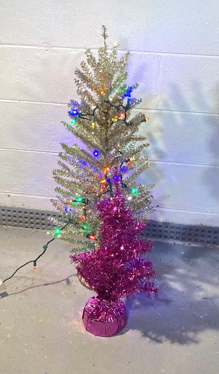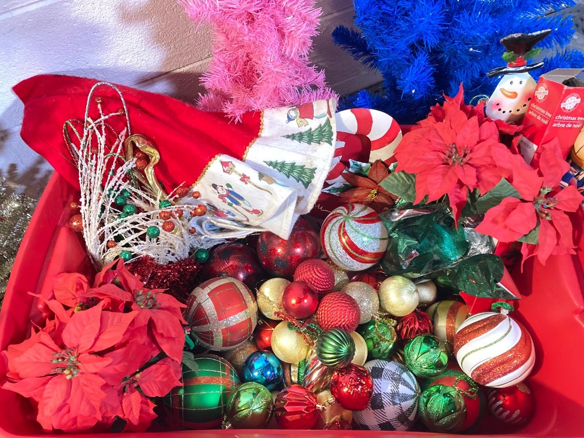 LOT 59: Colorful Christmas Trees and Tote filled with Decorations