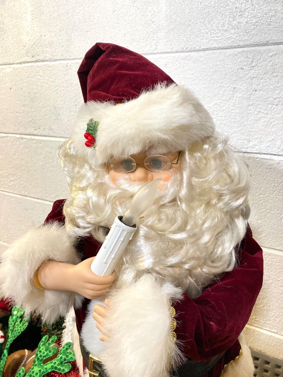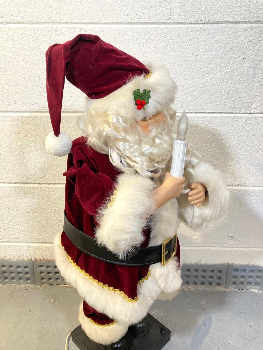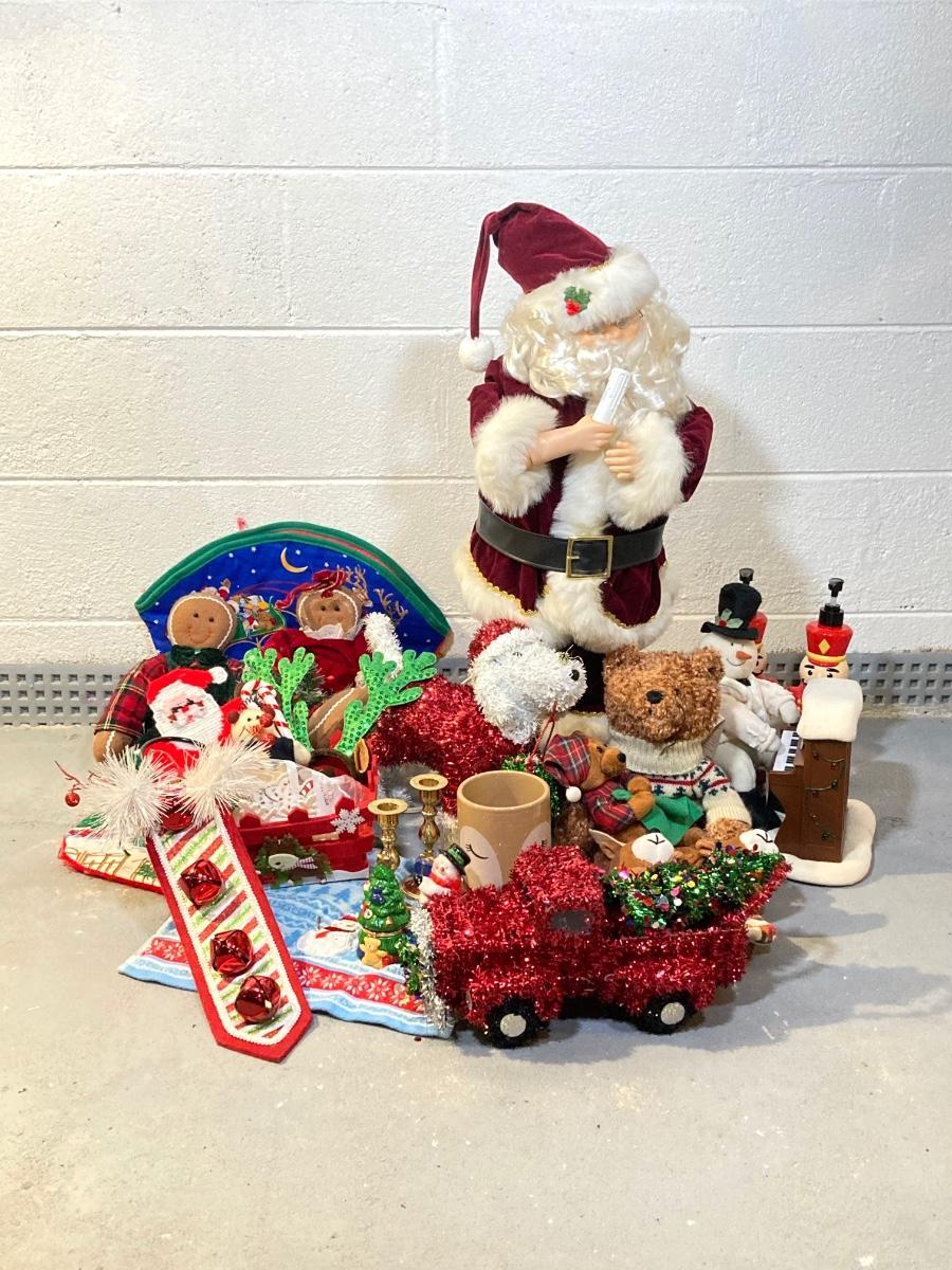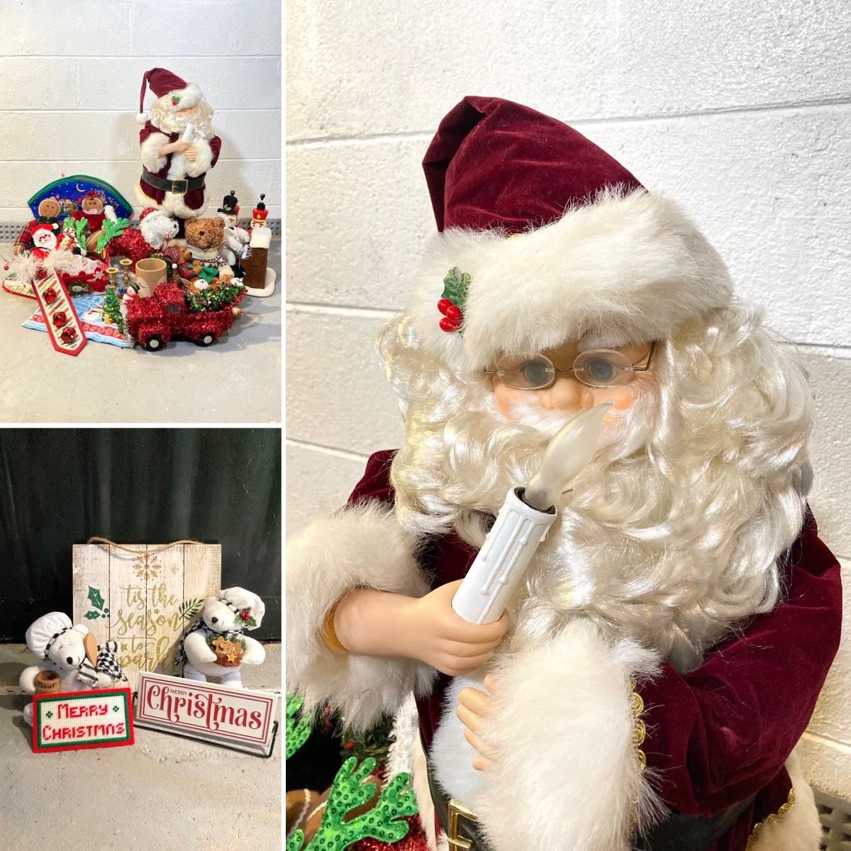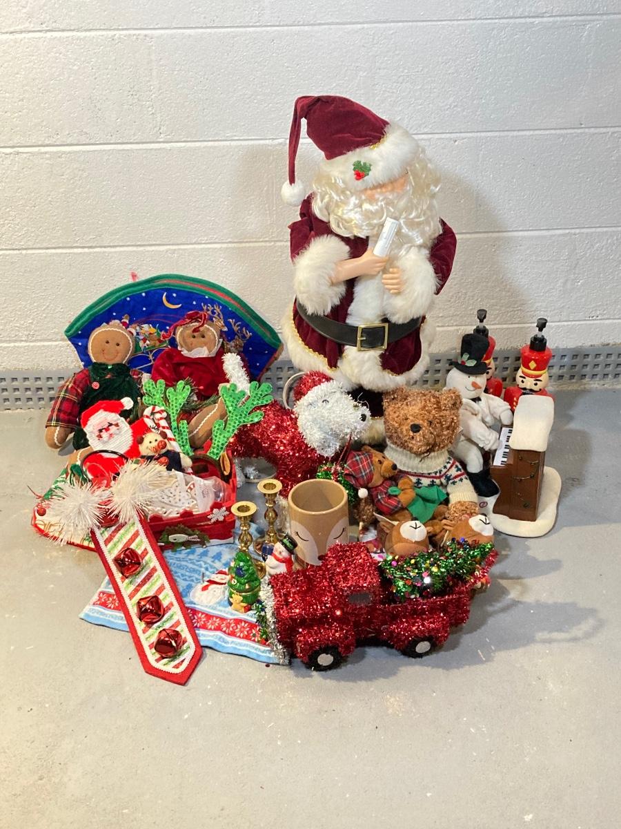 LOT 65: Large Christmas Collection - Mechanical / Musical Santa, Brass Candlestick Holders, Plush Animals, Signs and Much More