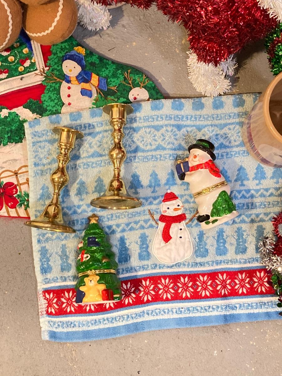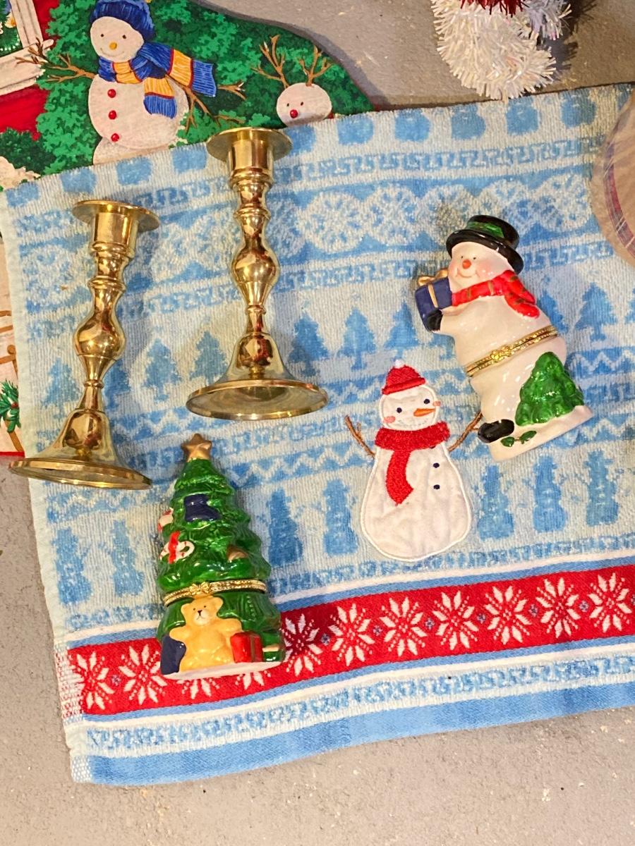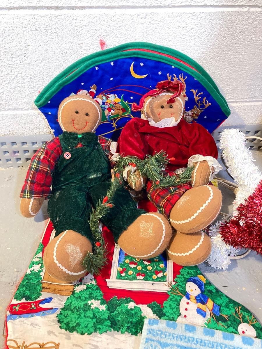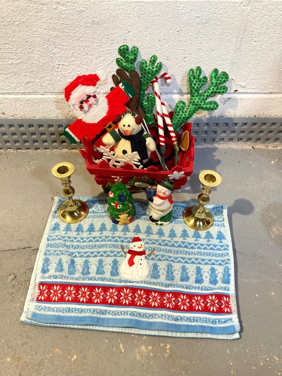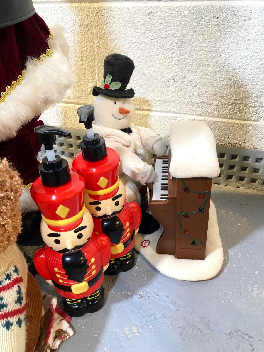 LOT 65: Large Christmas Collection - Mechanical / Musical Santa, Brass Candlestick Holders, Plush Animals, Signs and Much More