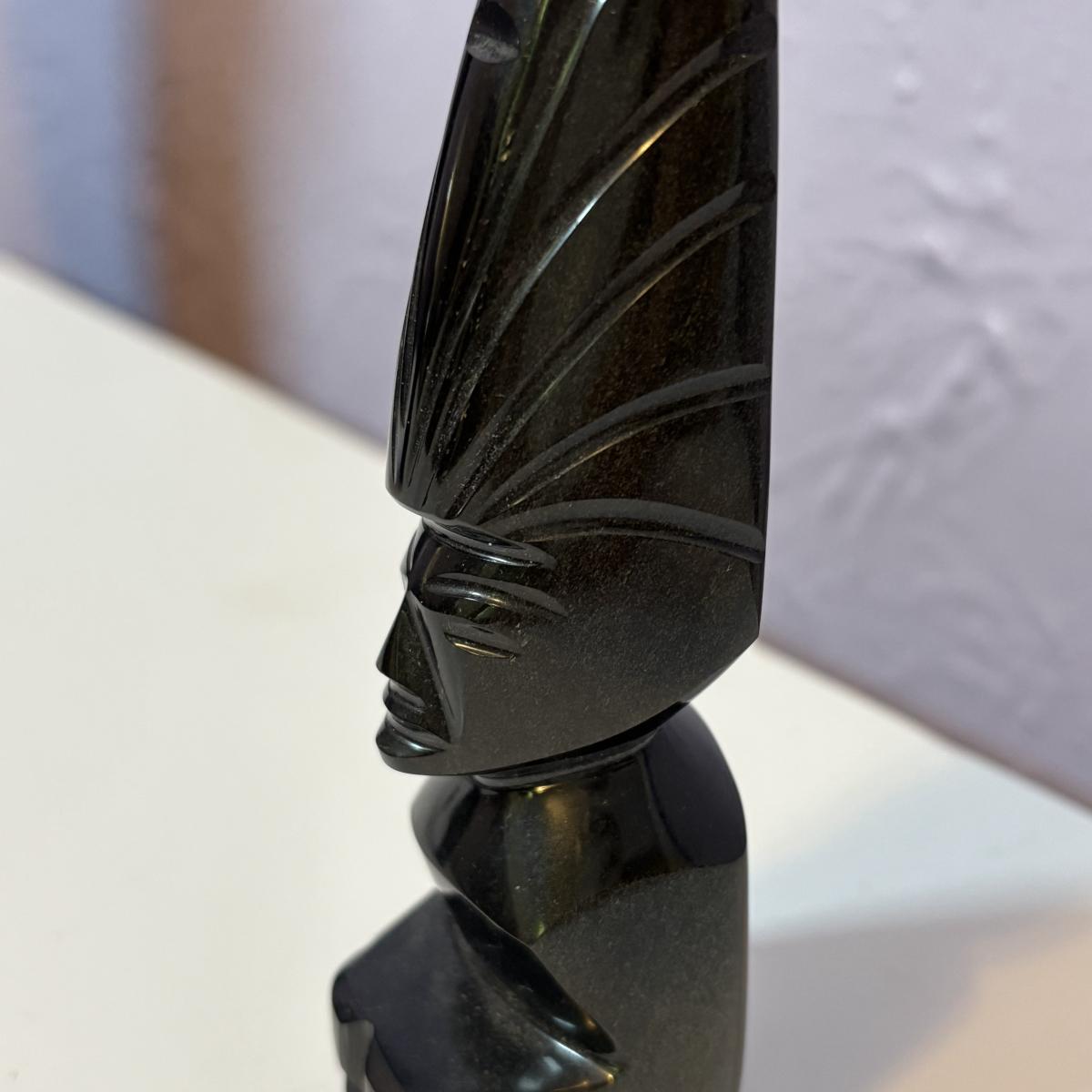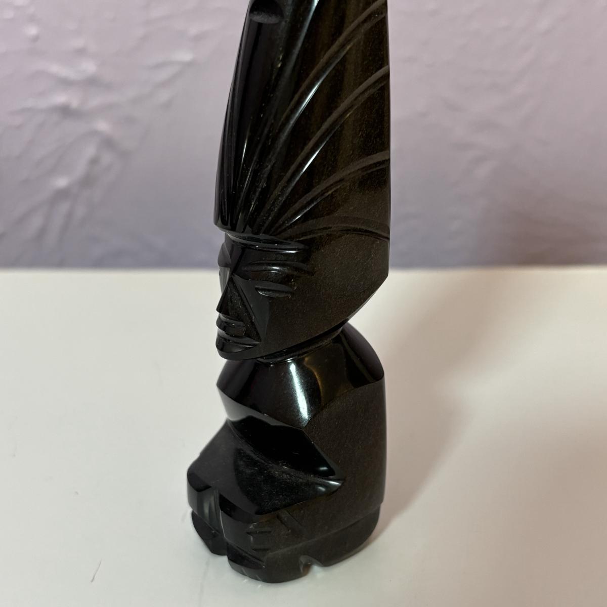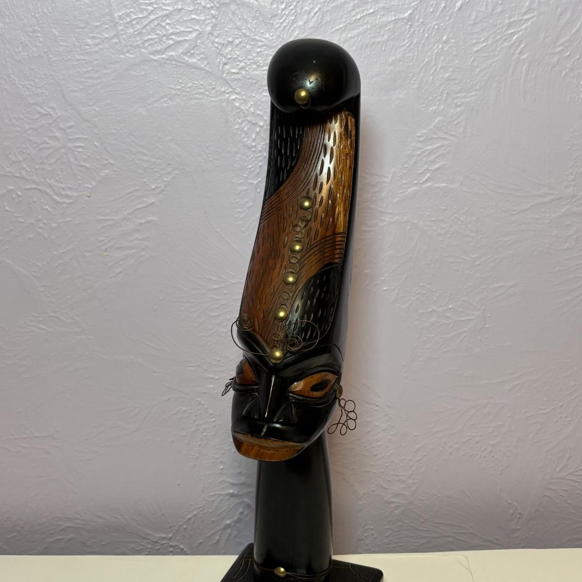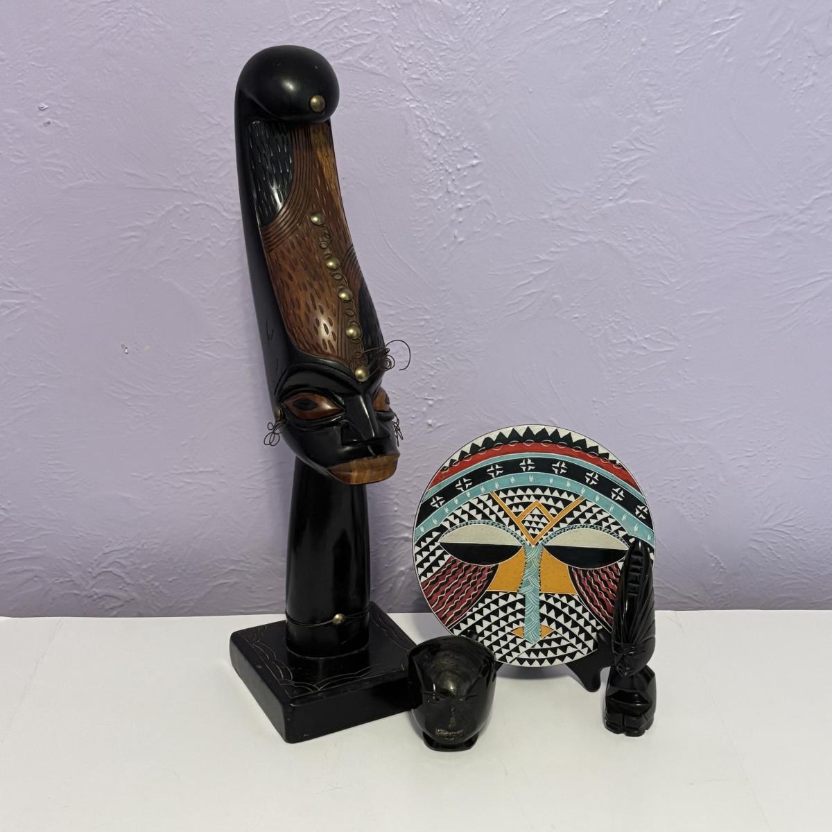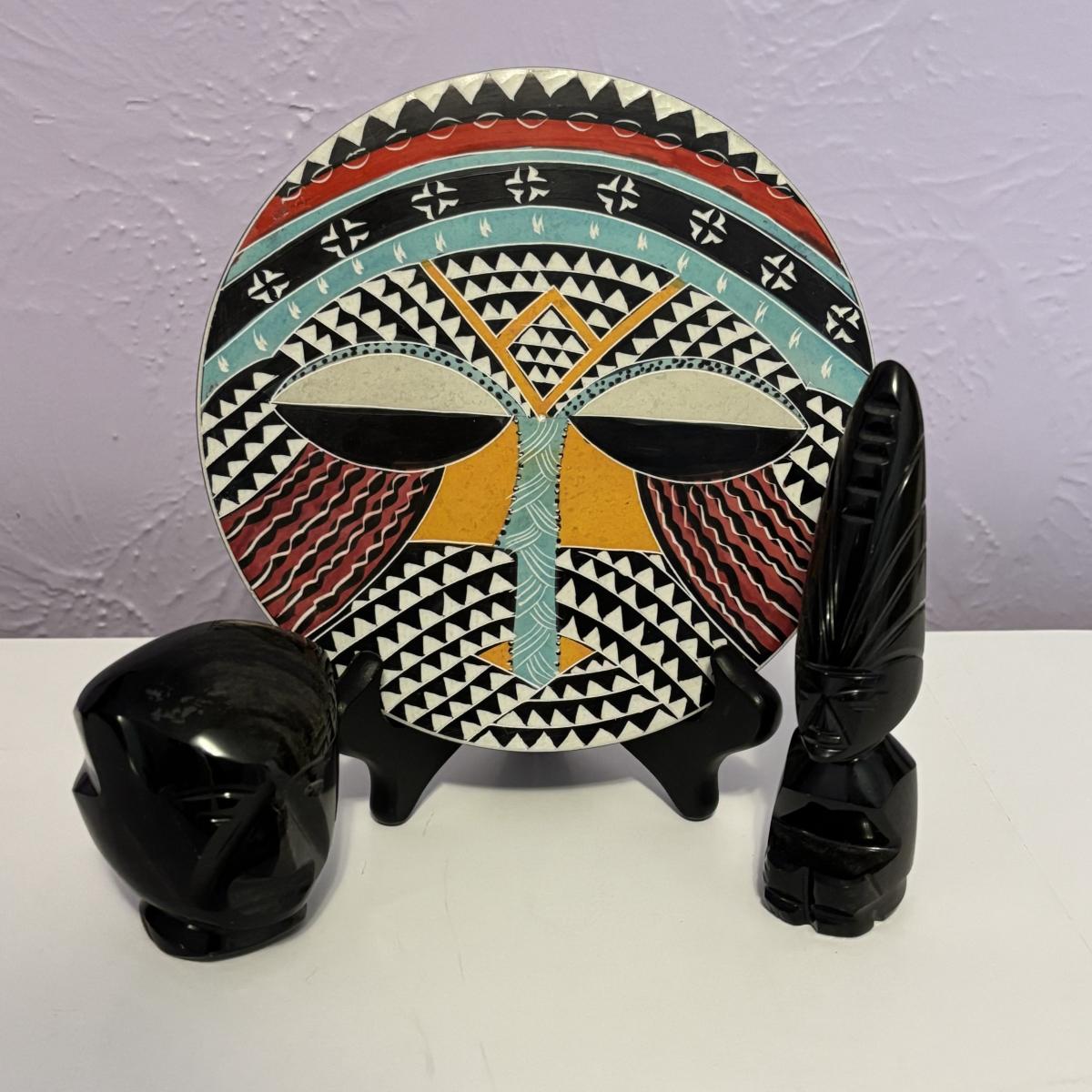 LOT 90: Vintage Carved Wooden Tribal Statue w/Metal Accents, Hand Made in Kenya Wall Art/Trivet along with 2 Black Onyx Statues