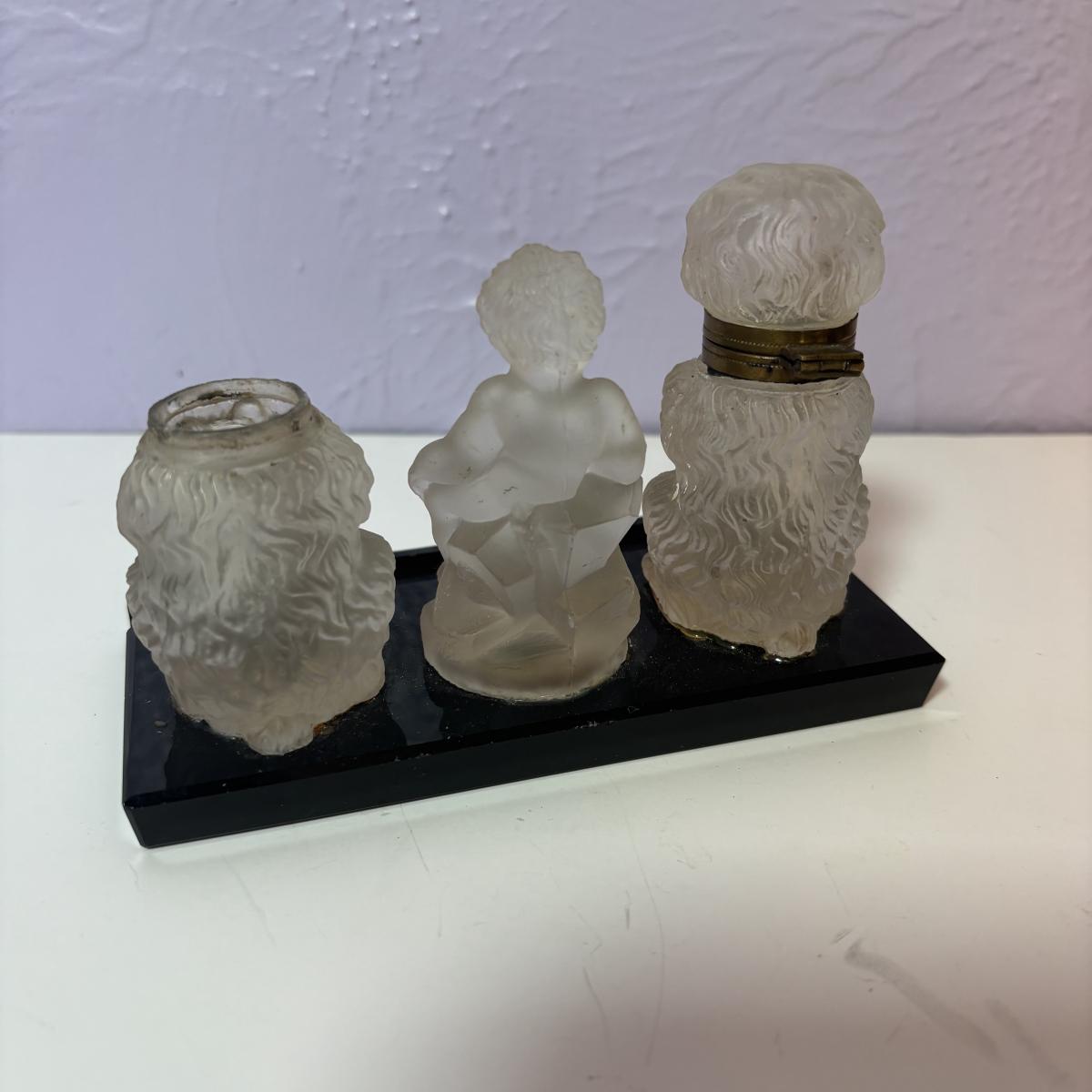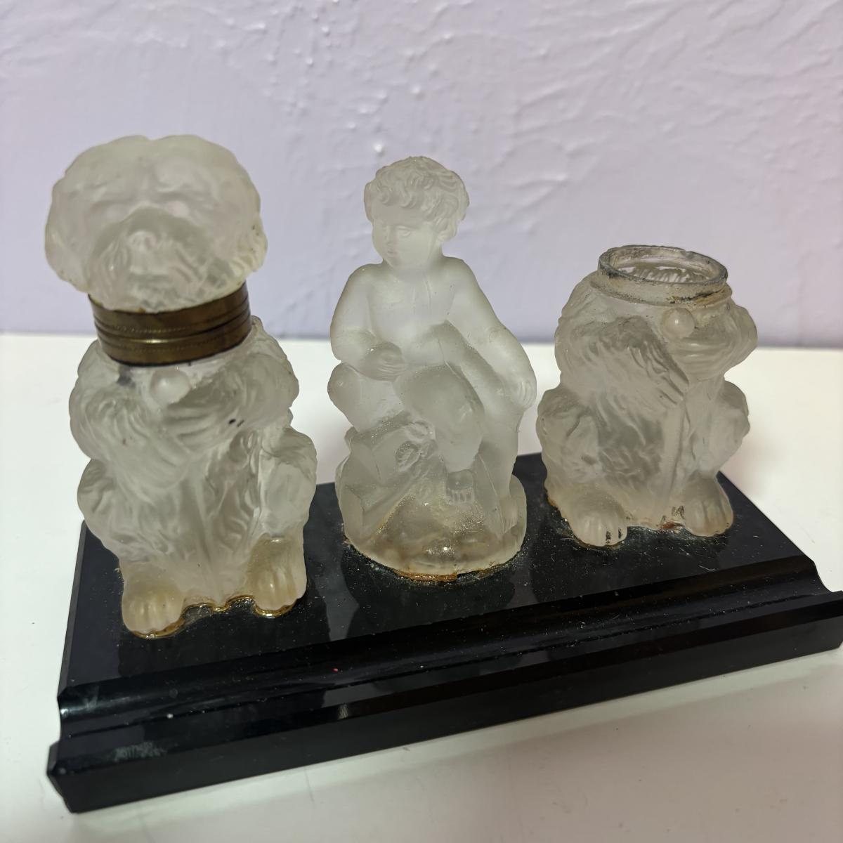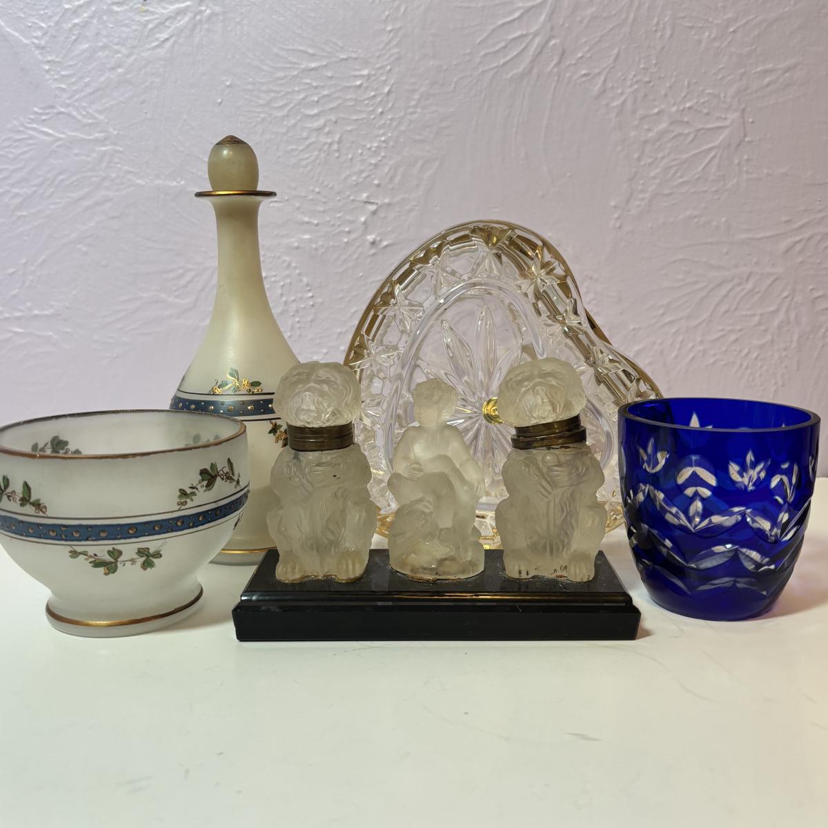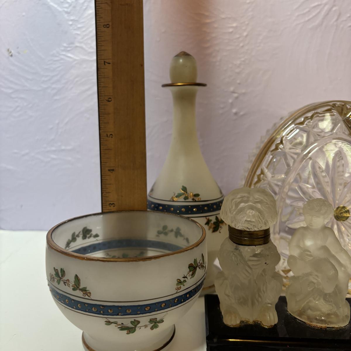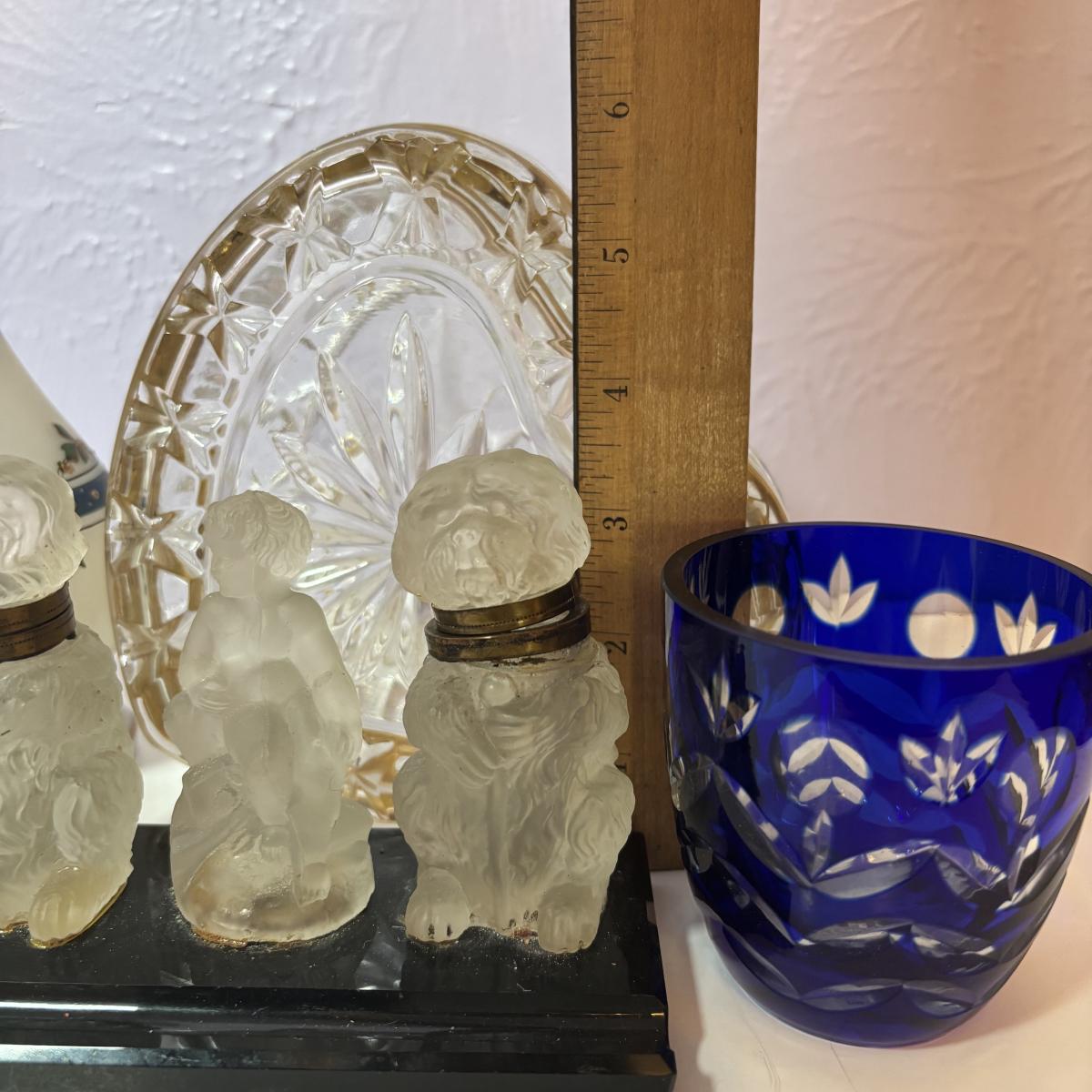 LOT 96: Vintage Cobalt Blue Cut to Clear Glass, Lead Crystal Heart, Frosted Dog Inkwells w/Cherub Mounted on Glass Base, Painted Frosted Glass Perfume Bottle w/Bowl