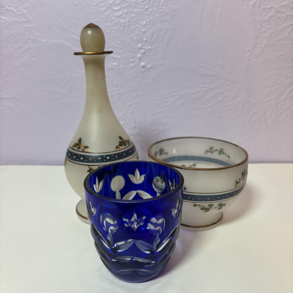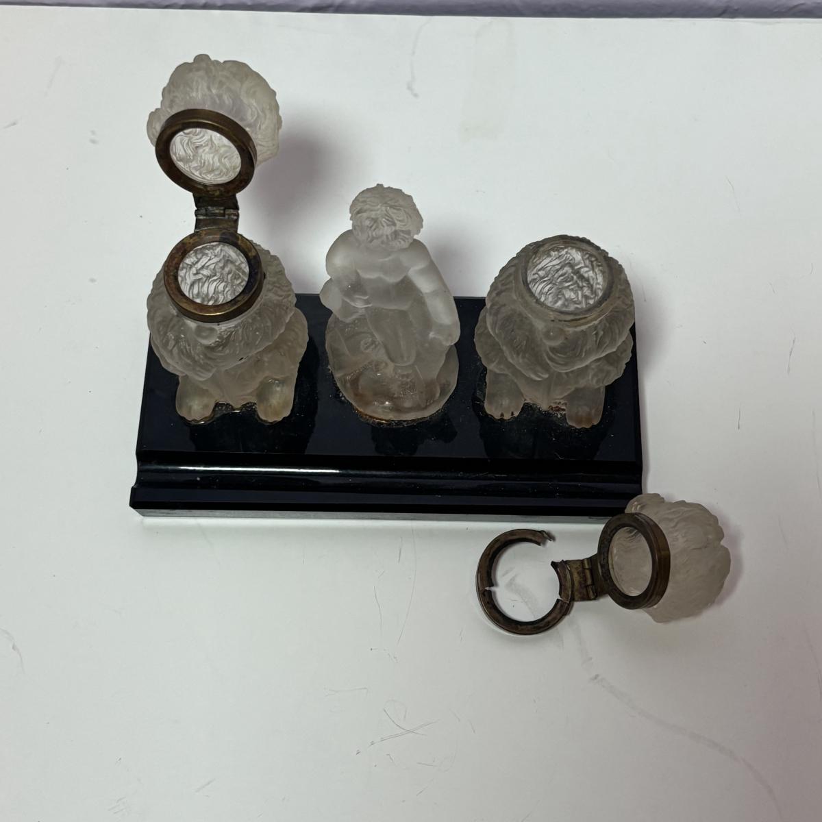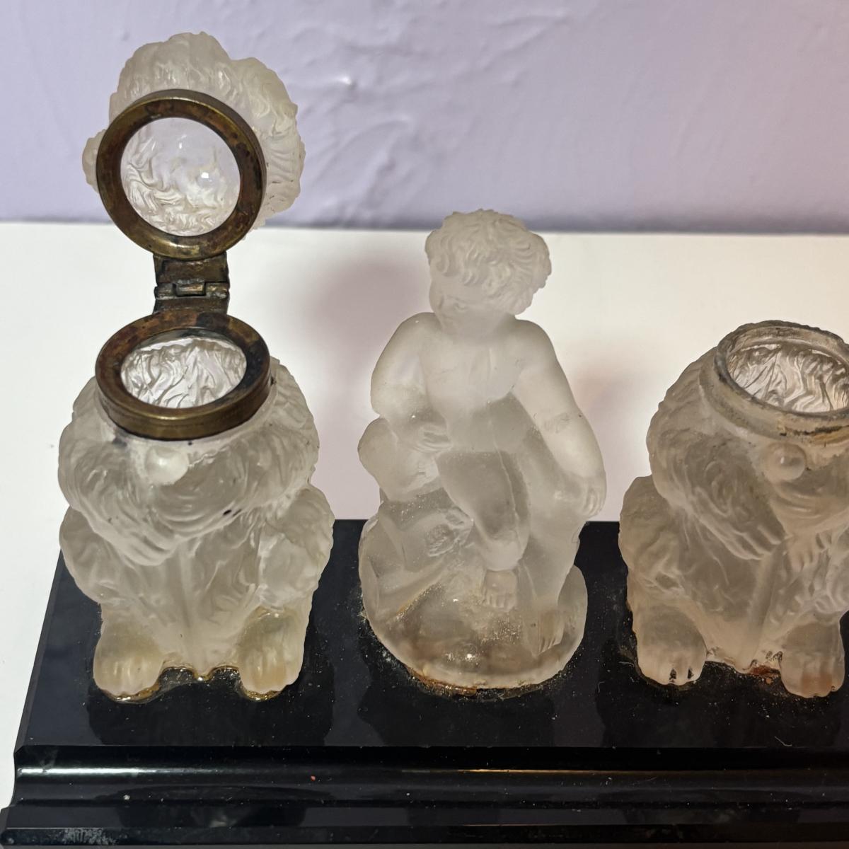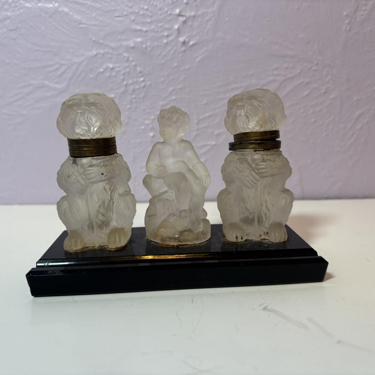 LOT 96: Vintage Cobalt Blue Cut to Clear Glass, Lead Crystal Heart, Frosted Dog Inkwells w/Cherub Mounted on Glass Base, Painted Frosted Glass Perfume Bottle w/Bowl