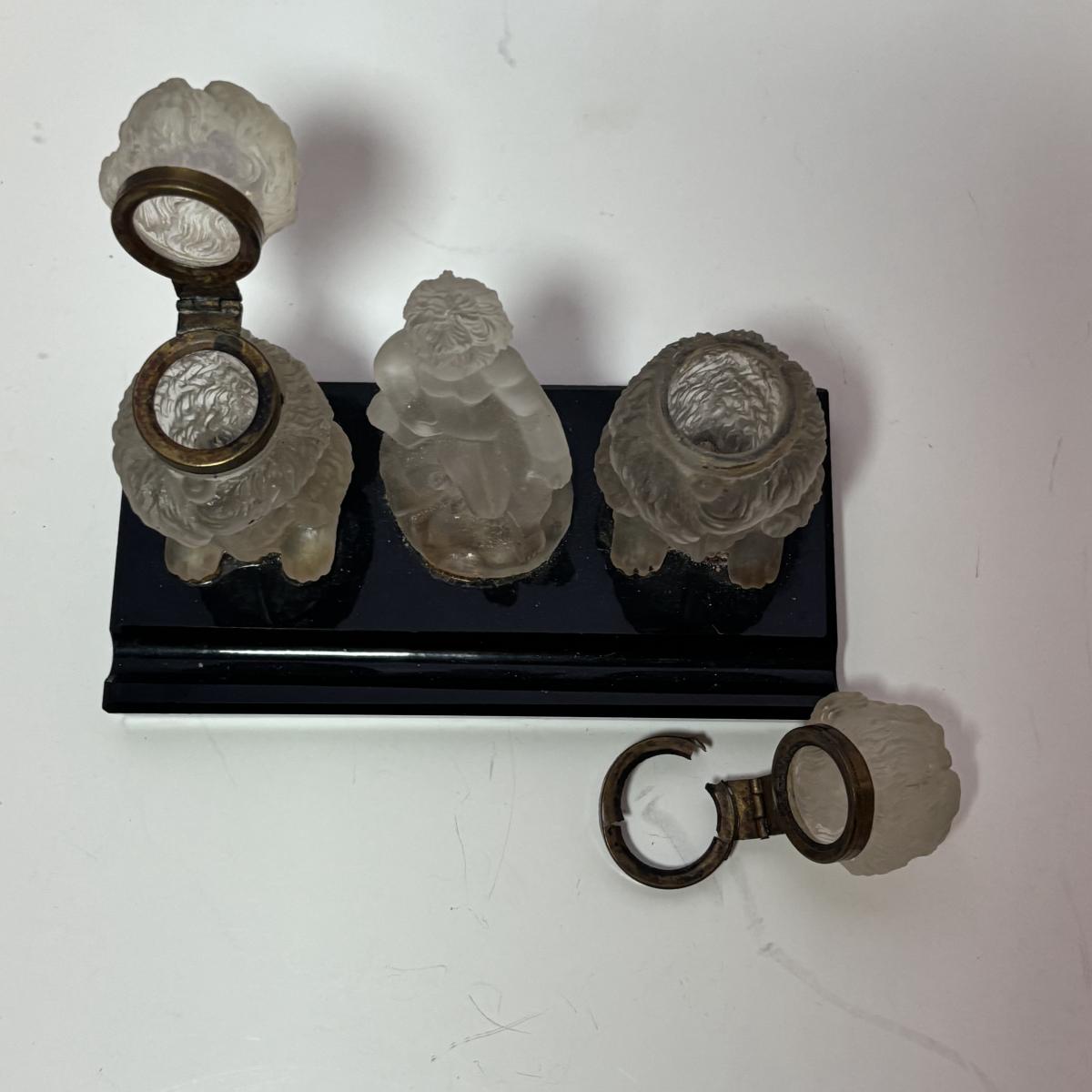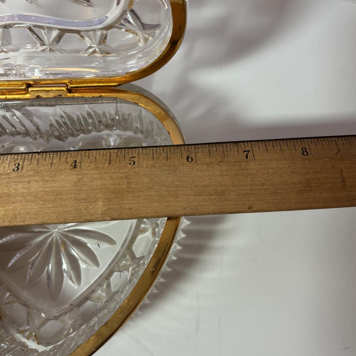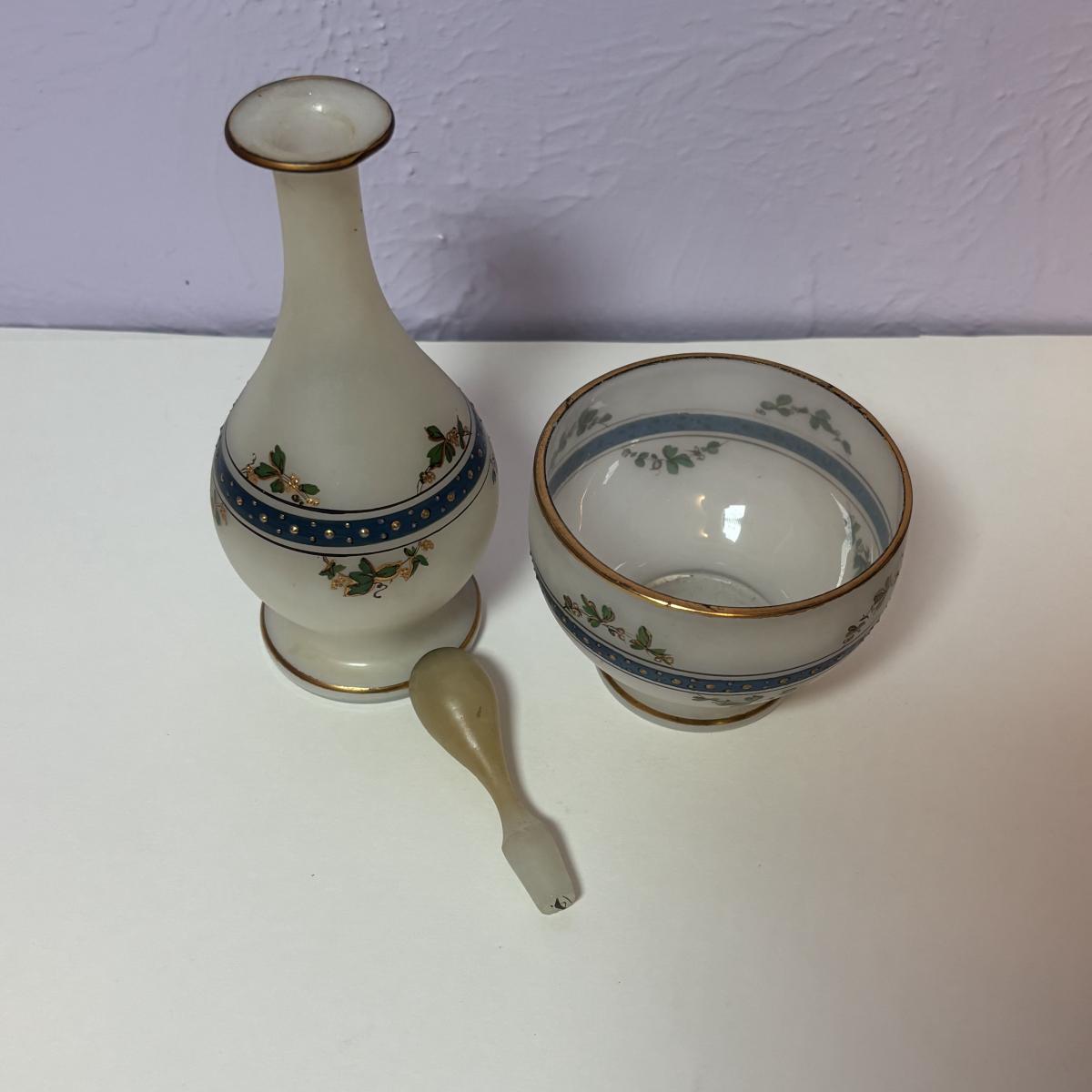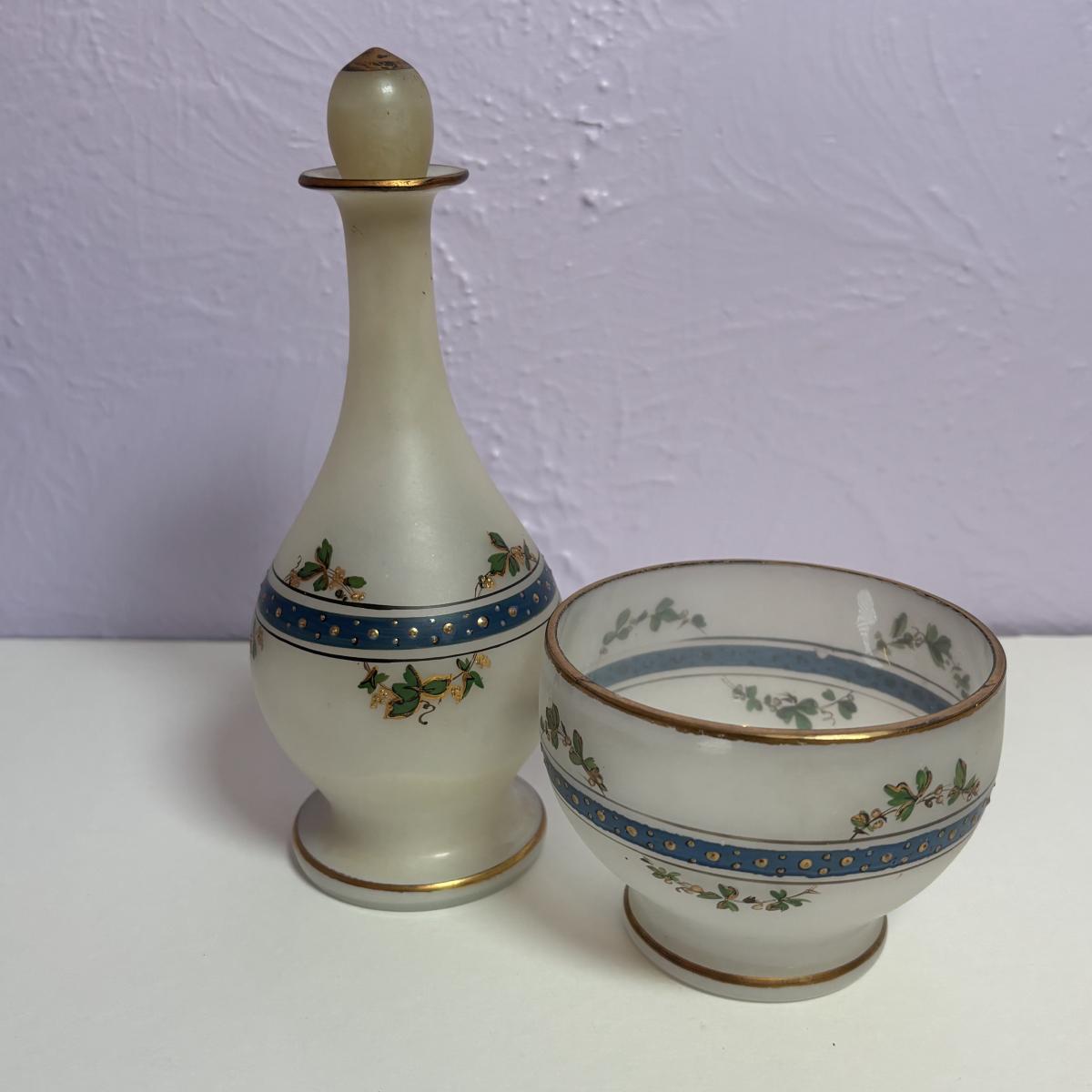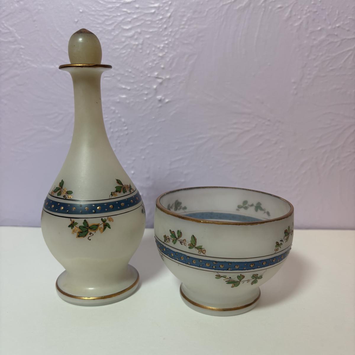 LOT 96: Vintage Cobalt Blue Cut to Clear Glass, Lead Crystal Heart, Frosted Dog Inkwells w/Cherub Mounted on Glass Base, Painted Frosted Glass Perfume Bottle w/Bowl