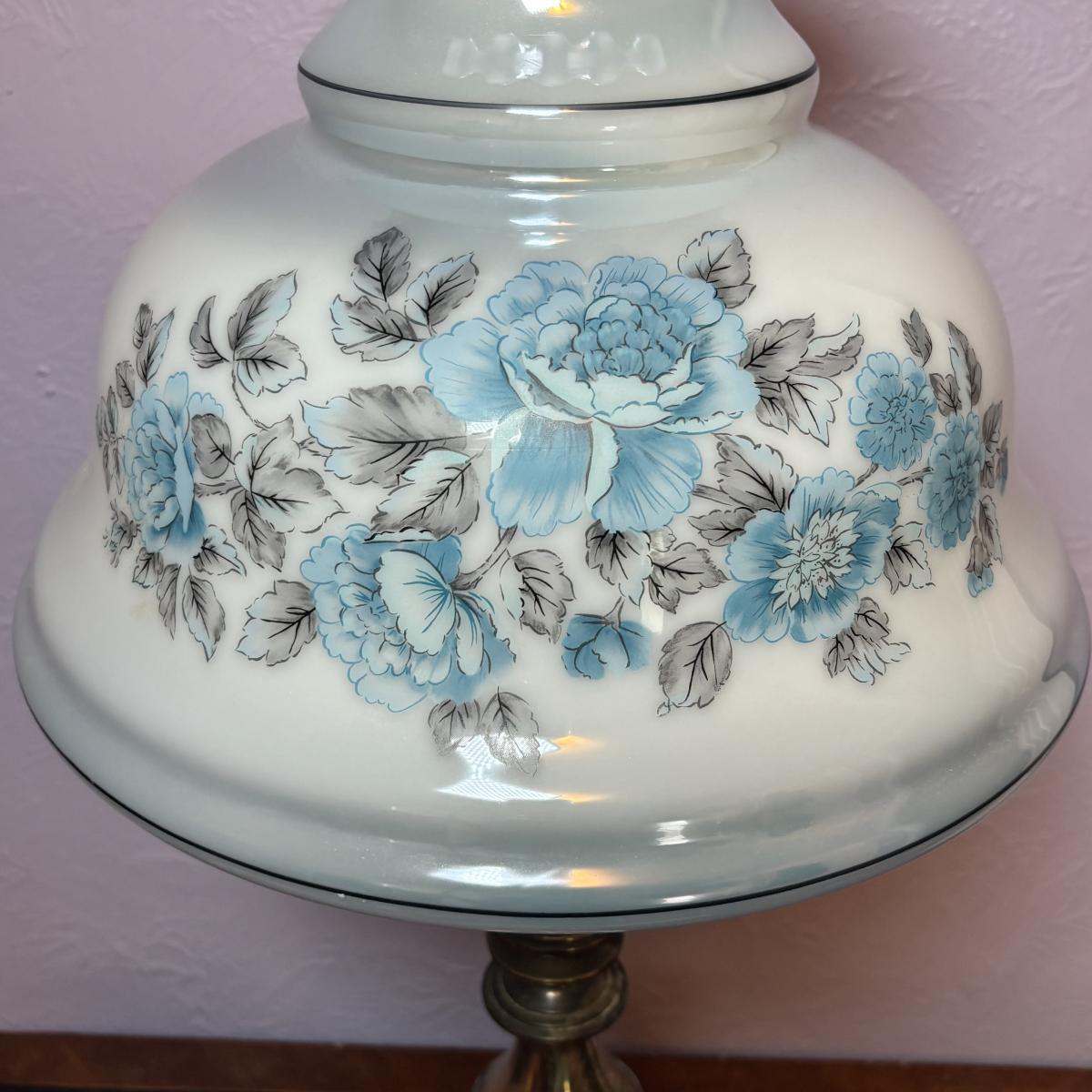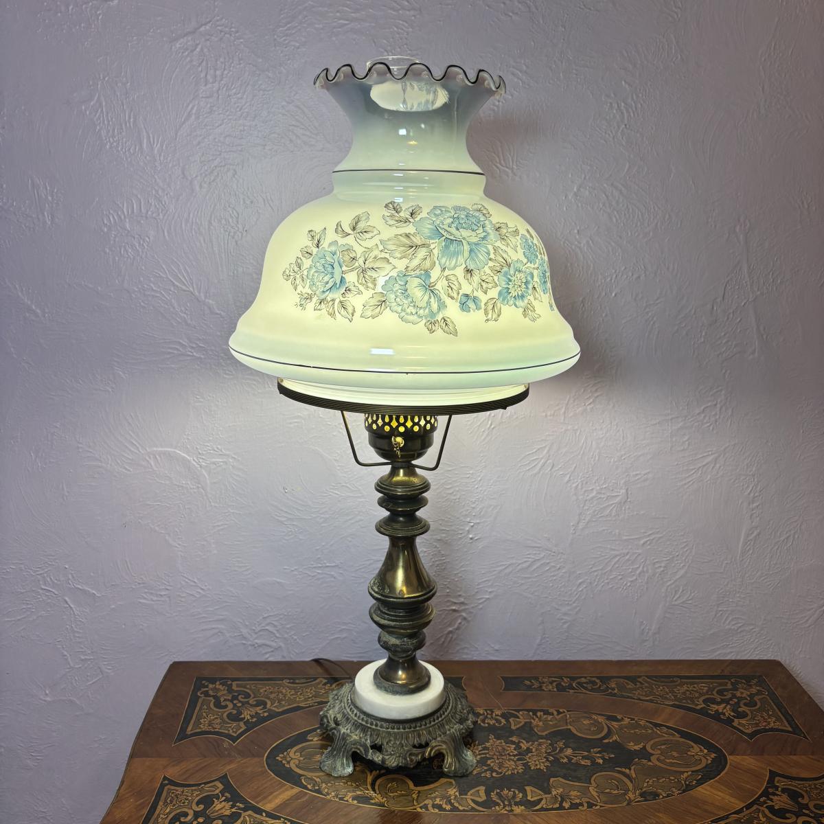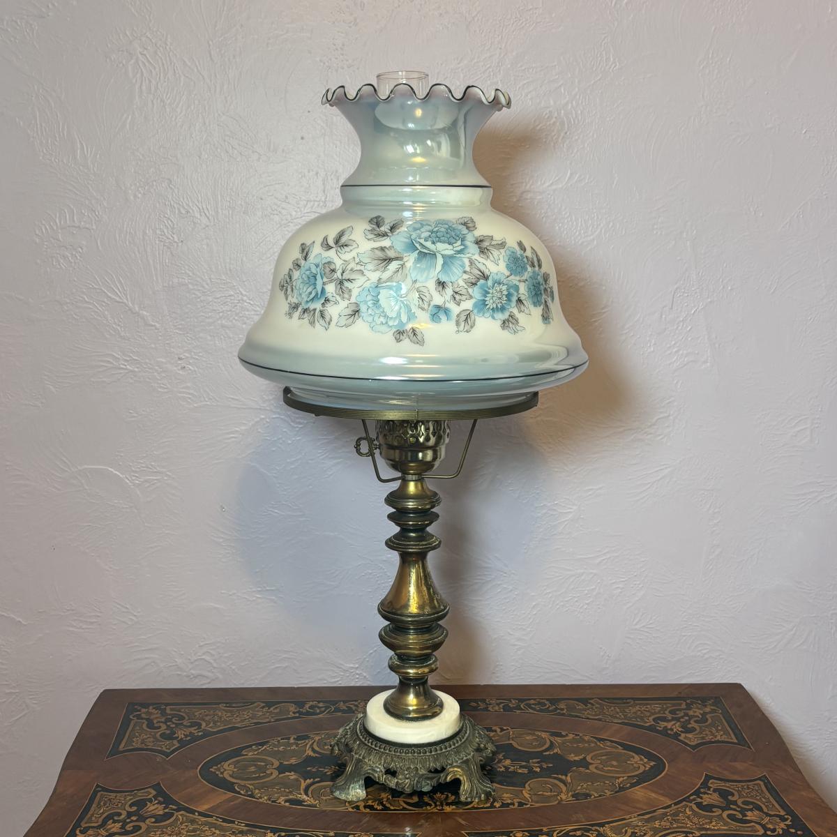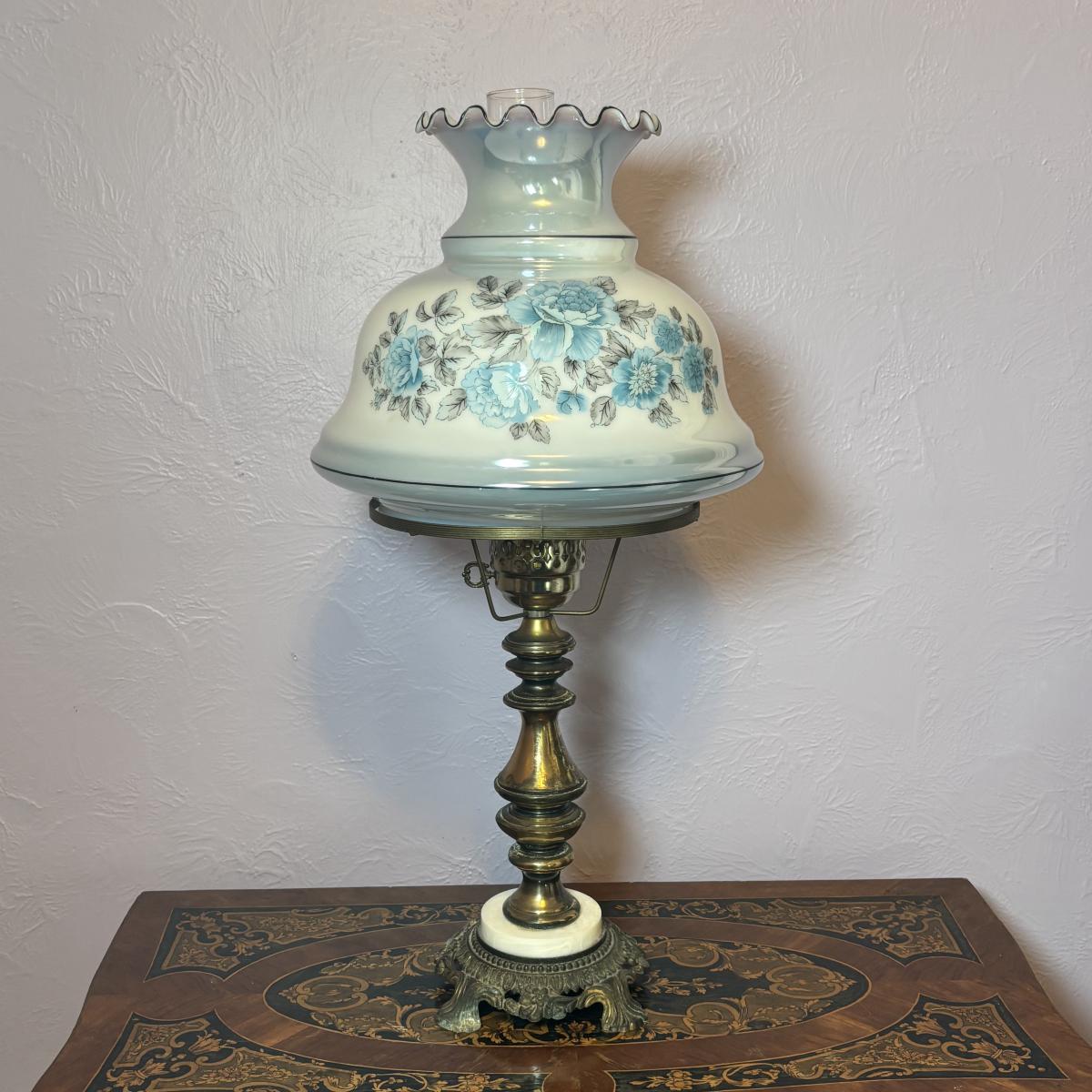 LOT 98: Brass Table Lamp w/Blue Floral Shade and Marble Accent Base