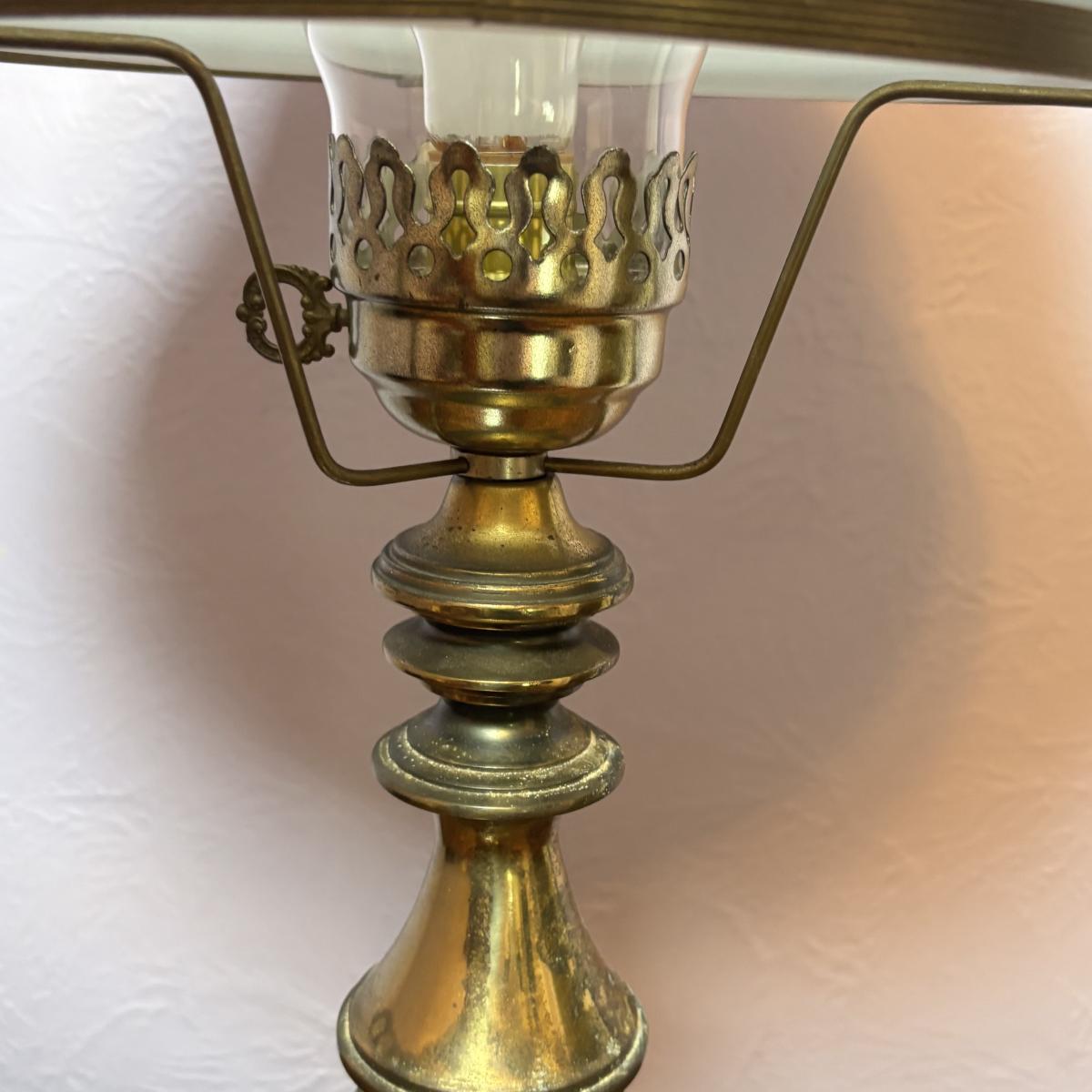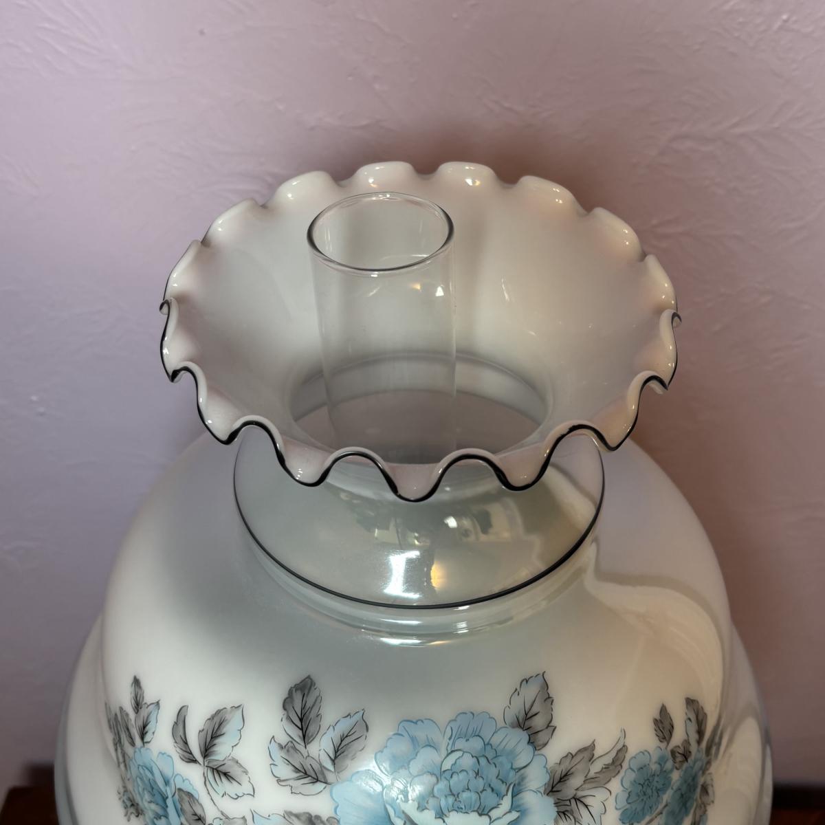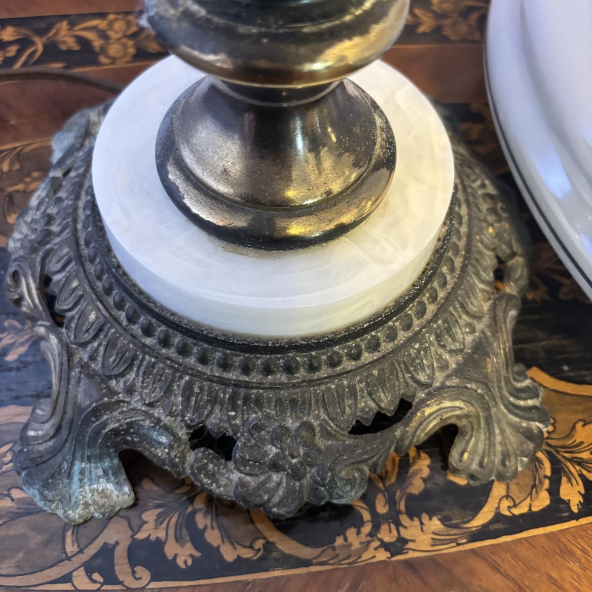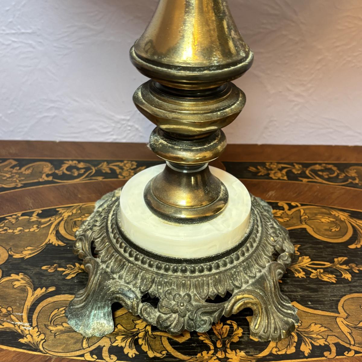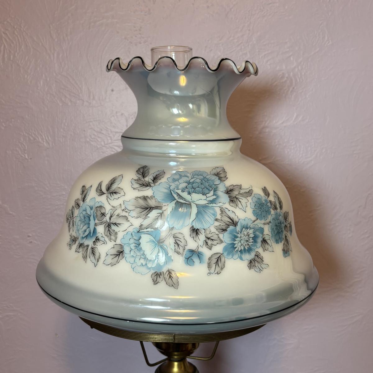 LOT 98: Brass Table Lamp w/Blue Floral Shade and Marble Accent Base