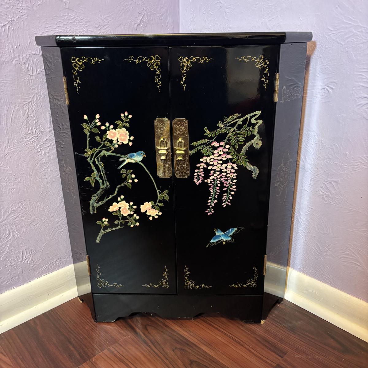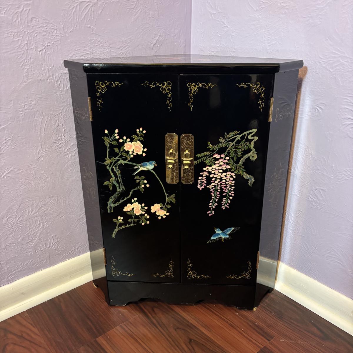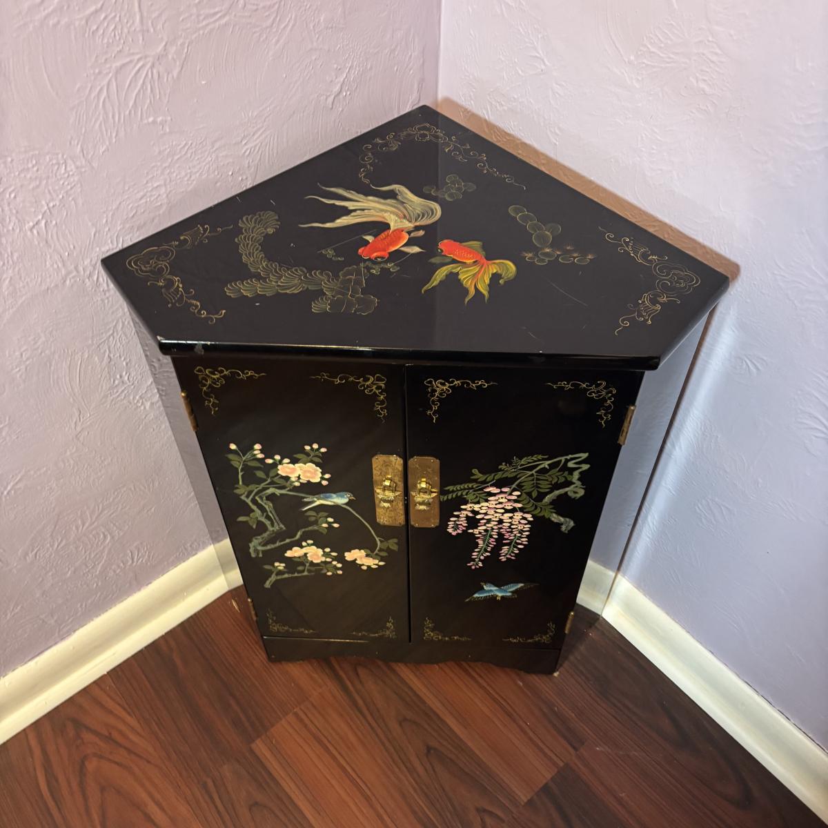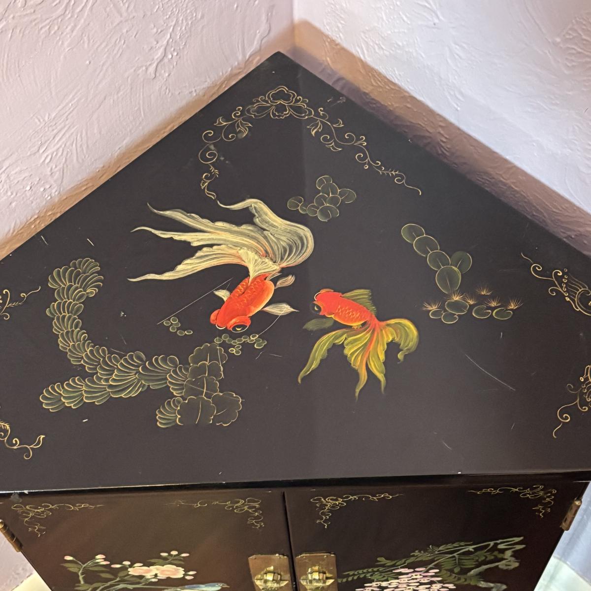 LOT 102: Black Lacquer Corner Cabinet w/Painted Goldfish, Flowers & Birds