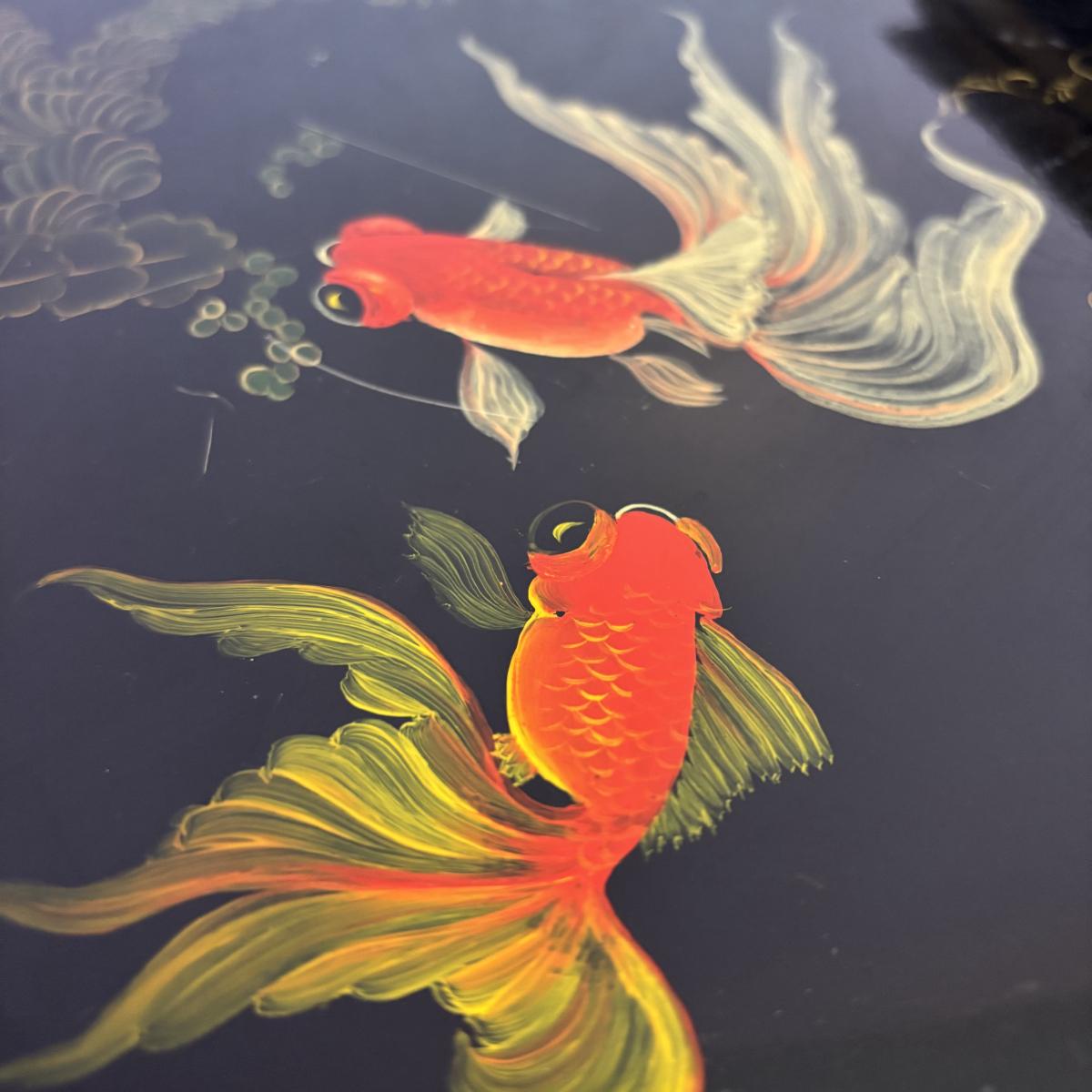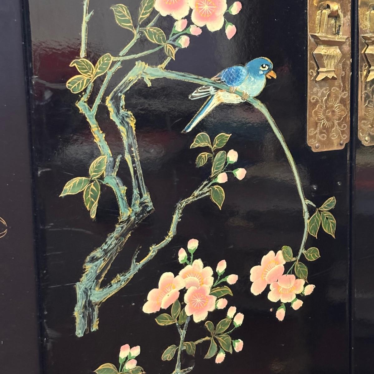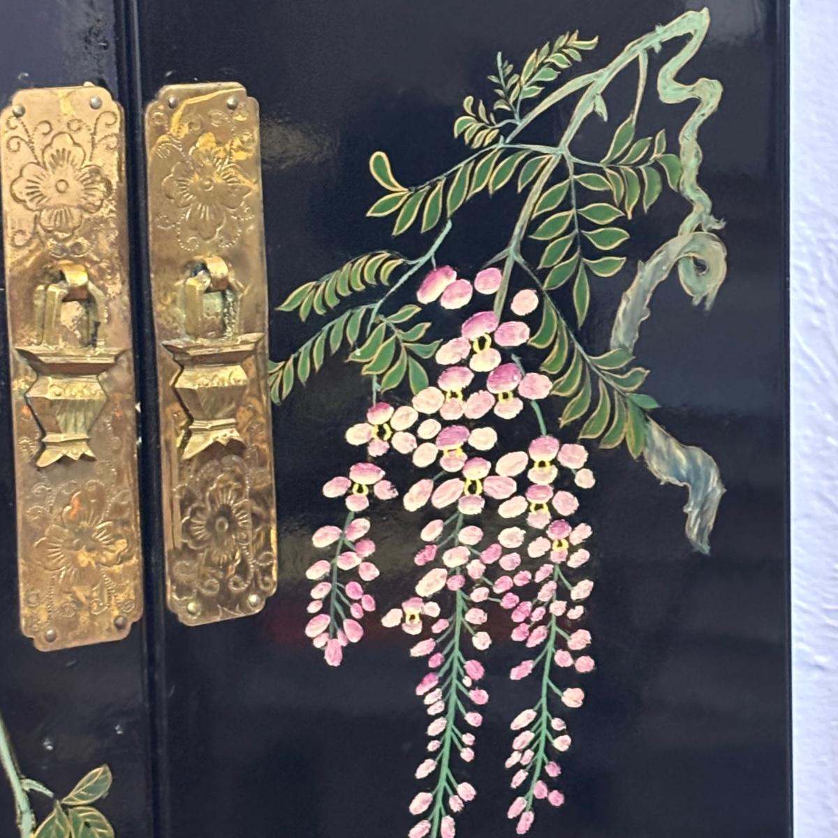 LOT 102: Black Lacquer Corner Cabinet w/Painted Goldfish, Flowers & Birds