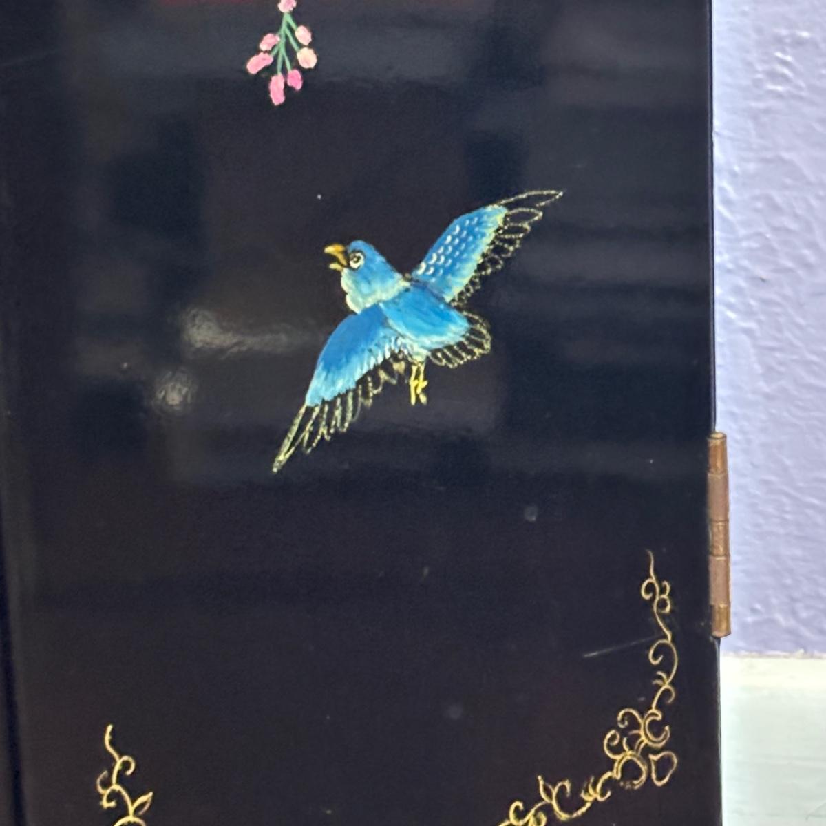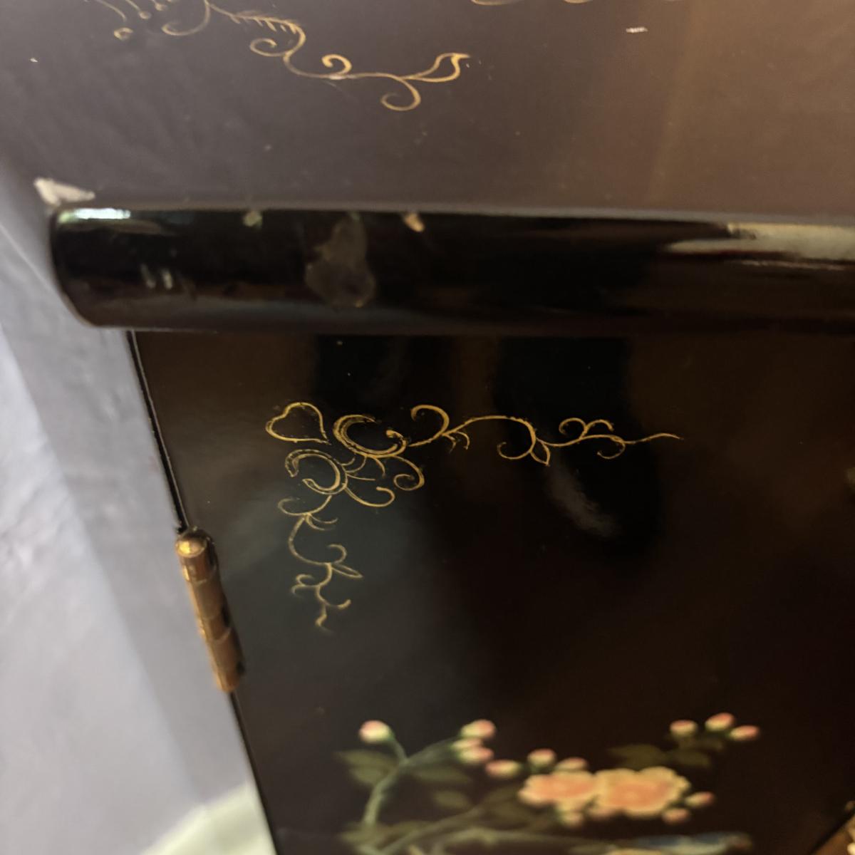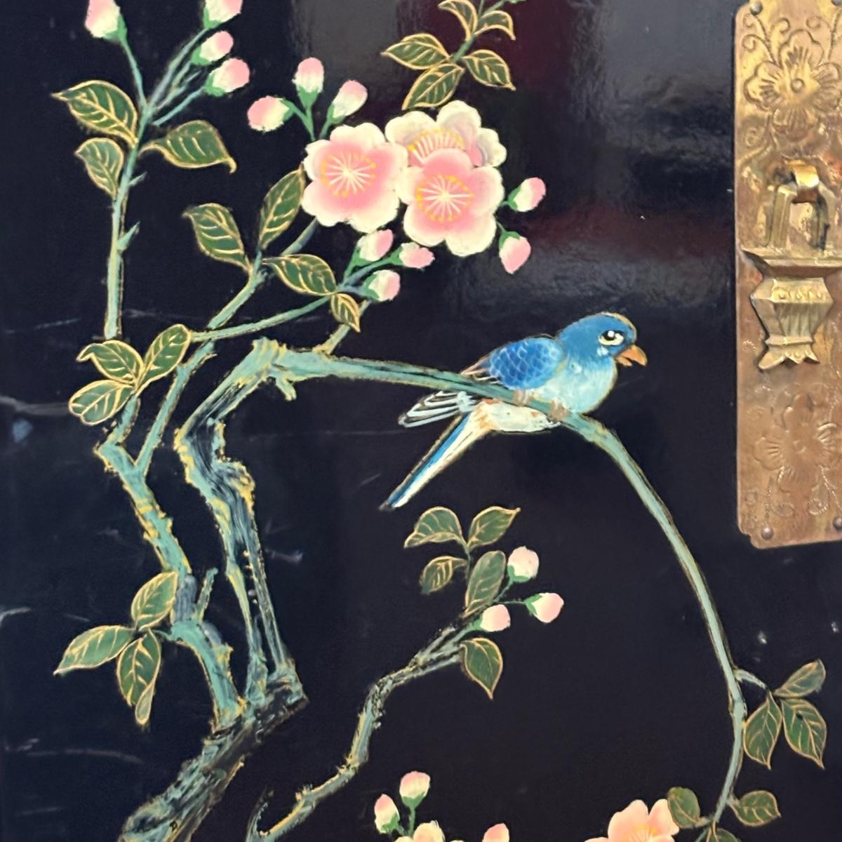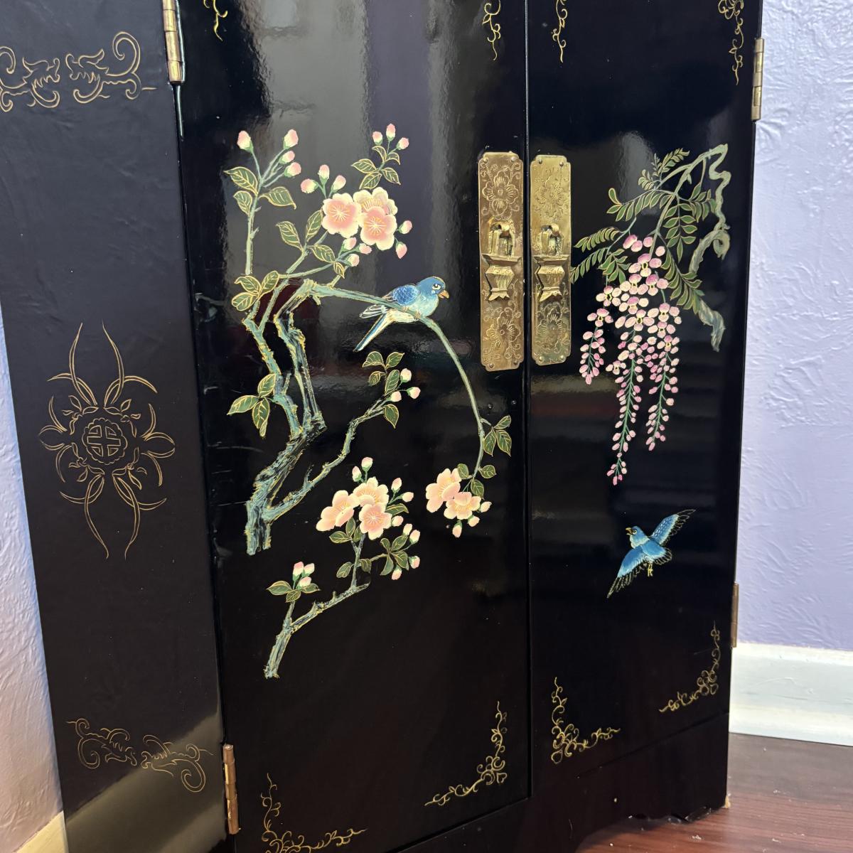 LOT 102: Black Lacquer Corner Cabinet w/Painted Goldfish, Flowers & Birds