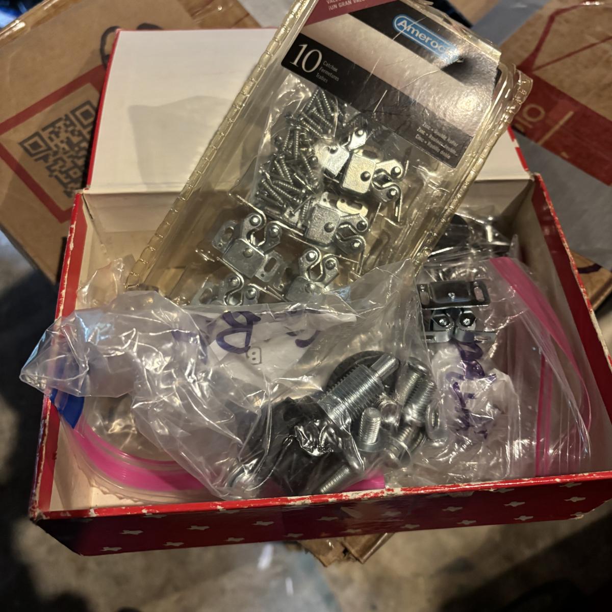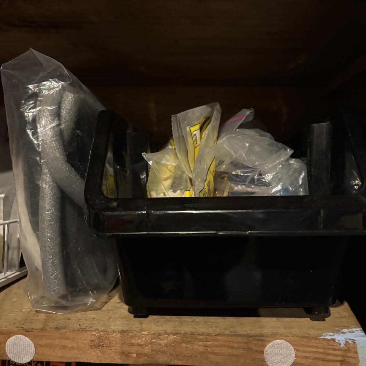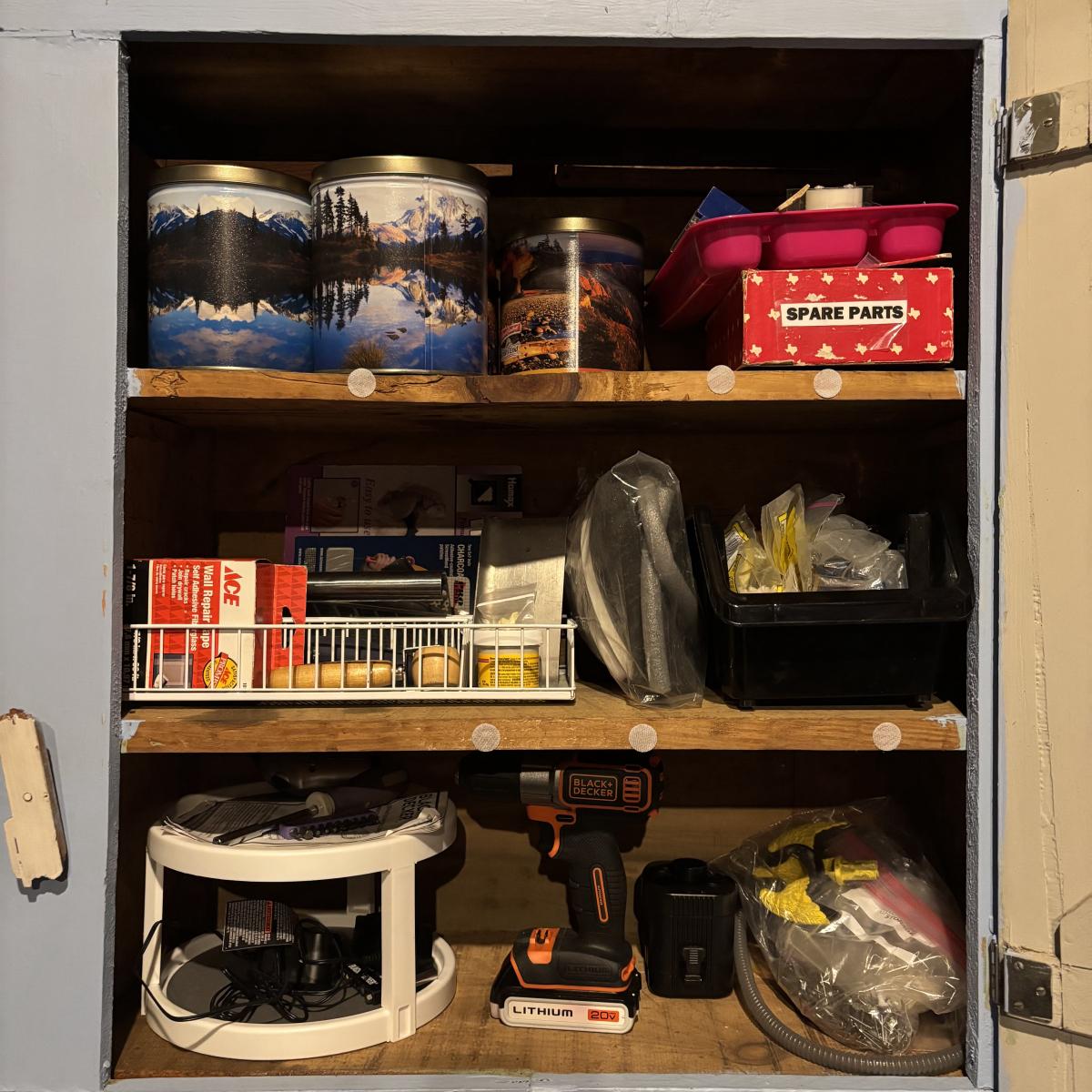 LOT 105: Garage Spare Parts & More Cabinet Cleanout (Cans on top shelf are empty)