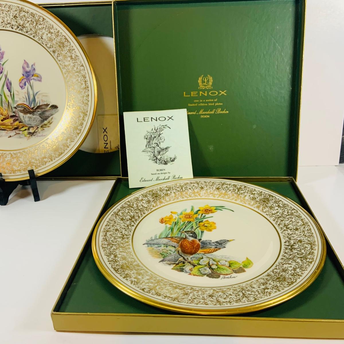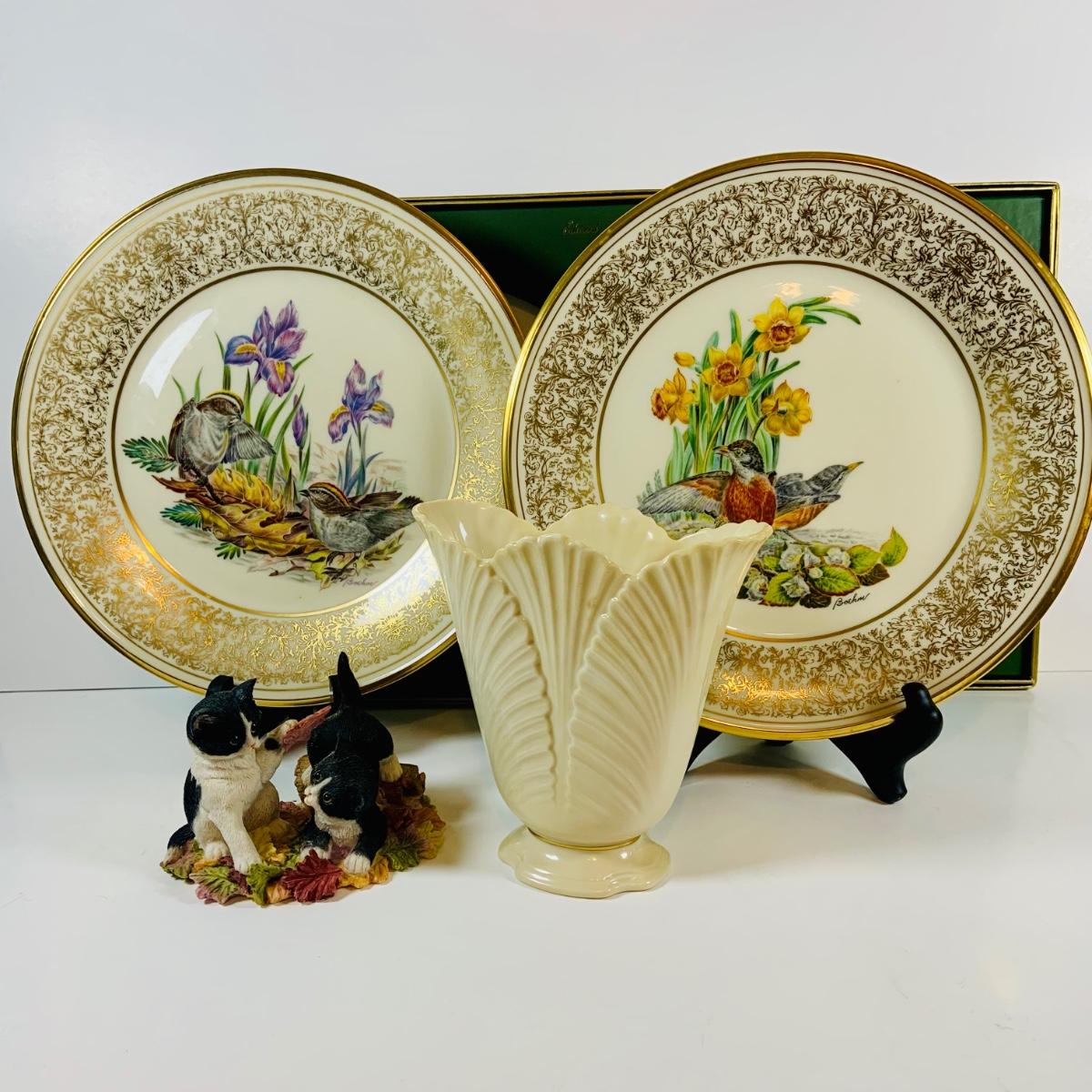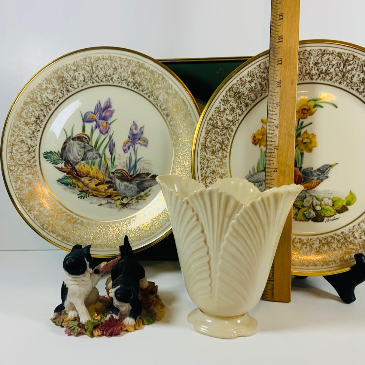 LOT 112: Set of Two (2) Lenox Bird Plates Designed by Edward Marshall Boehm, Lenox Vase and Lenox Cat Figurine