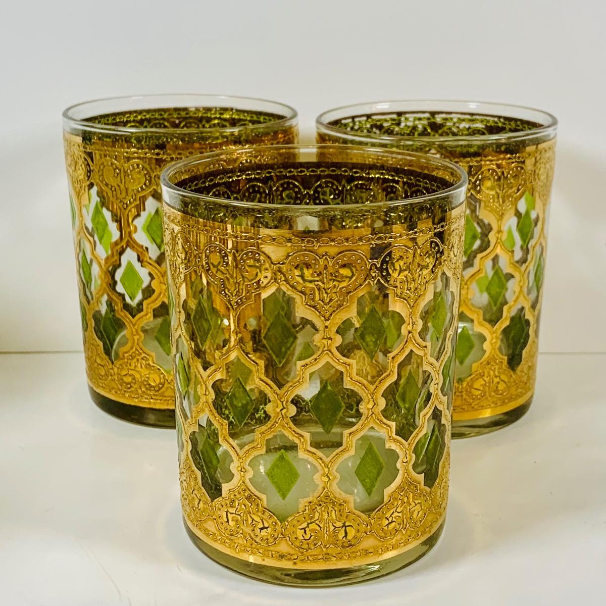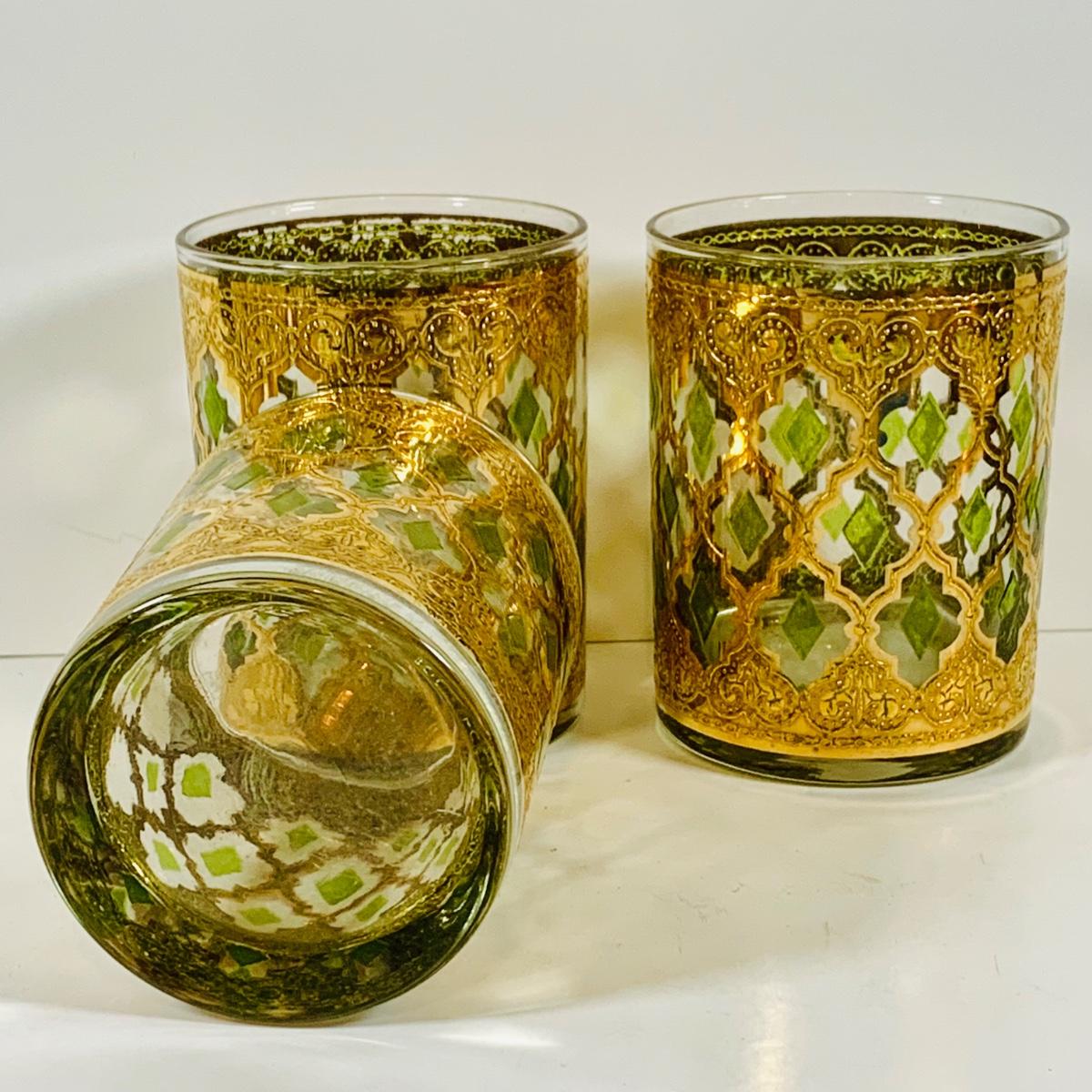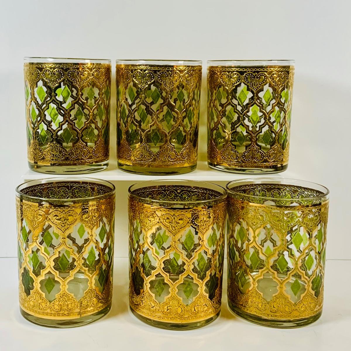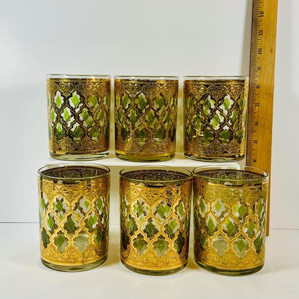 LOT 116: Set of (6) Culver Lowball Glass Tumblers with 22k Gold and Green Valencia Design