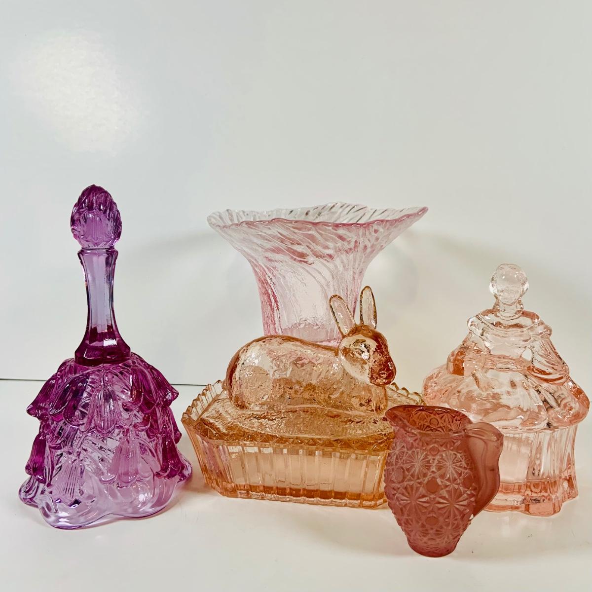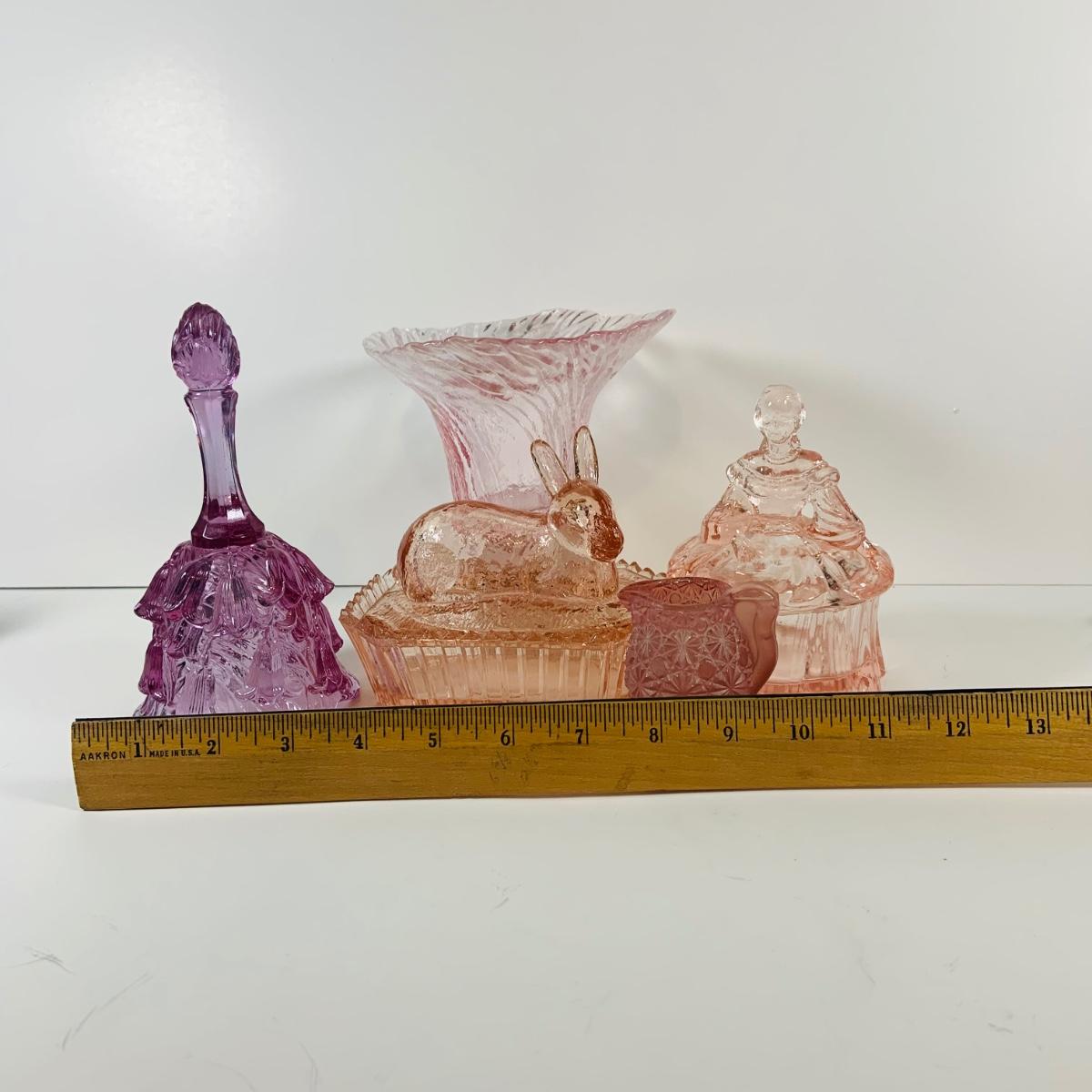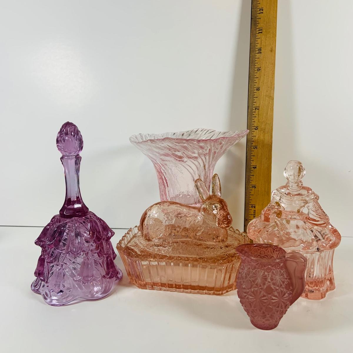 LOT 117: Collection Of Colored Art Glass Pieces Including Fenton Temple Bell, Rabbit on a Nest, Moser Pink Power Jar and More