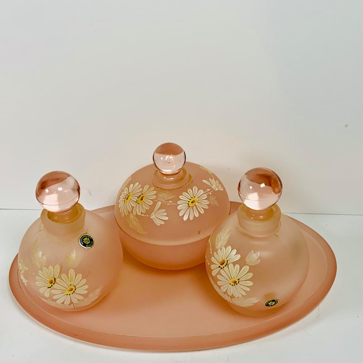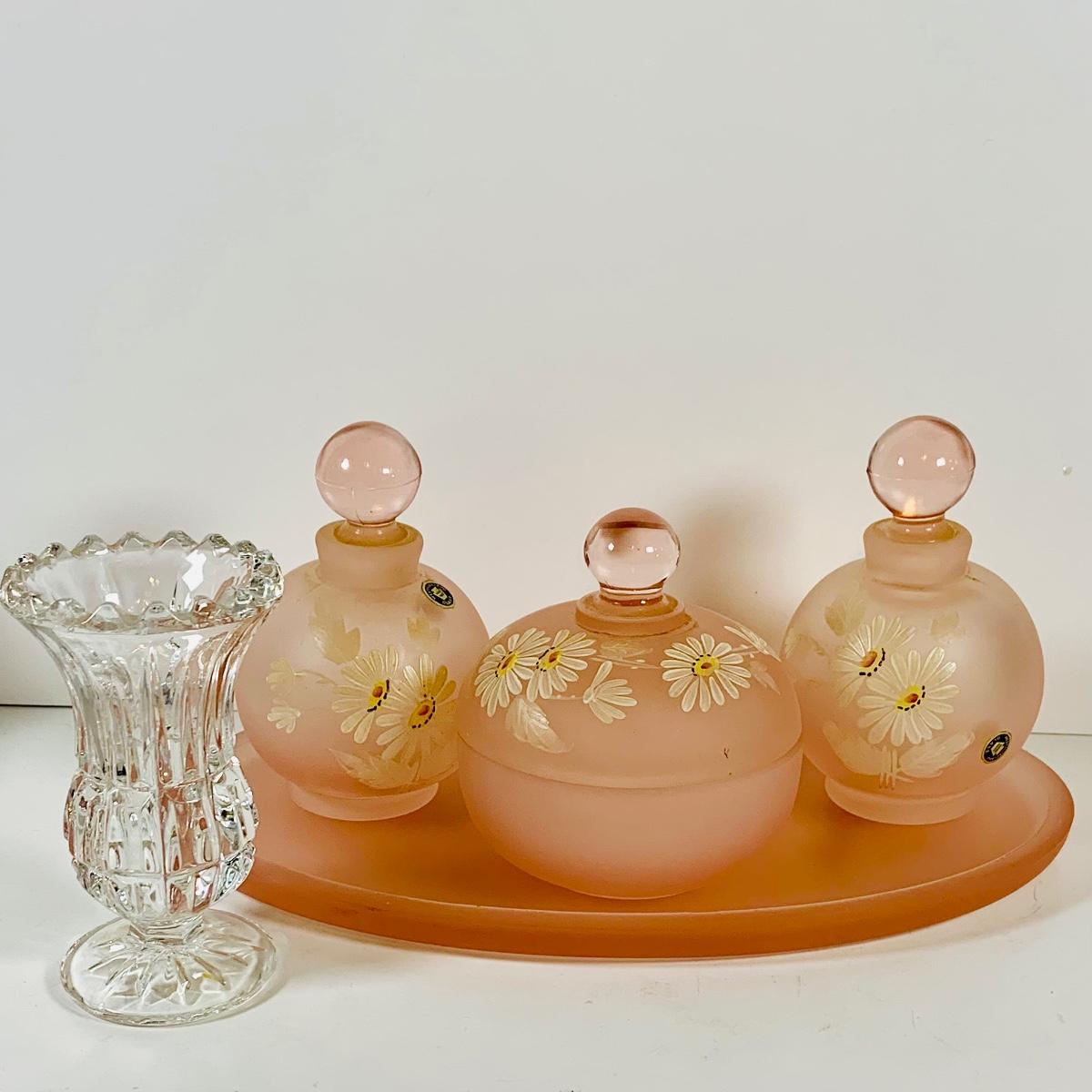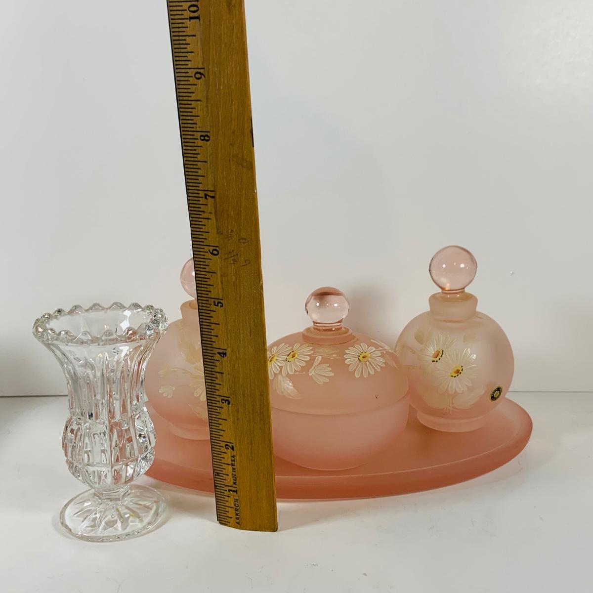 LOT 130: Westmoreland Glass Vanity Set with Tray Includes Two (2) Perfume Bottles and a Power Jar and a Crystal Vase
