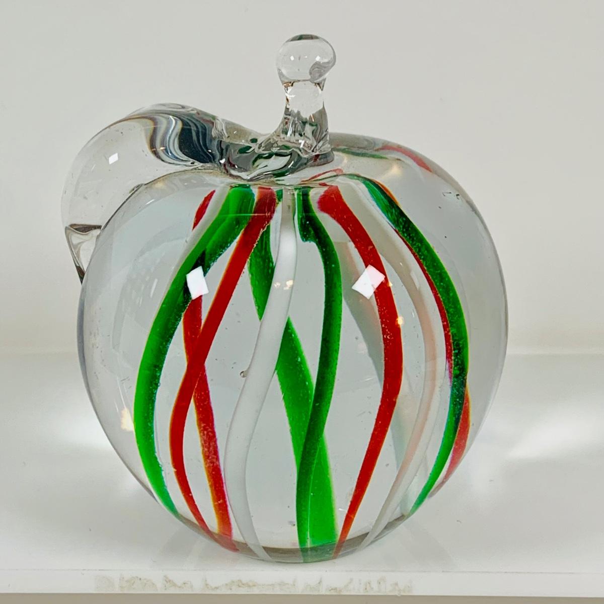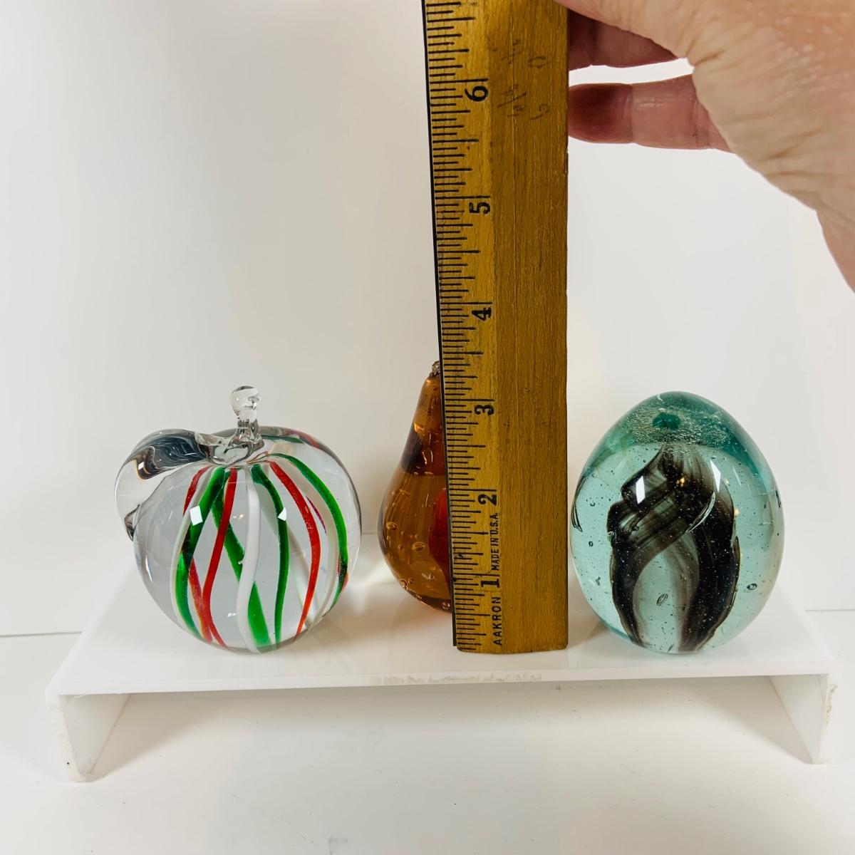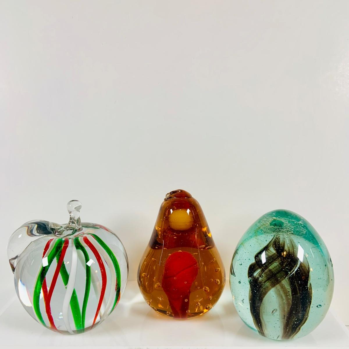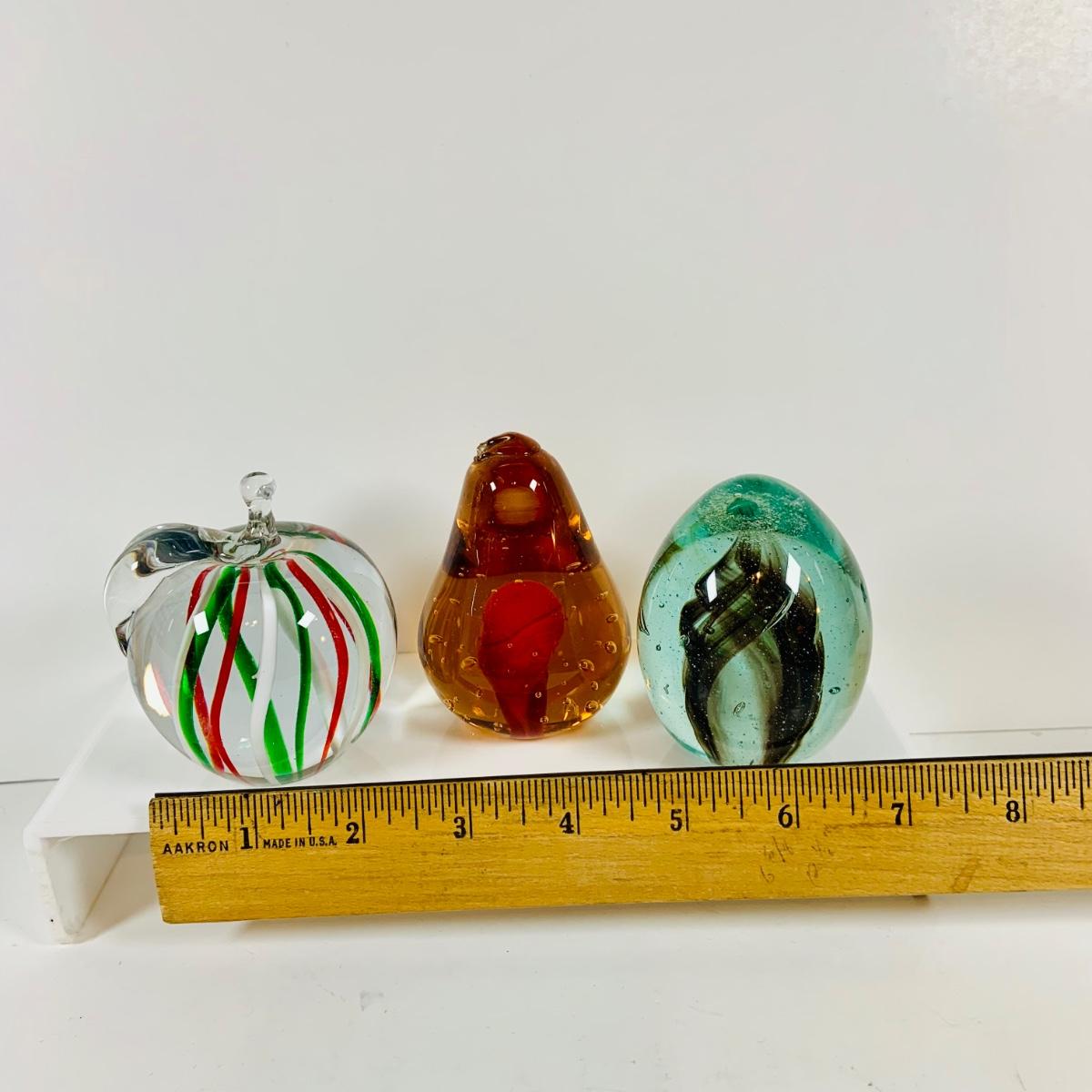 LOT 134: Set of Three (3) Art Glass Paperweights - Red and Green Apple, a Pear and Egg