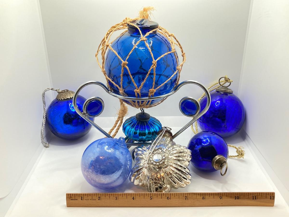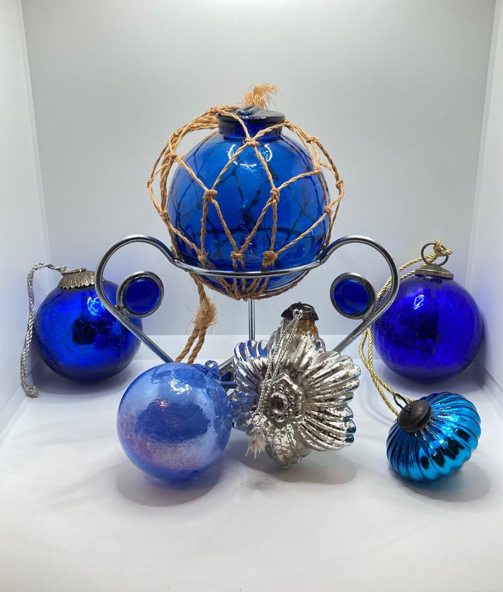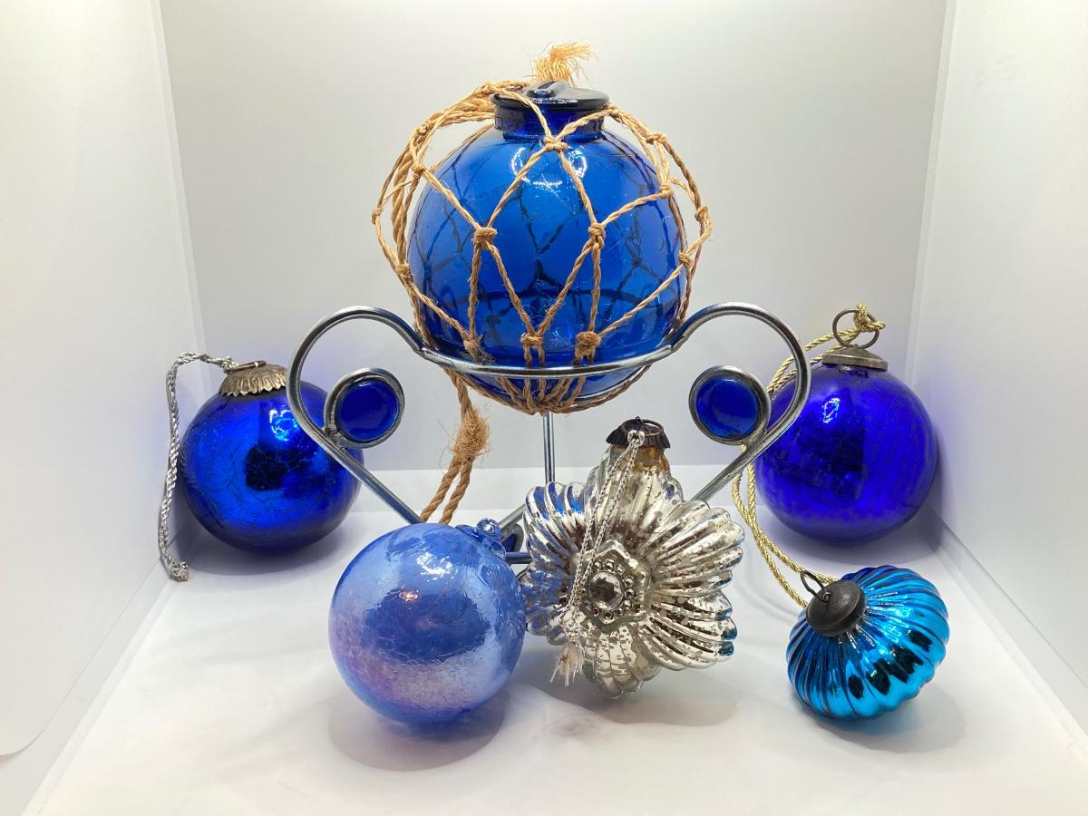 LOT 177: Vintage Blue Themed Art Glass Ornaments and More