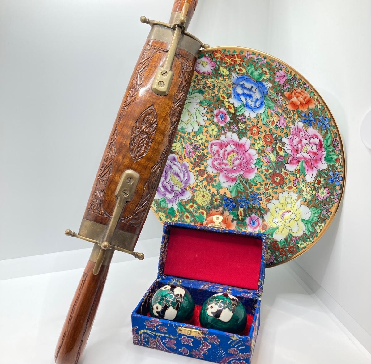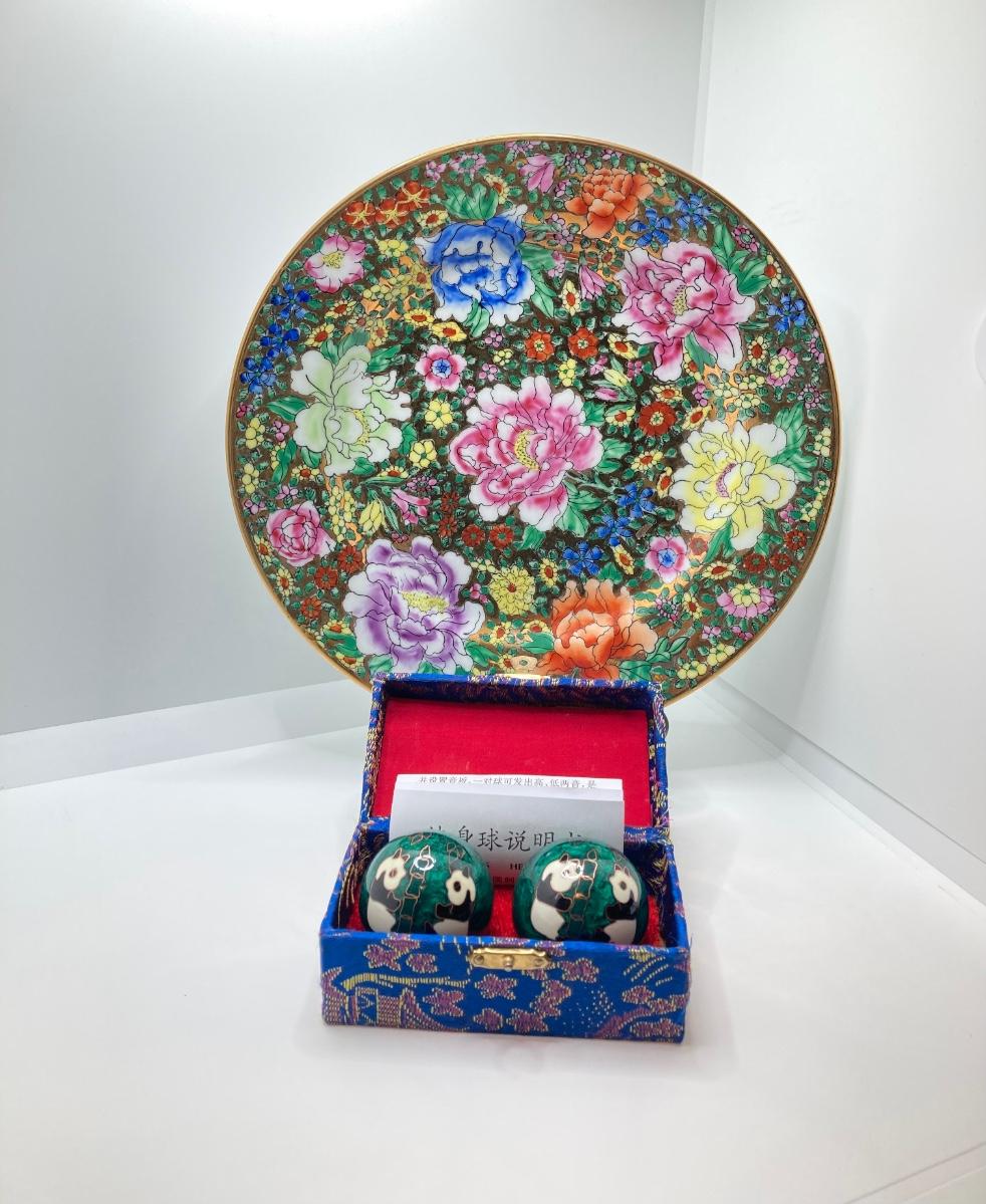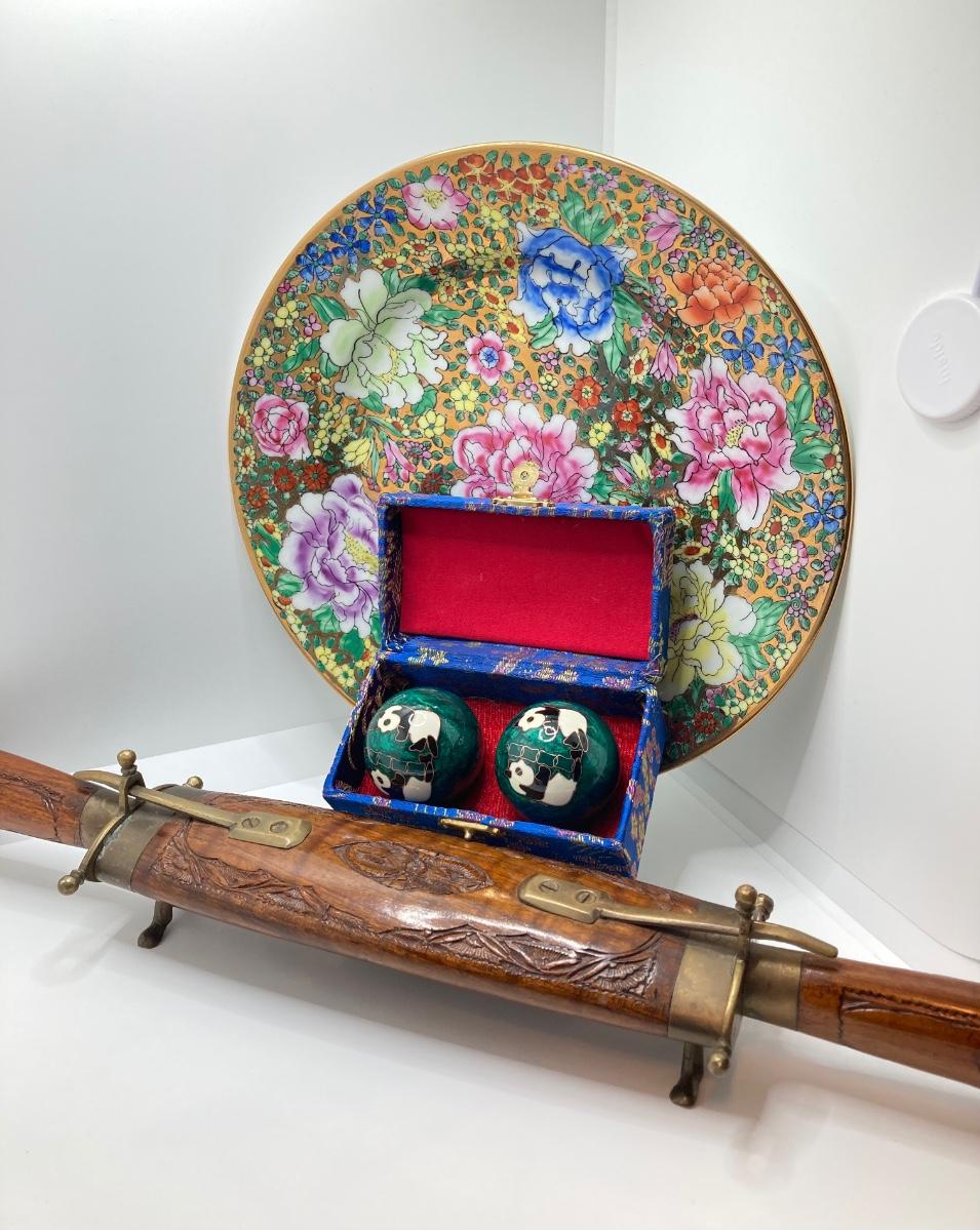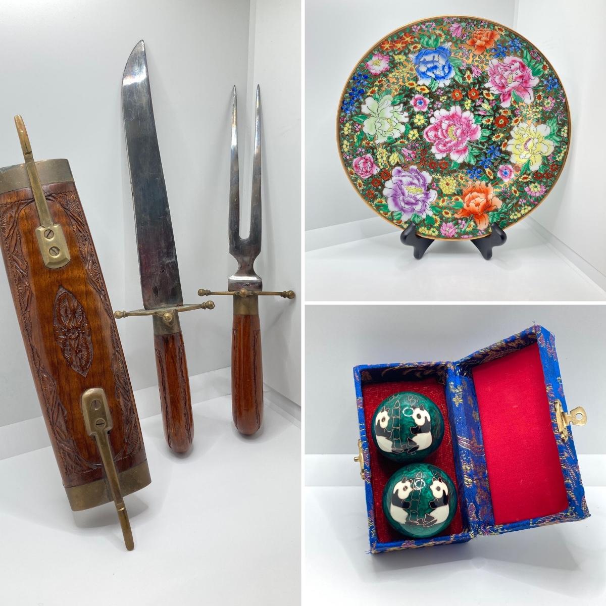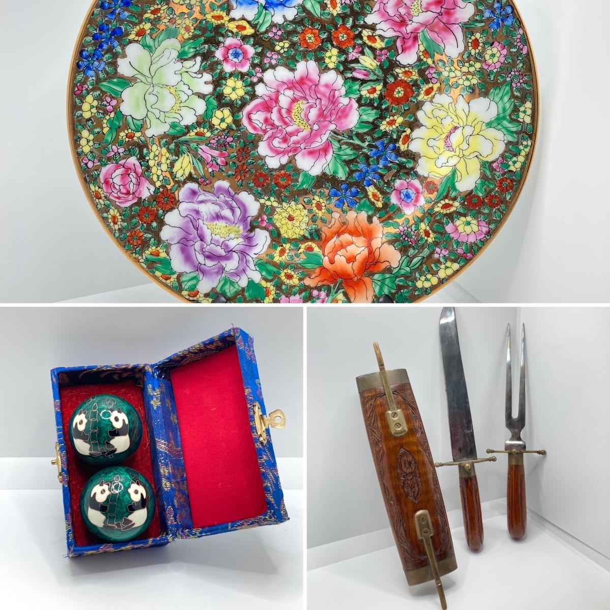 LOT 187: Knife and Fork Carving Set (India), Baoding Health Balls and Decorative Plate