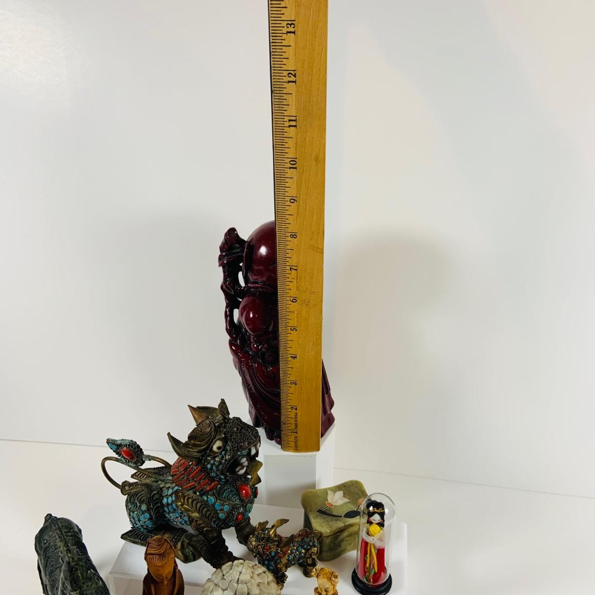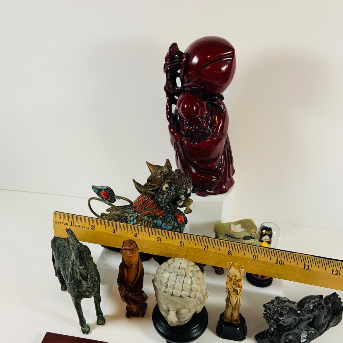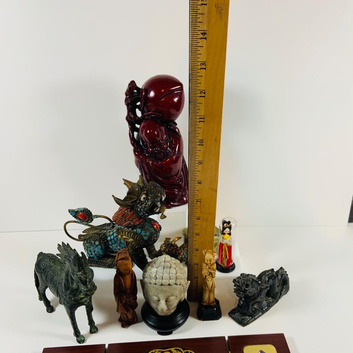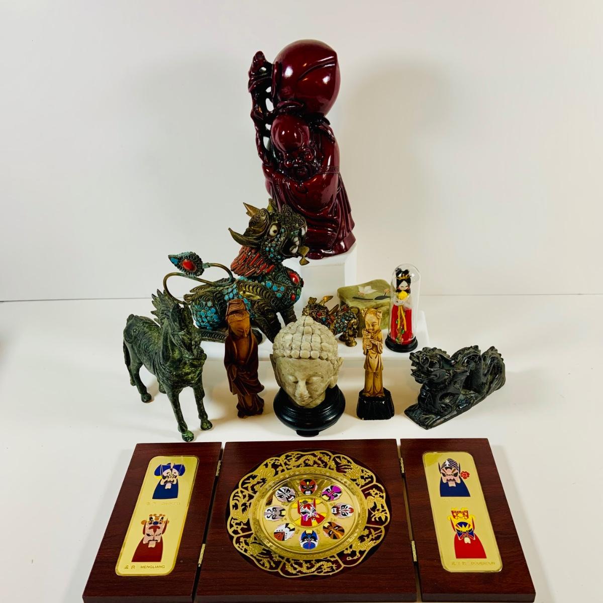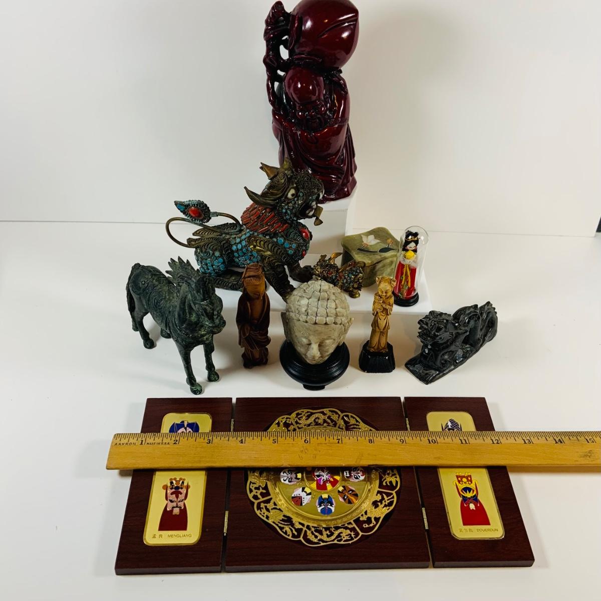 LOT 197: Asia Inspired Collection Including Peking Opera Facial Make-up Plaque, Wooden Figures, Miniture Doll. Buddha's, Dragons and More