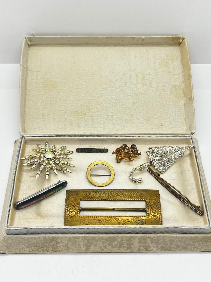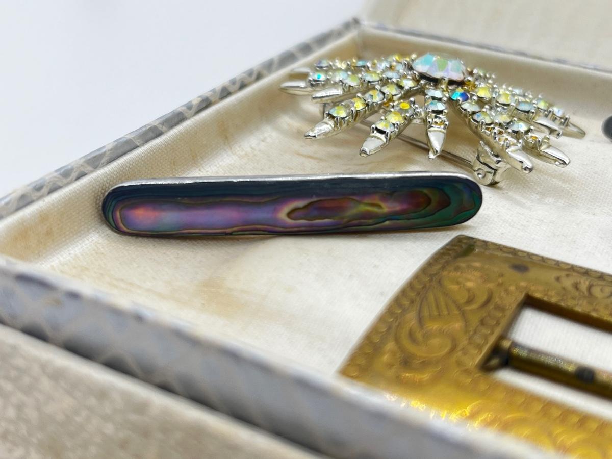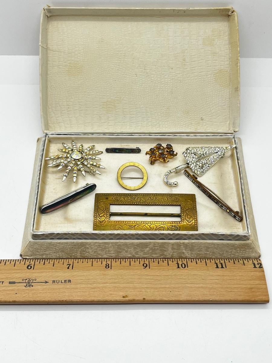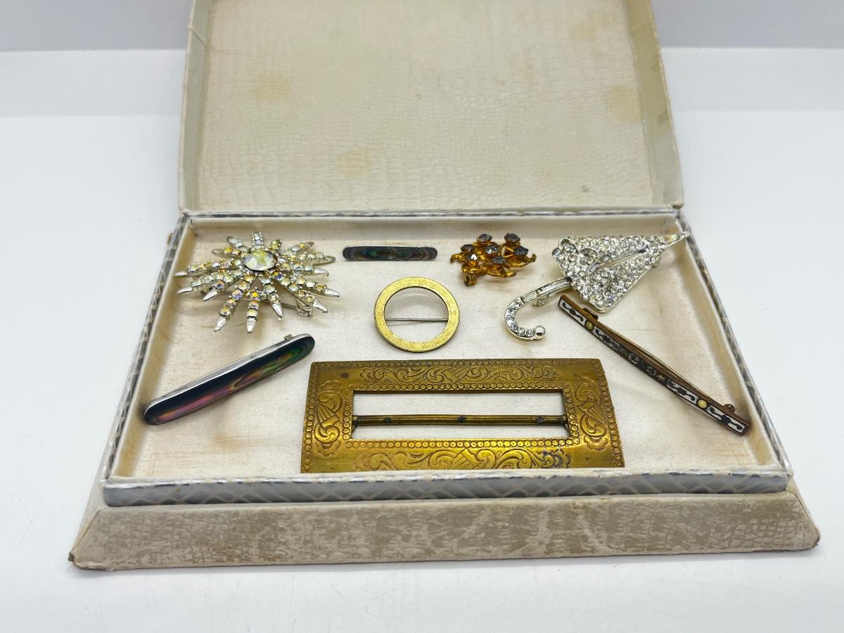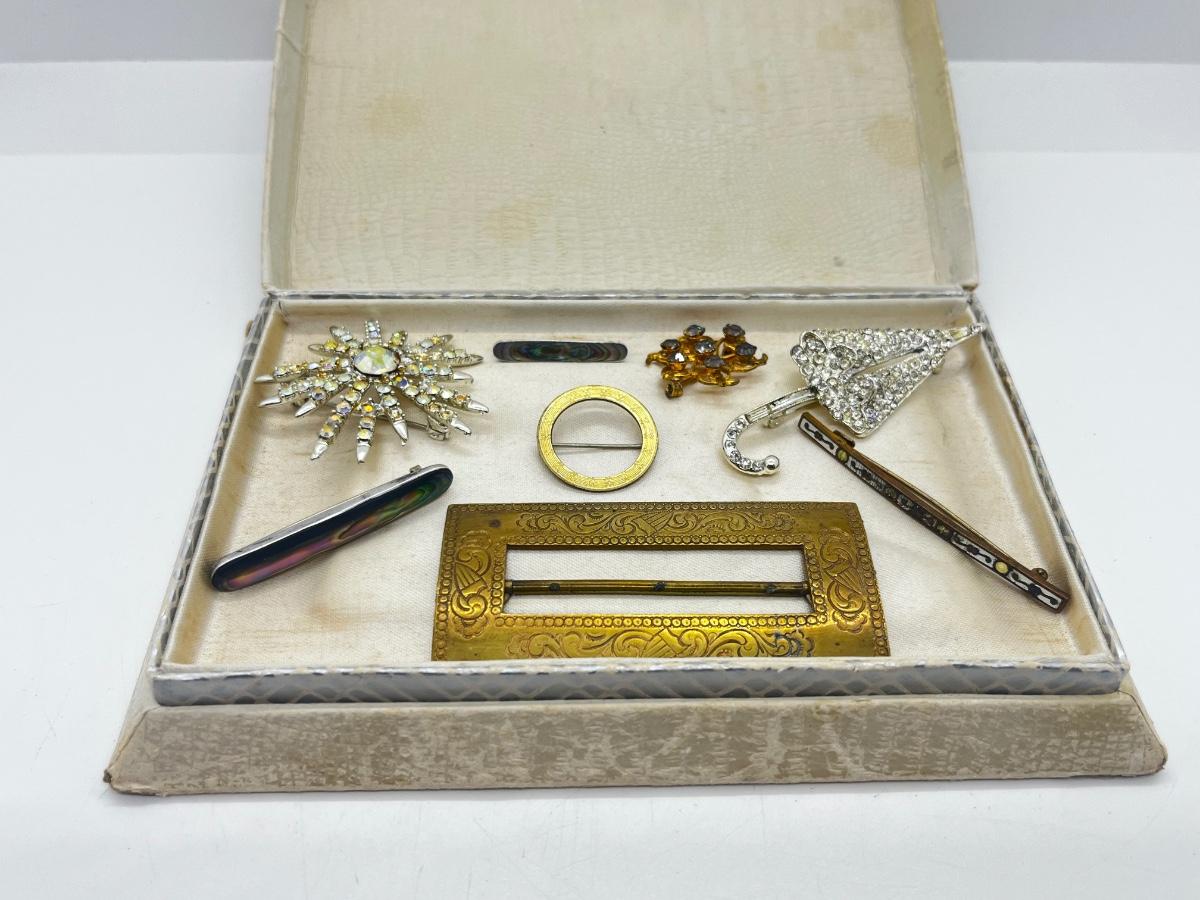 LOT 205J: Antique Brass Buckle, Sterling and Abalone Bar Pin, Enamel and Brass Bar Pin and More!