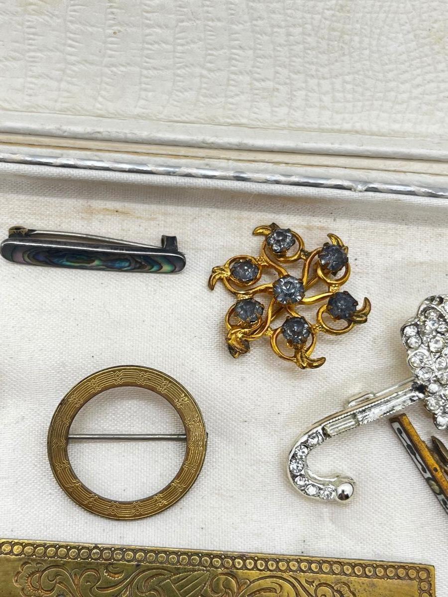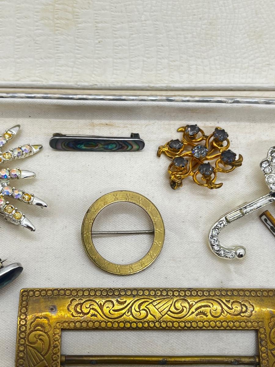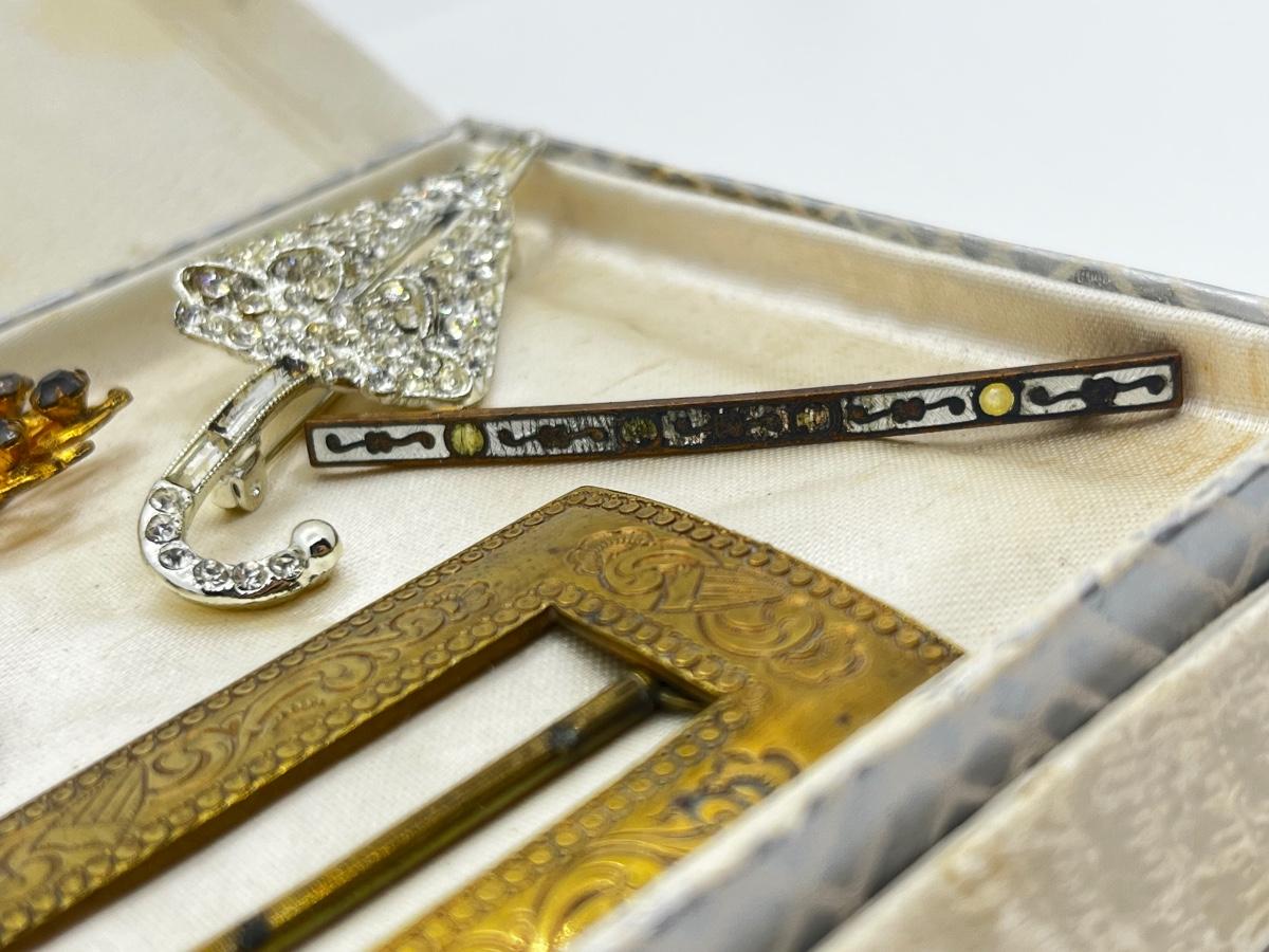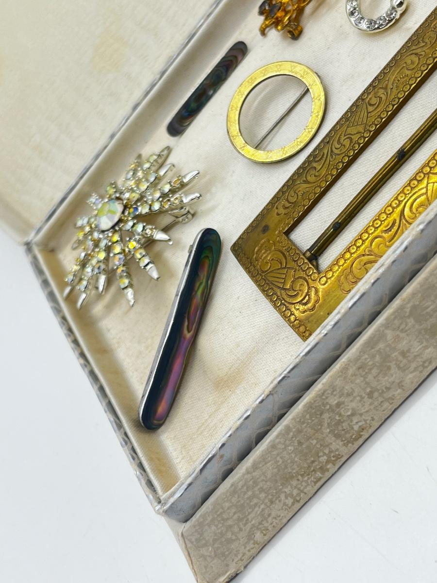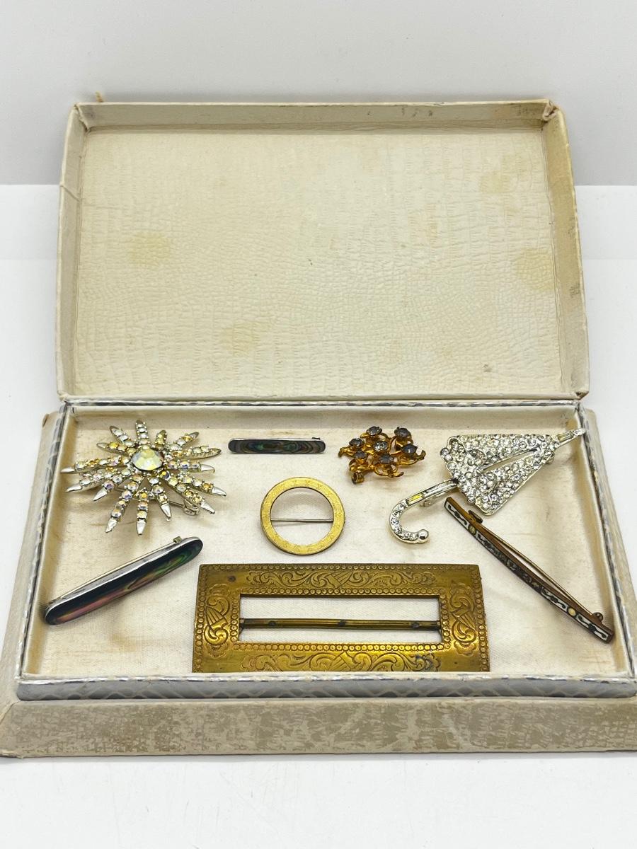 LOT 205J: Antique Brass Buckle, Sterling and Abalone Bar Pin, Enamel and Brass Bar Pin and More!