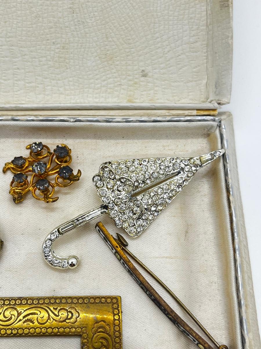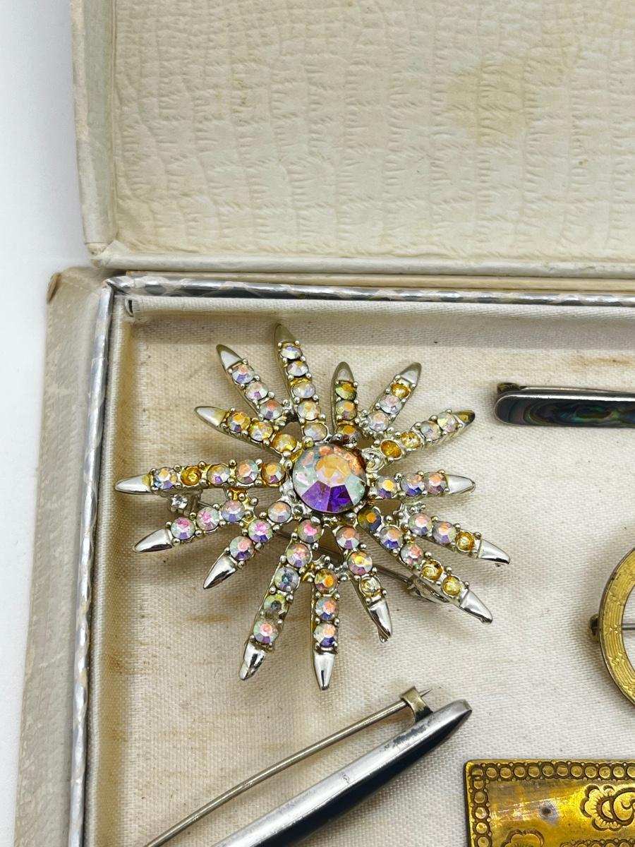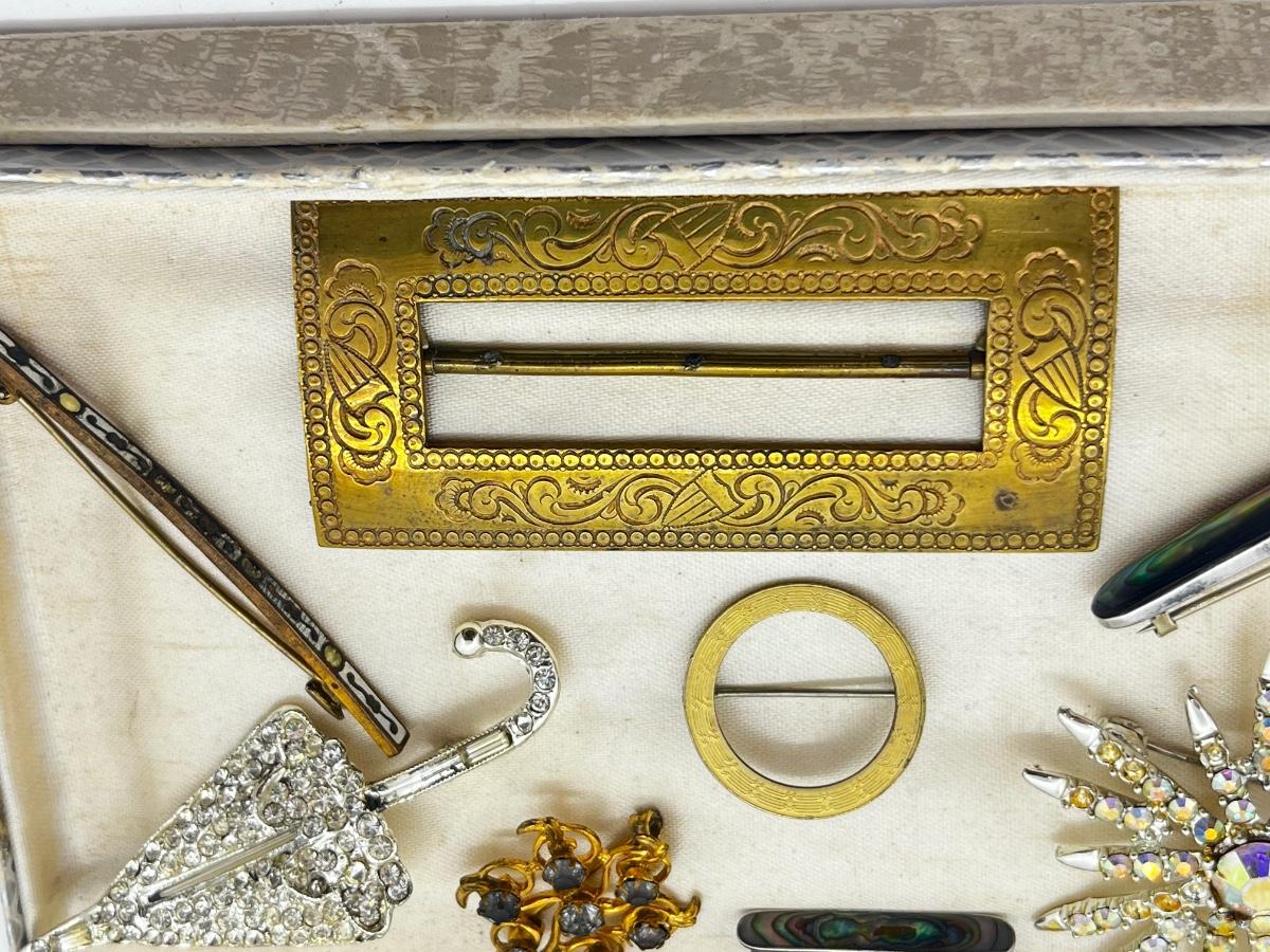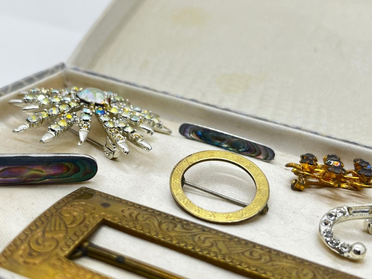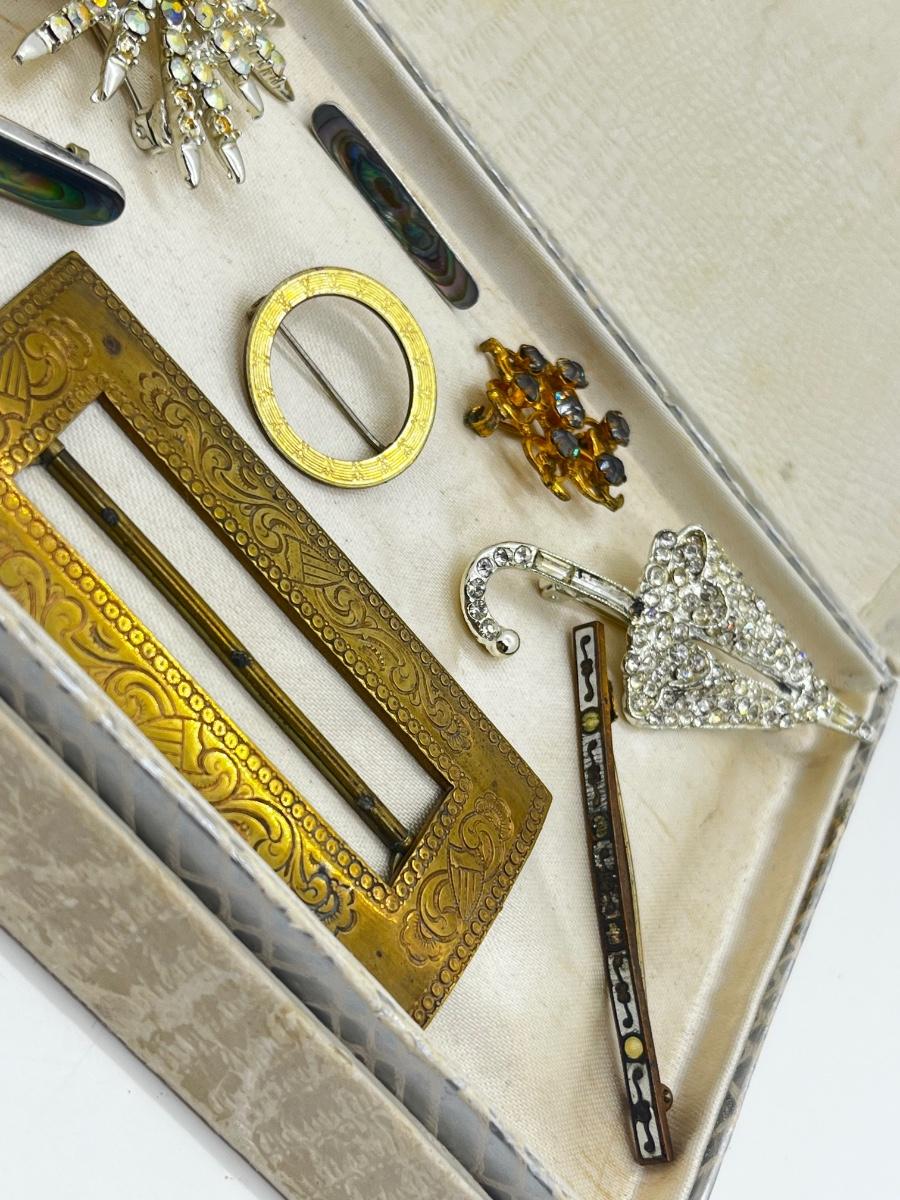 LOT 205J: Antique Brass Buckle, Sterling and Abalone Bar Pin, Enamel and Brass Bar Pin and More!