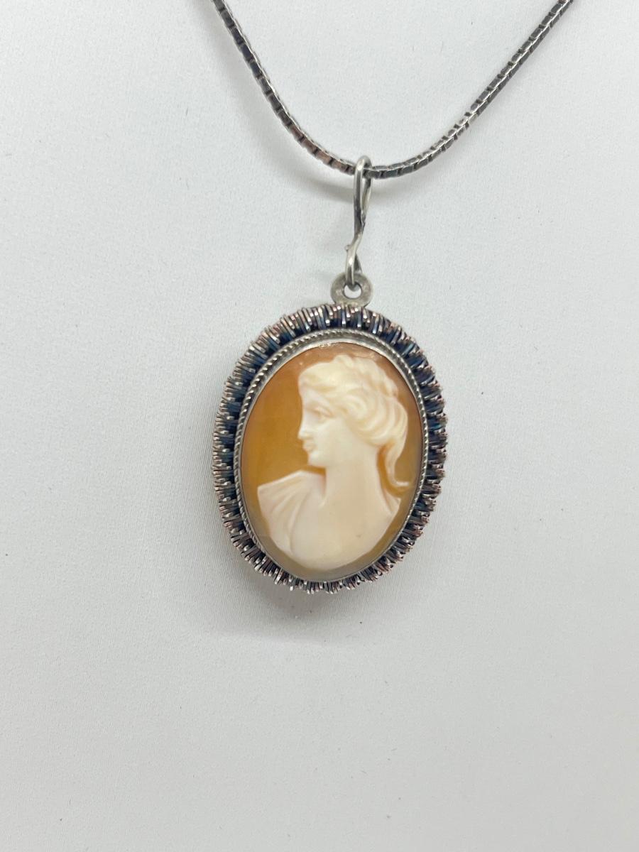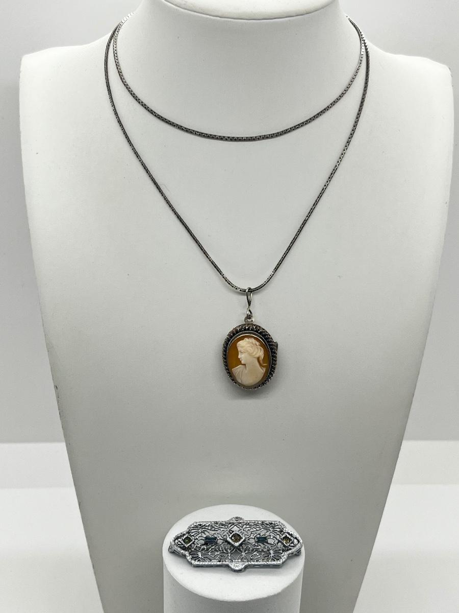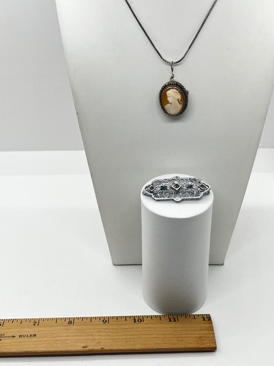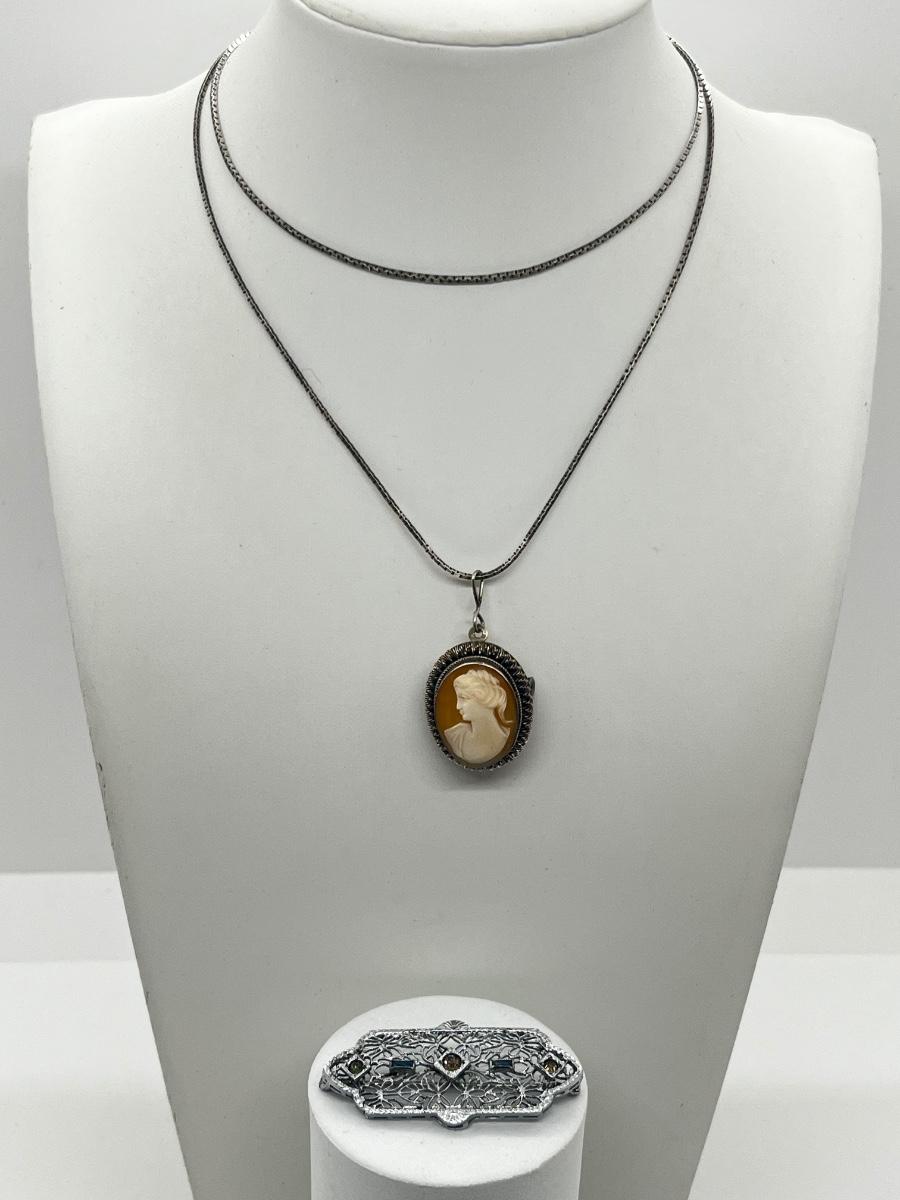 LOT 206J: Vintage Victorian Rhinestone Brooch and Vintage Left Facing Cameo Pin/Pendant on 925 Chain