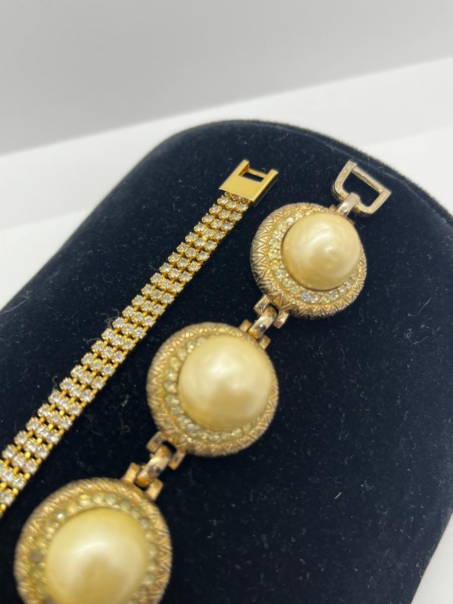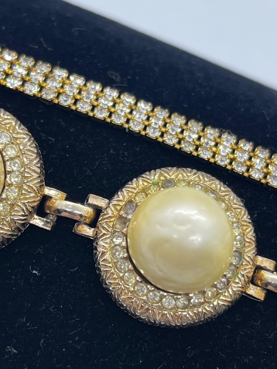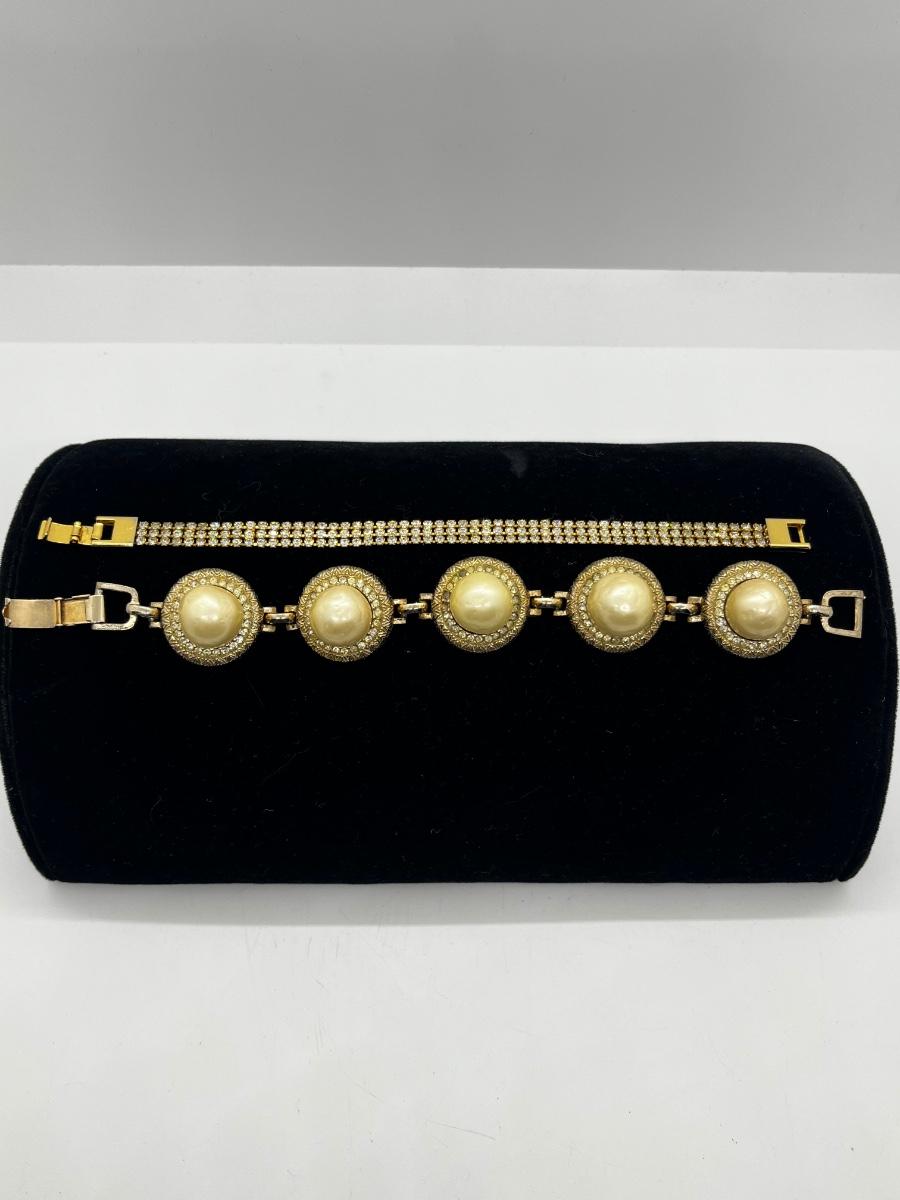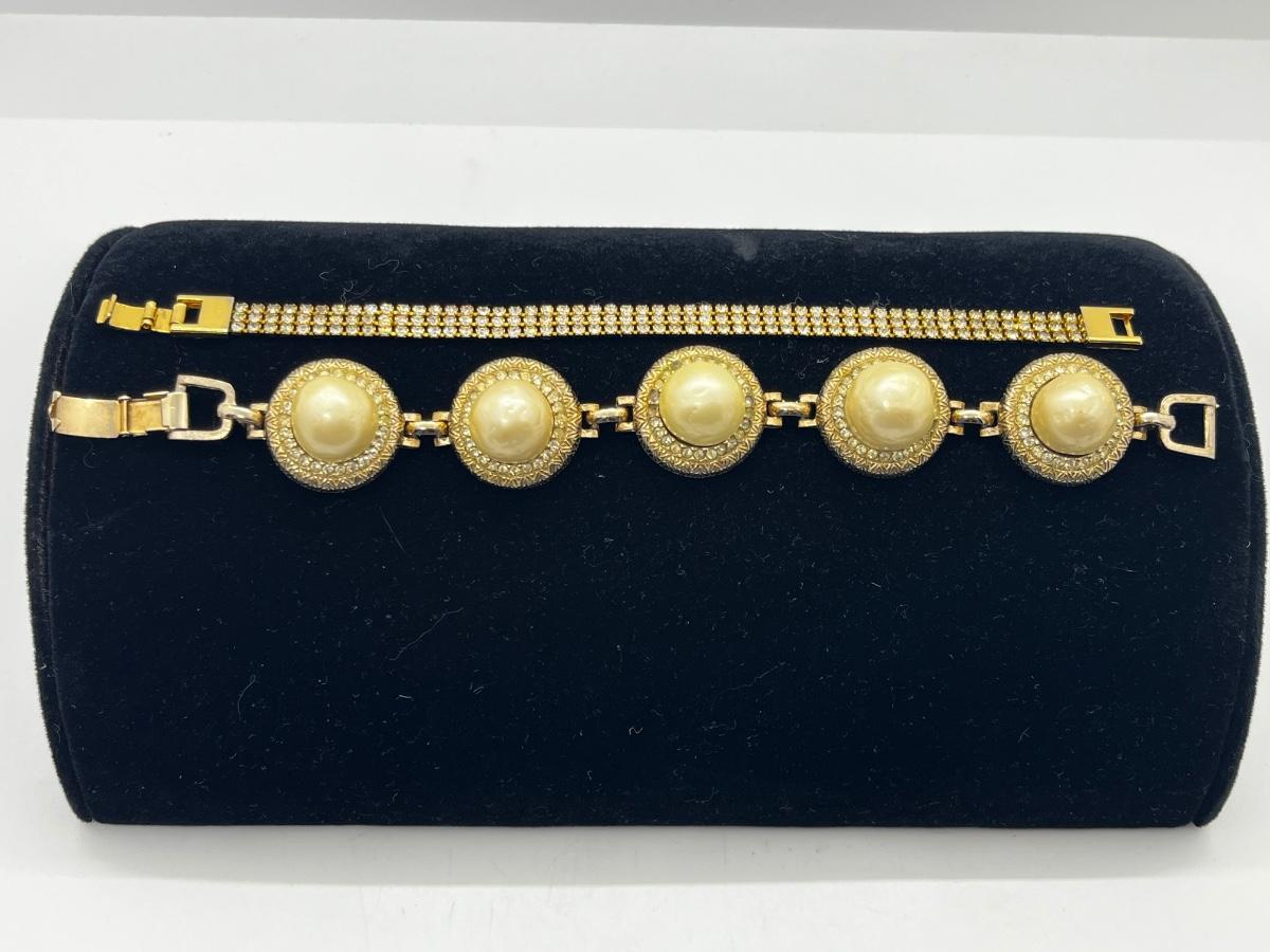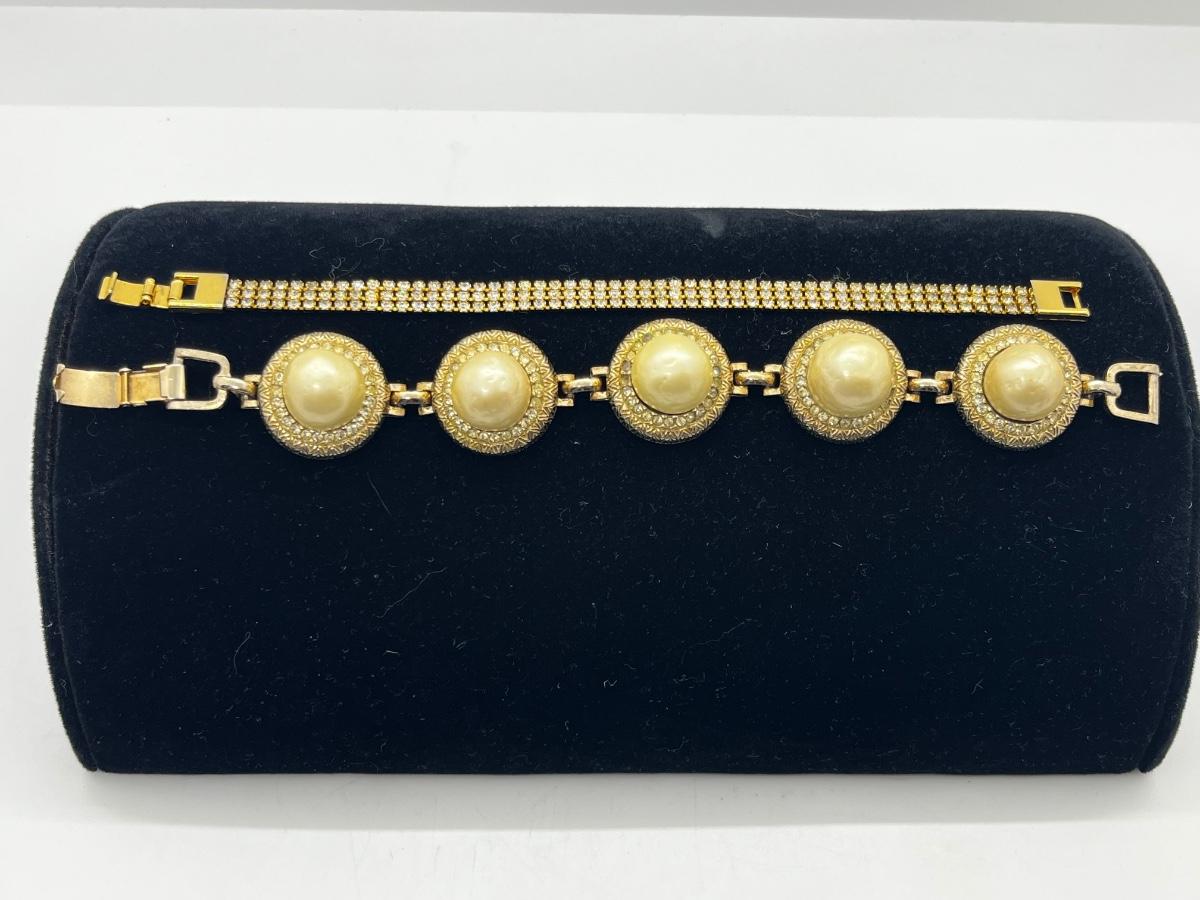 LOT 221J: Vintage Bergere Goldtone Faux Pearl and Rhinestone Link Bracelet (7.5") and Triple Row Goldtone and Rhinestone Bracelet (7")