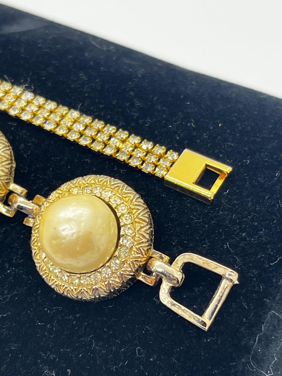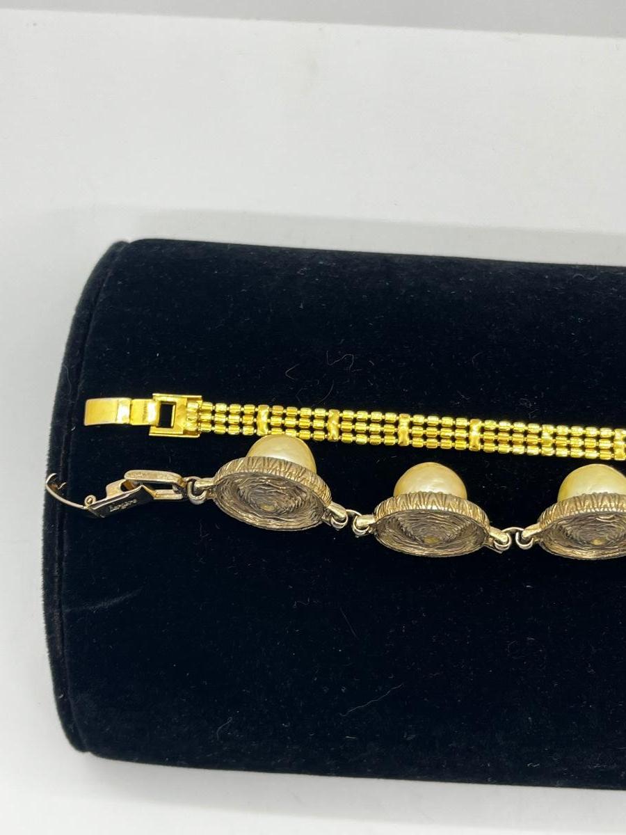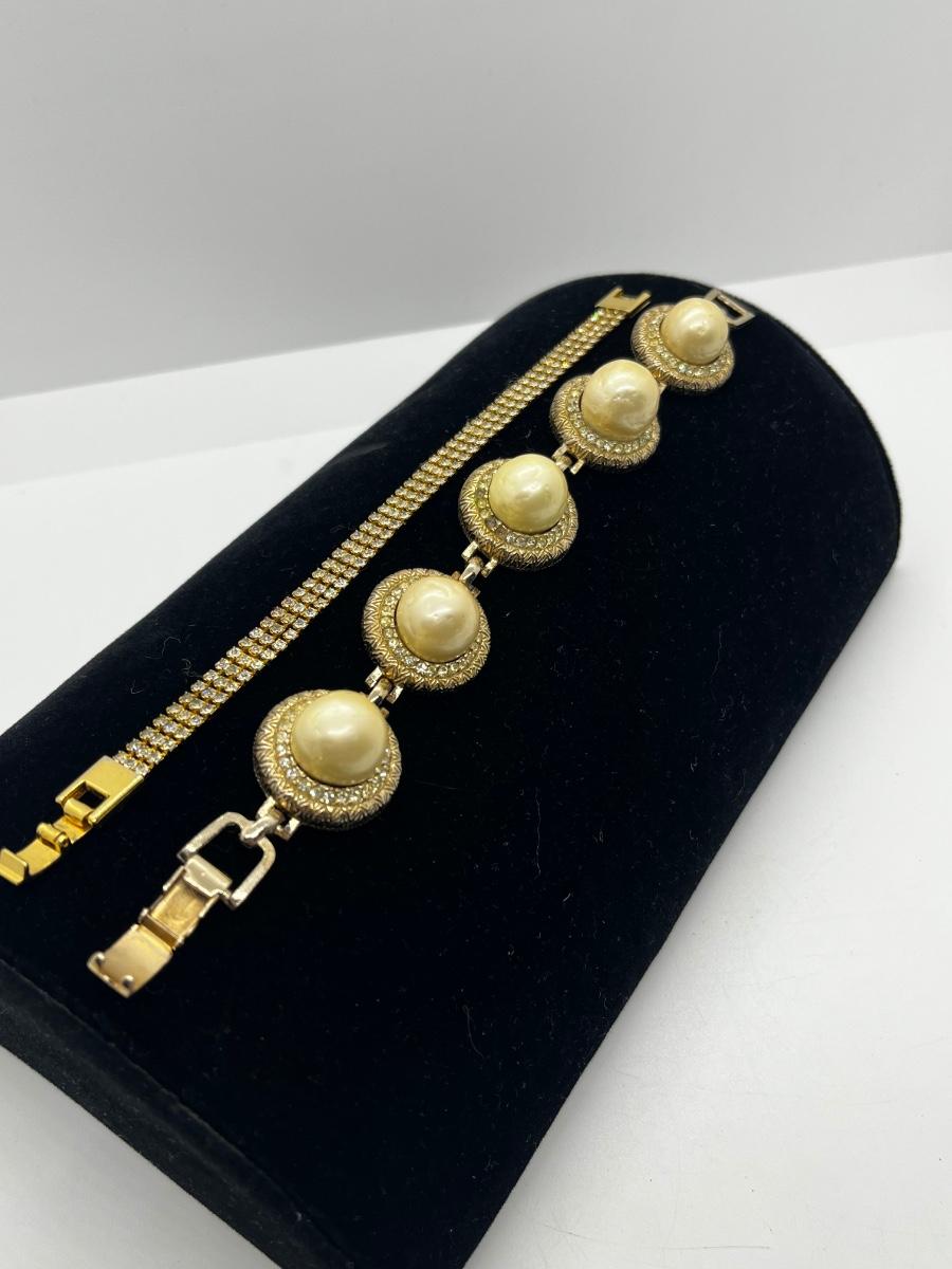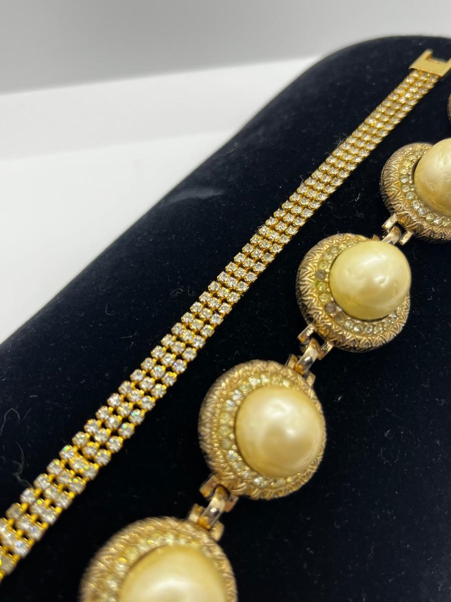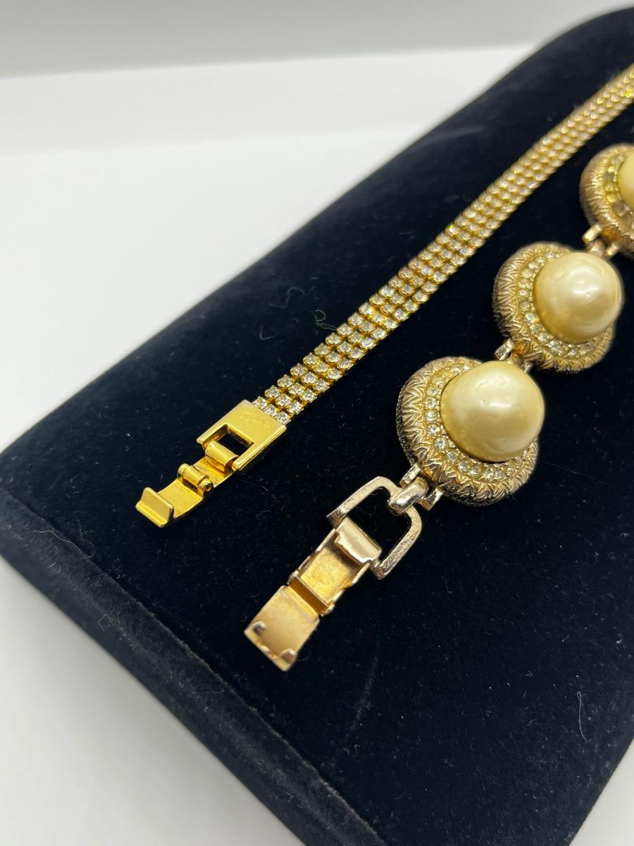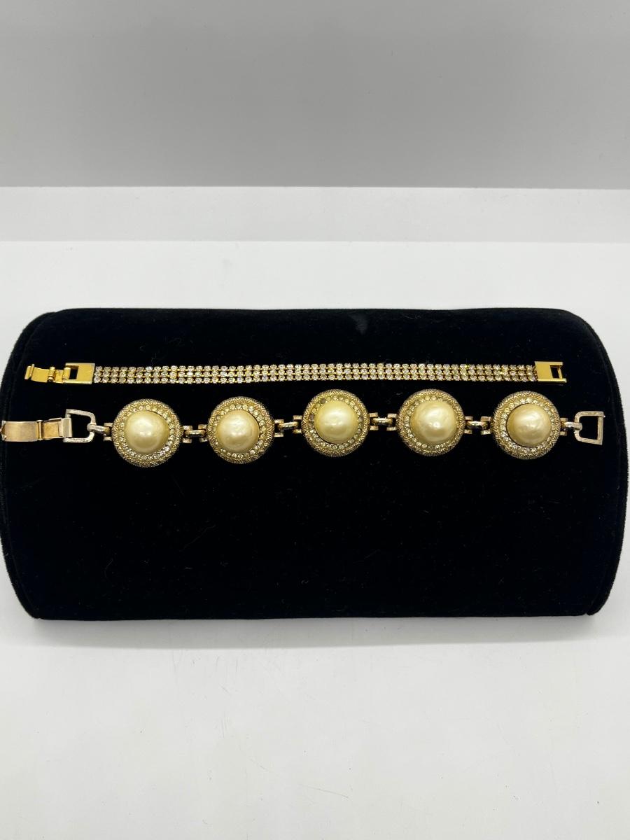 LOT 221J: Vintage Bergere Goldtone Faux Pearl and Rhinestone Link Bracelet (7.5") and Triple Row Goldtone and Rhinestone Bracelet (7")