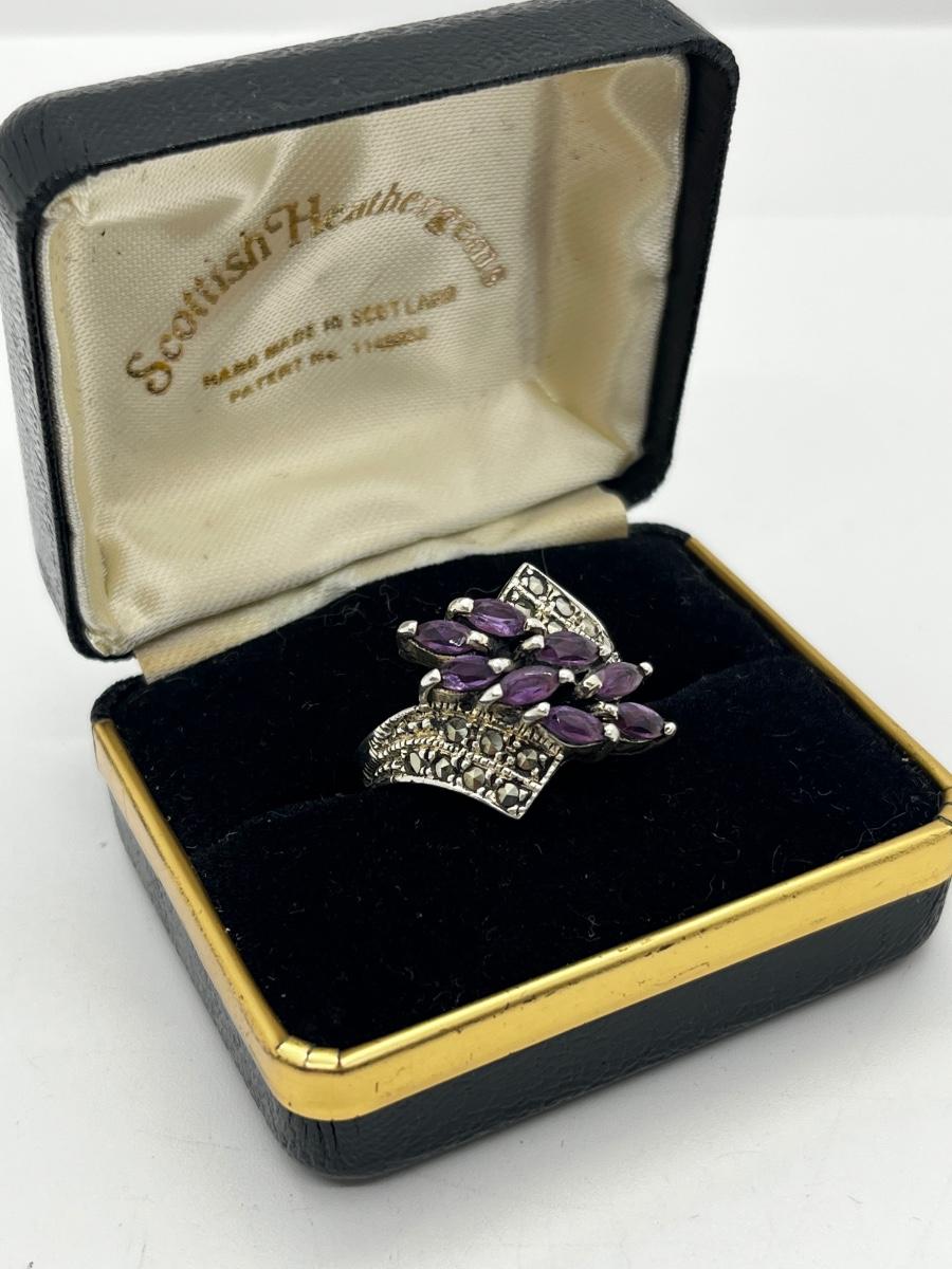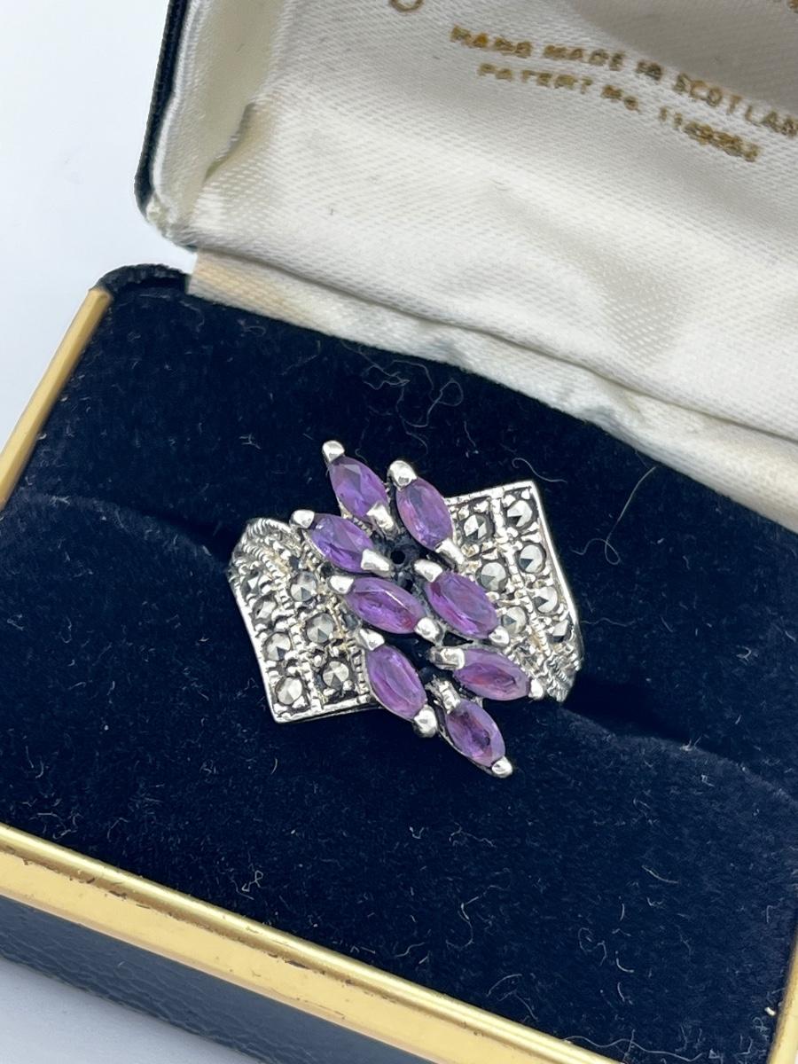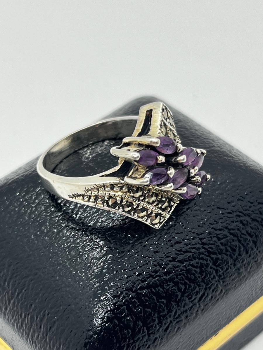 LOT 228J: Stunning Vintage Sterling and Marcasite Amethyst Cluster Ring - Size 8 - 7.4 GTW