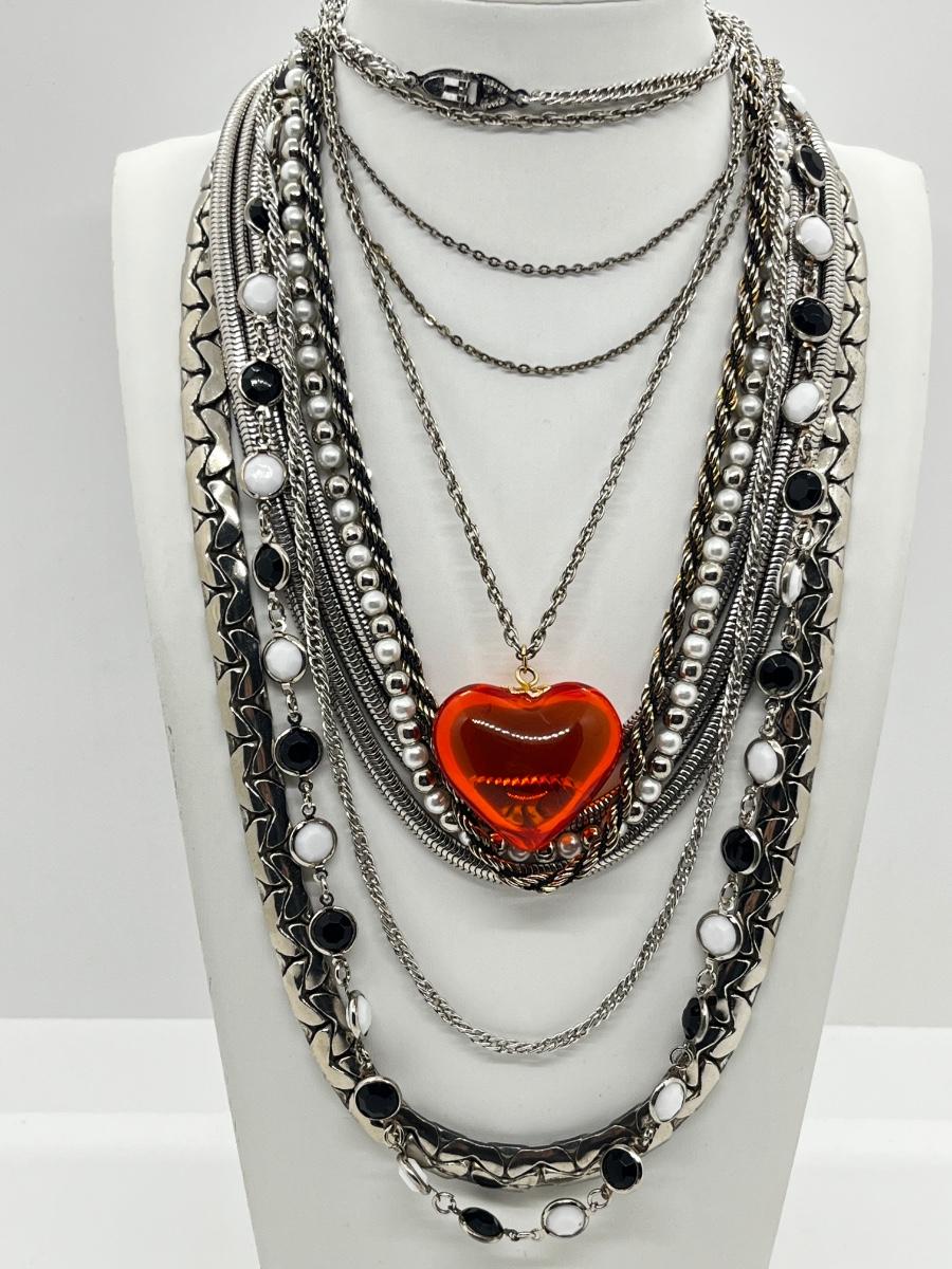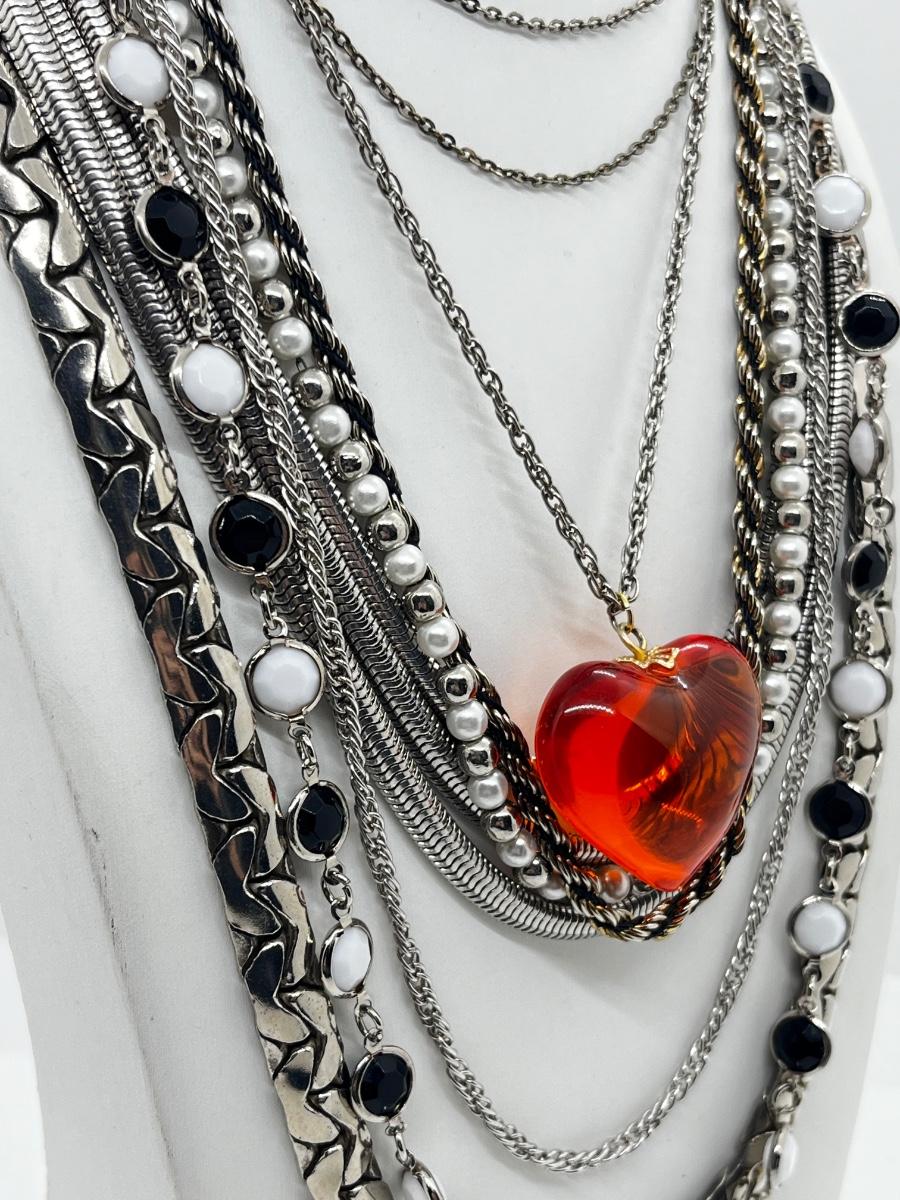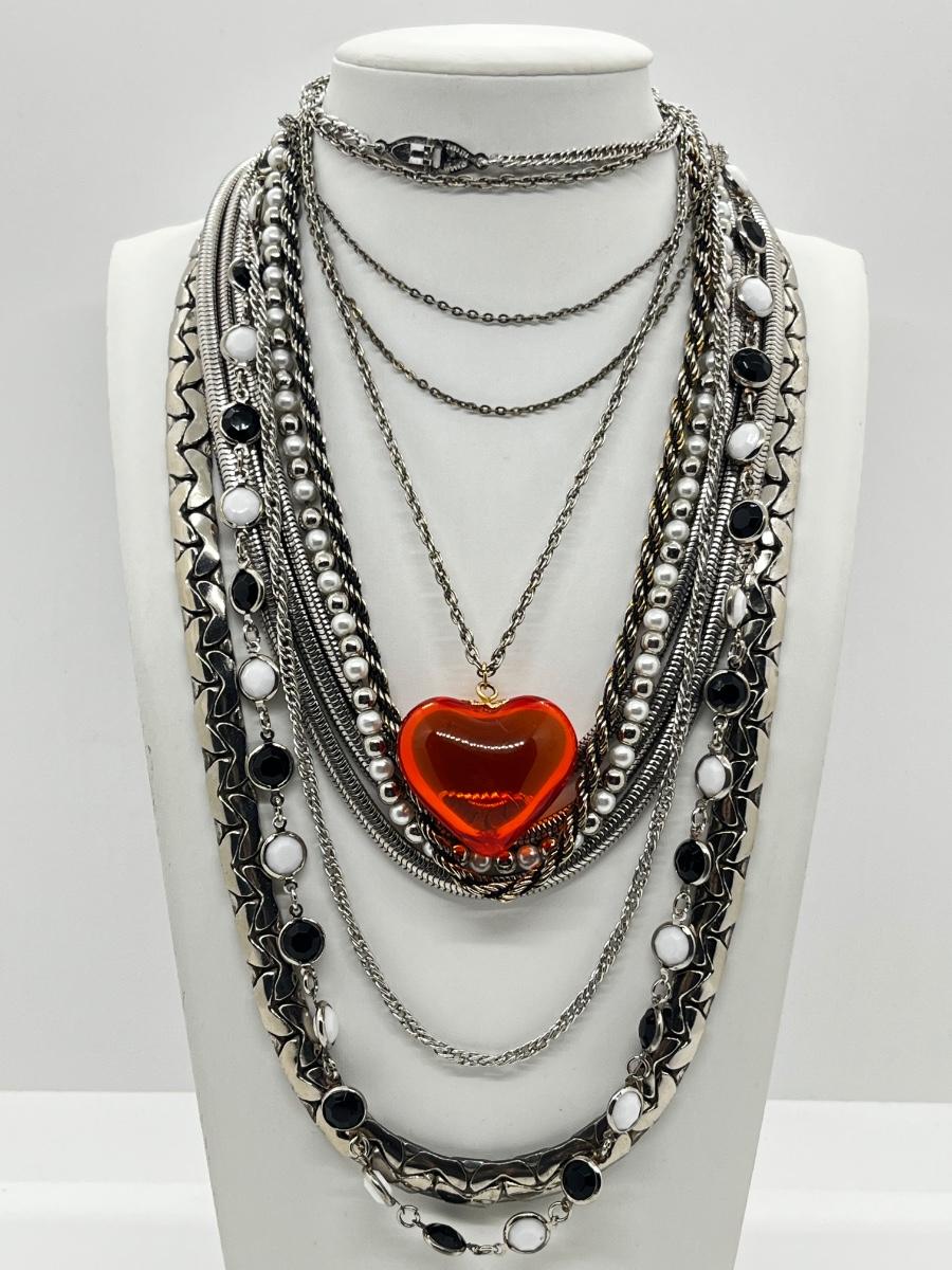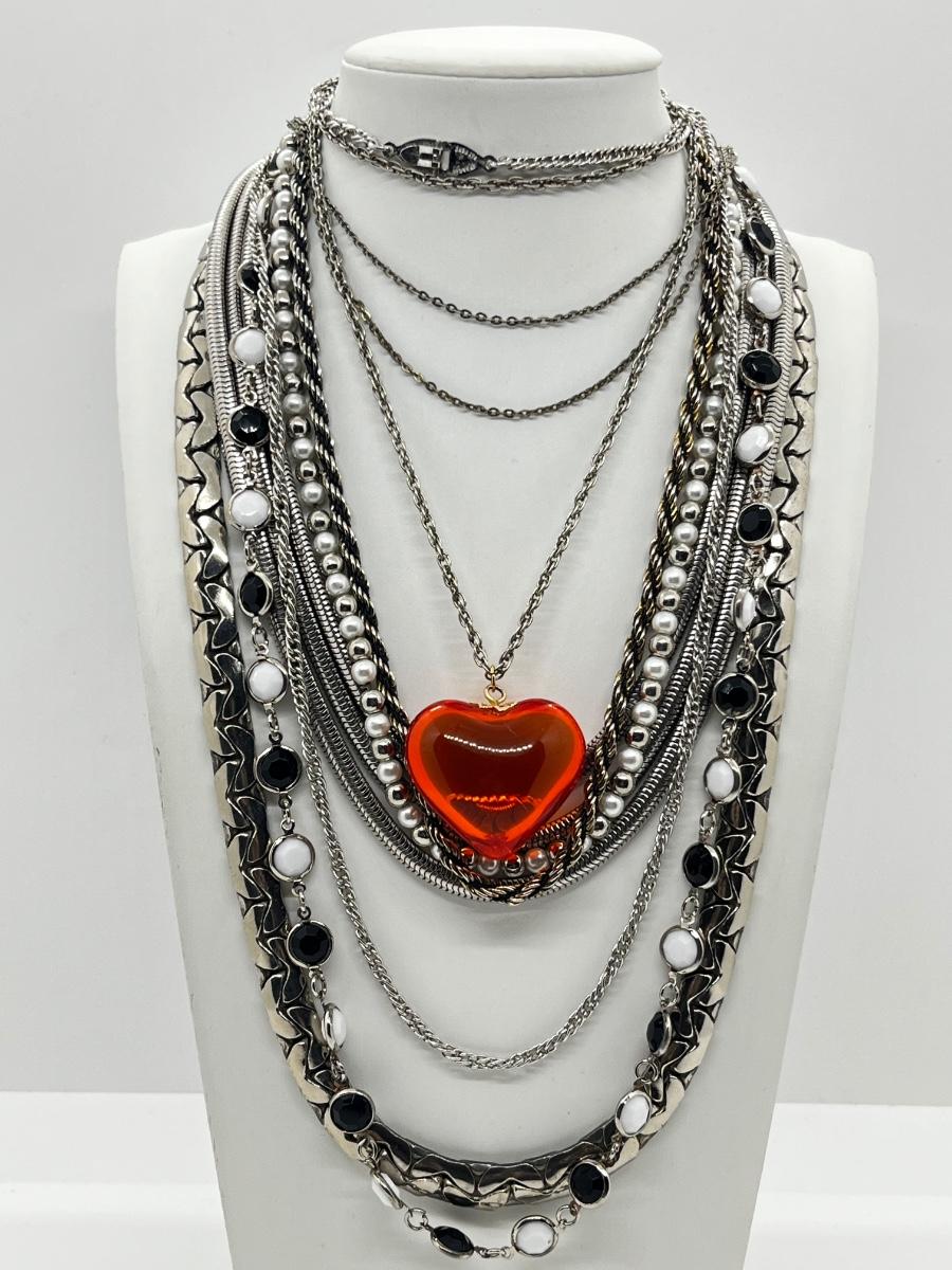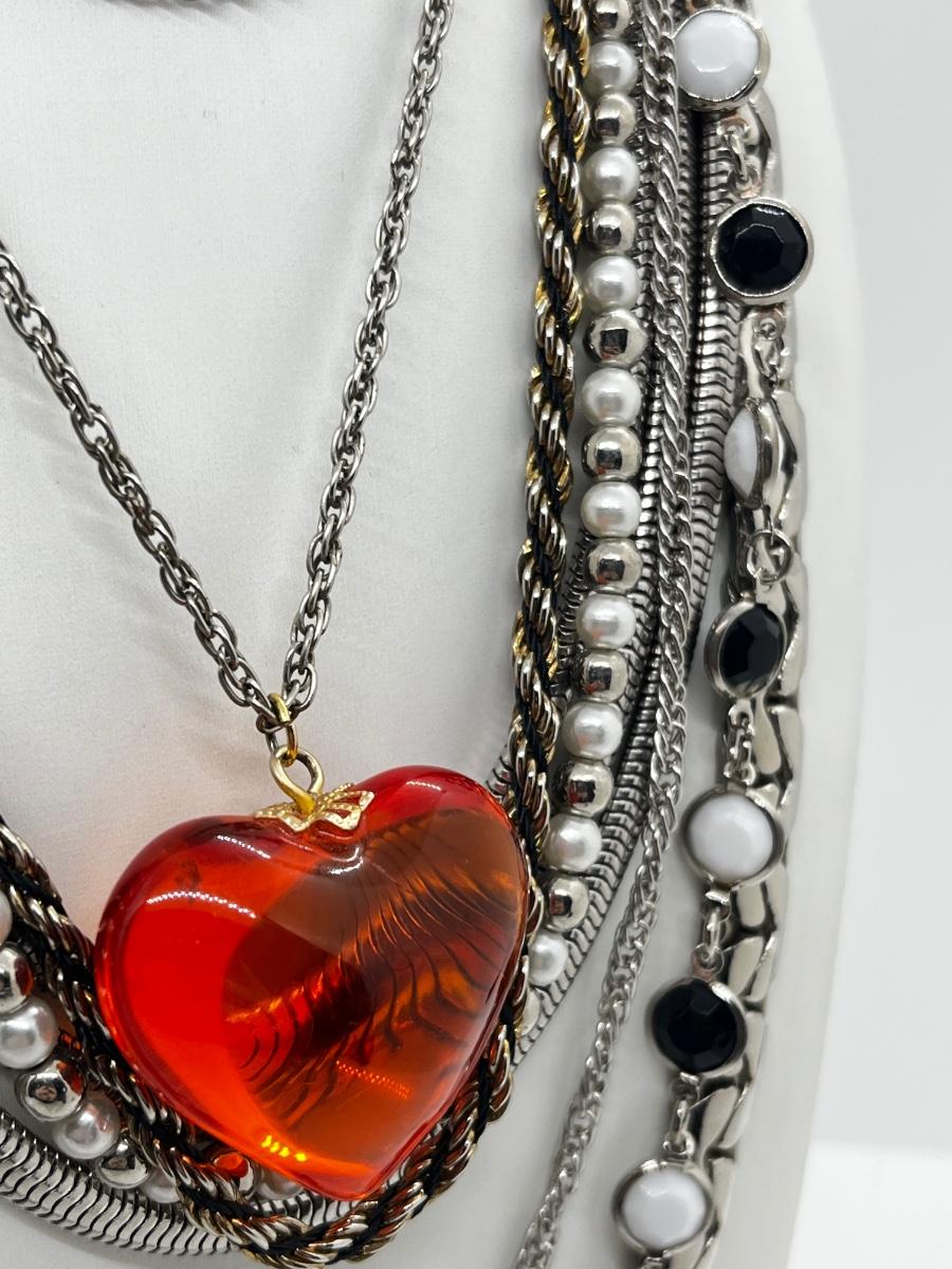 LOT 239: Silvertone and Black Necklace Collection with Showstopper Giant Red Glass Heart Shaped Pendant