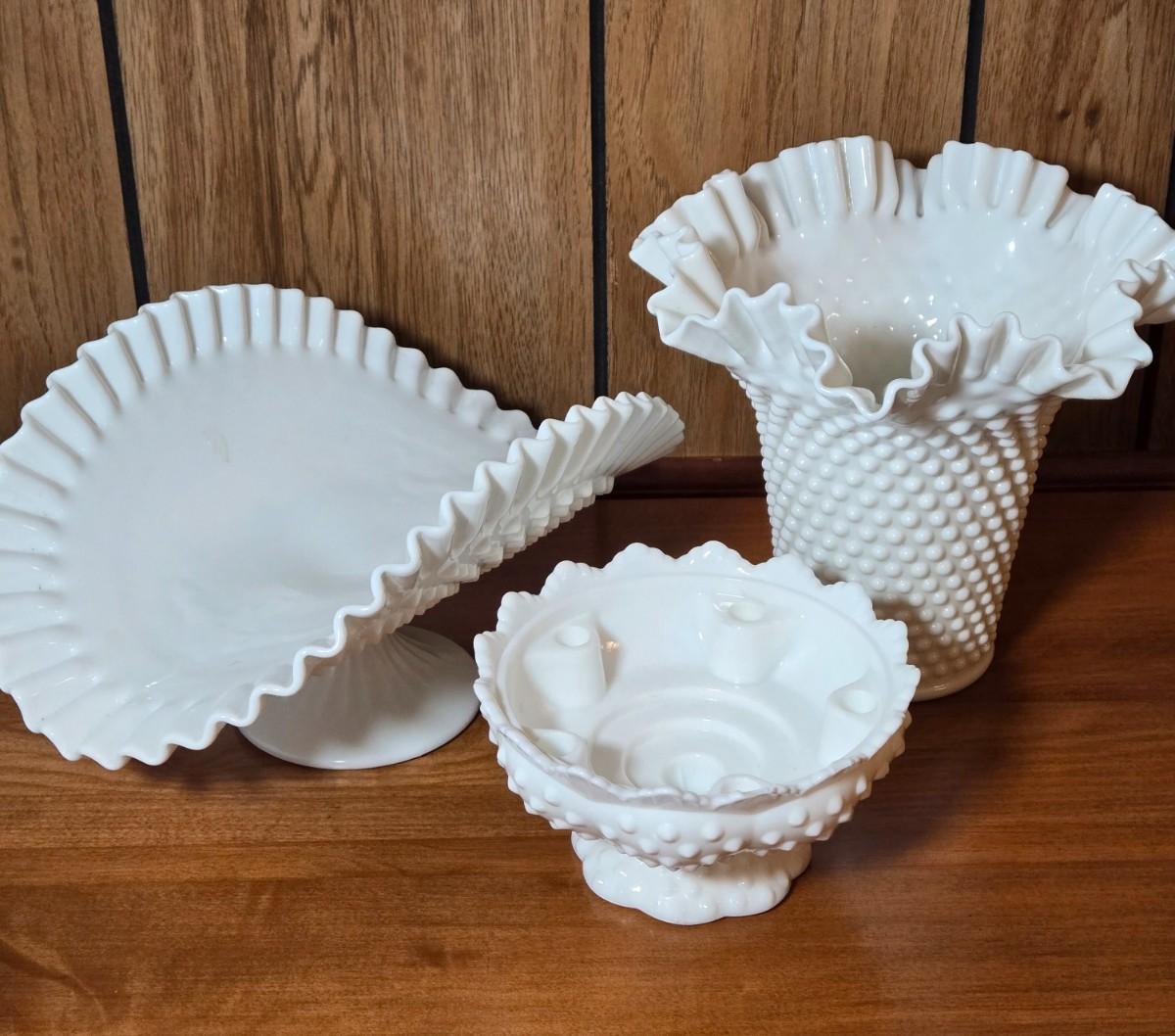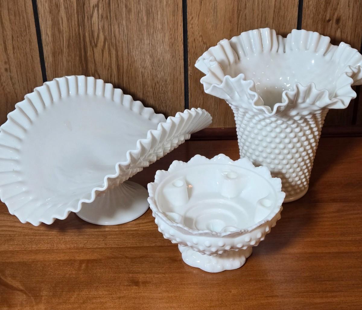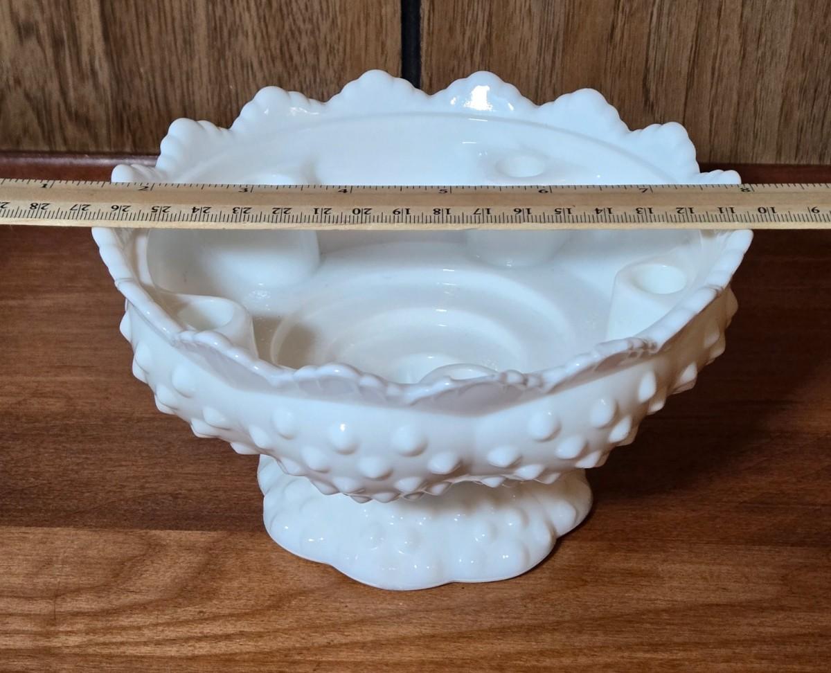 LOT 50M: Vintage Fenton Hobnail Milk Glass Fruit Bowl, Vase, and Candle Holder Bowl
