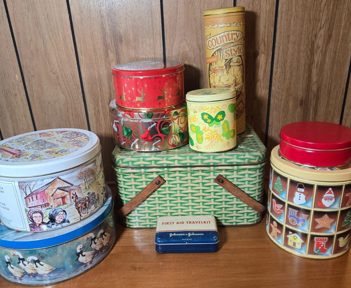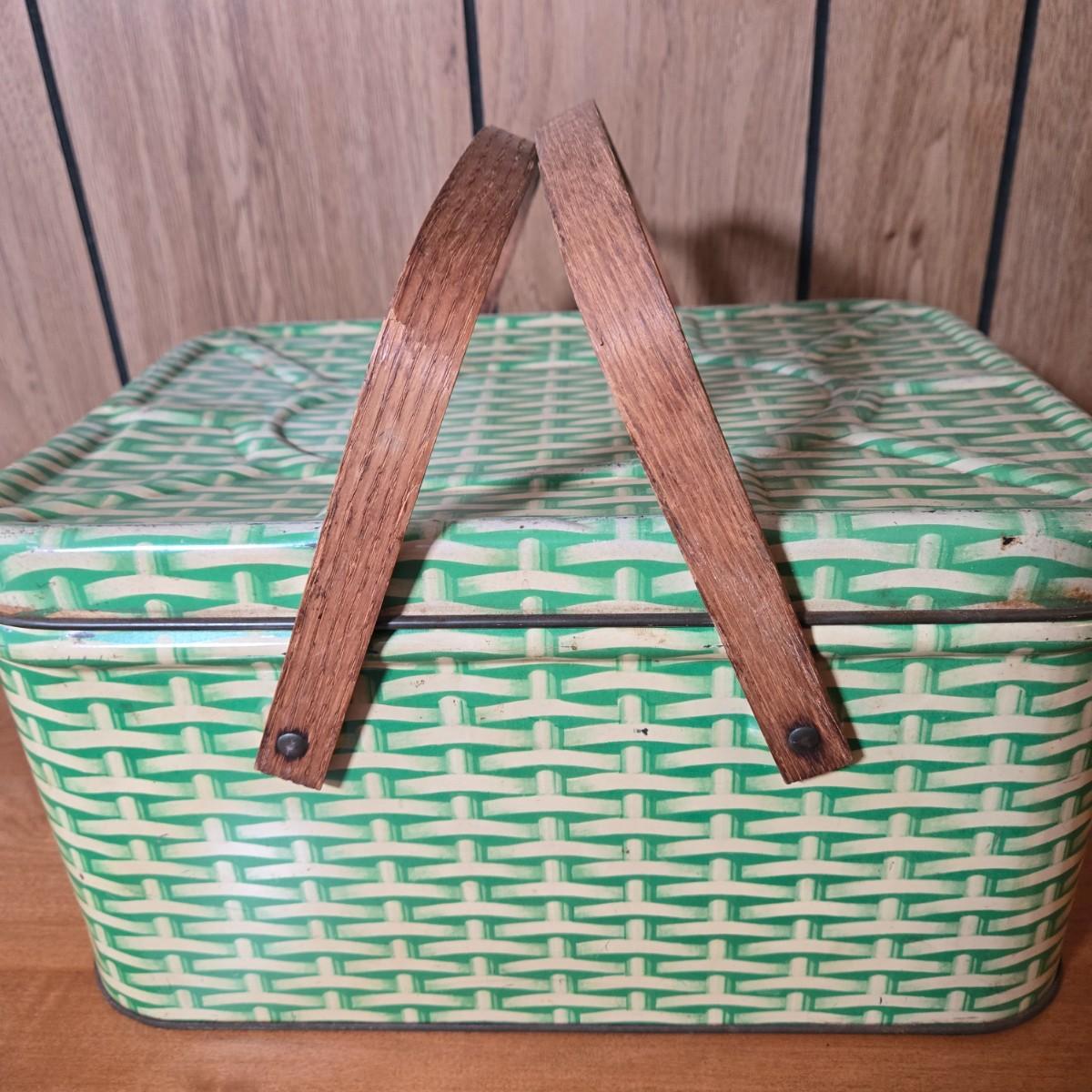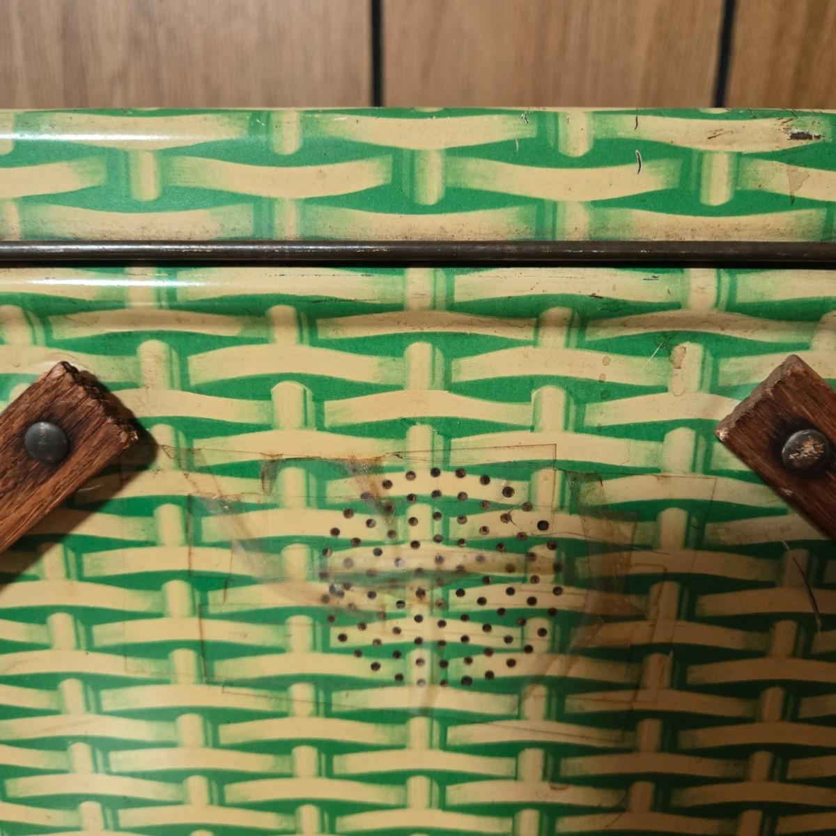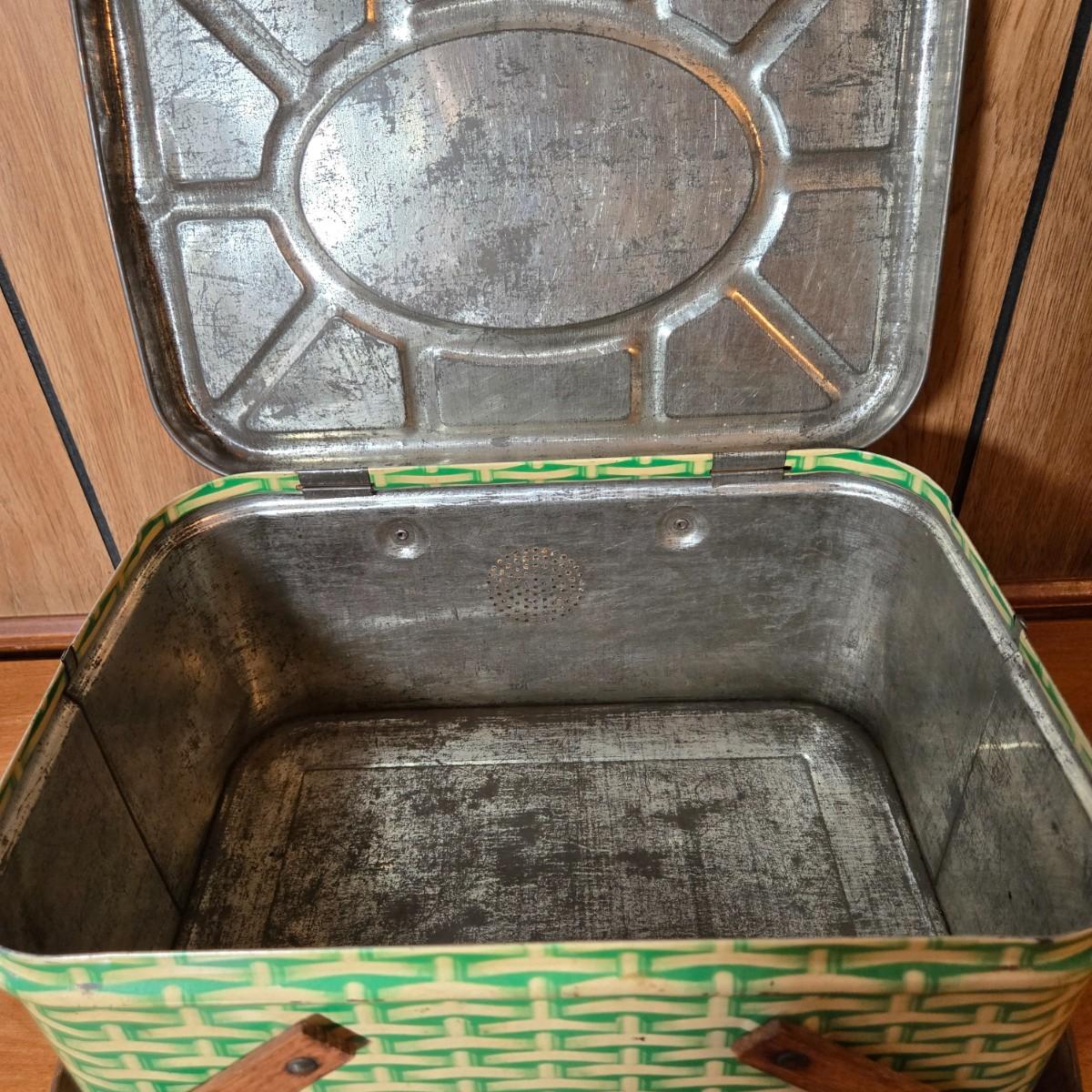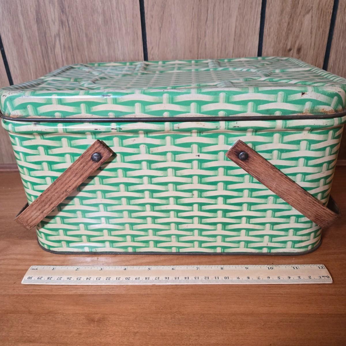 LOT 56M: Vintage Metal Picnic Basket, First Aid Tin, Jean Nate Powder Tin, and More