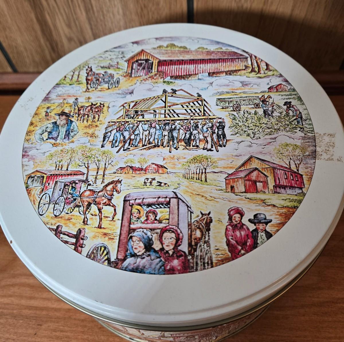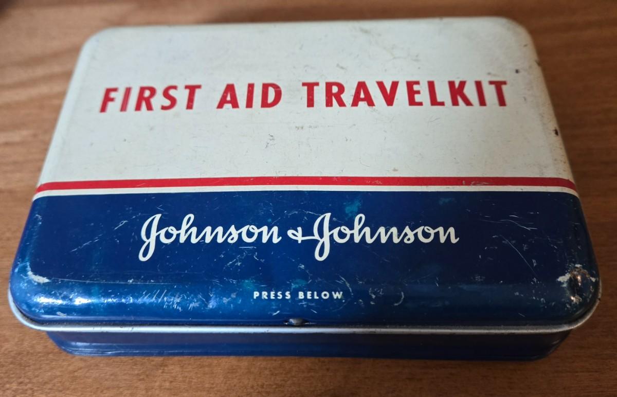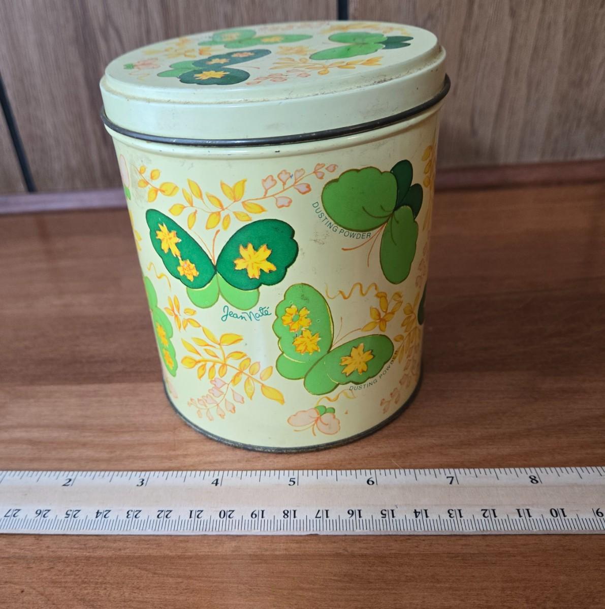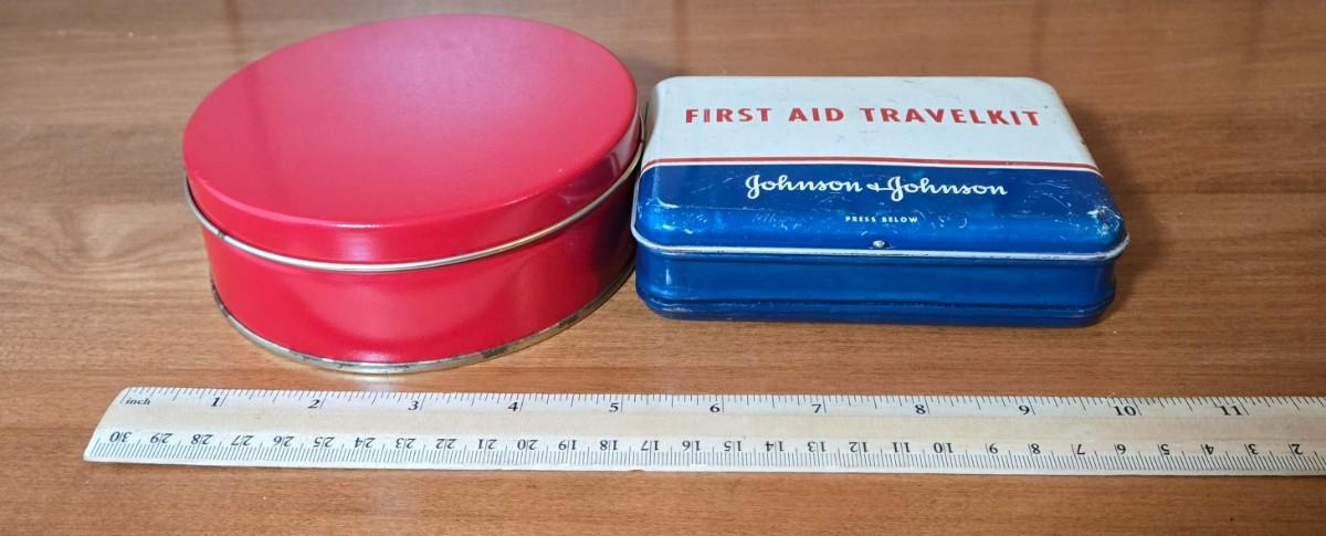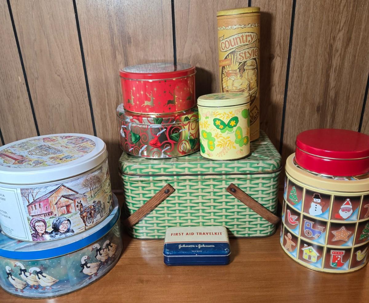 LOT 56M: Vintage Metal Picnic Basket, First Aid Tin, Jean Nate Powder Tin, and More