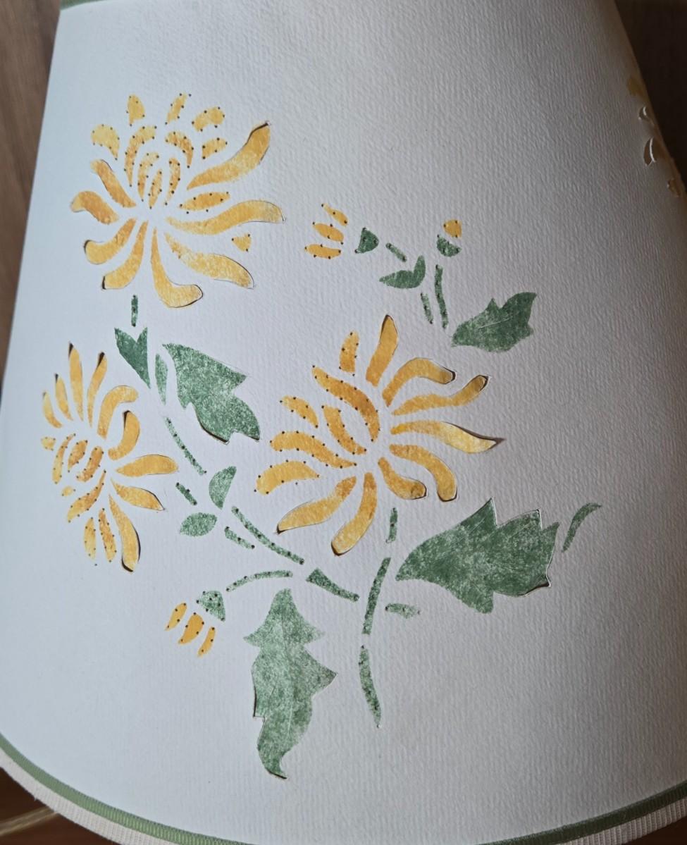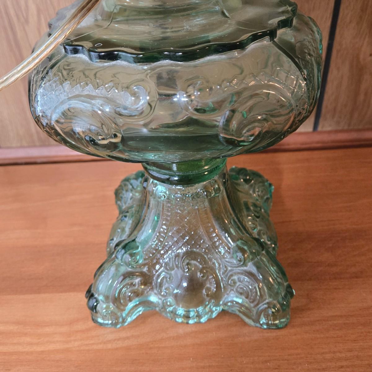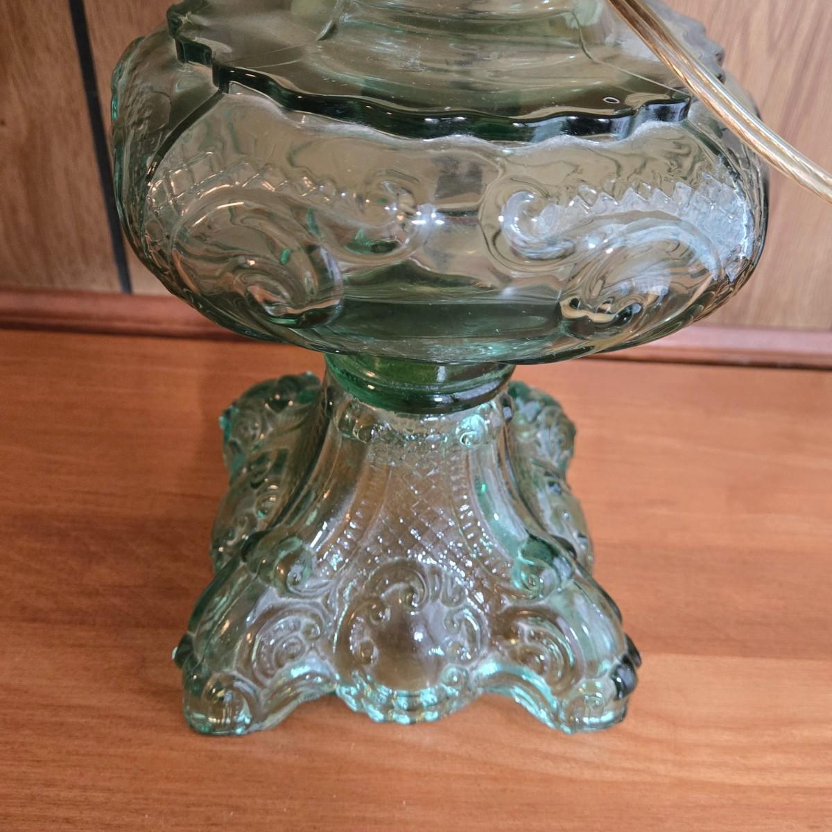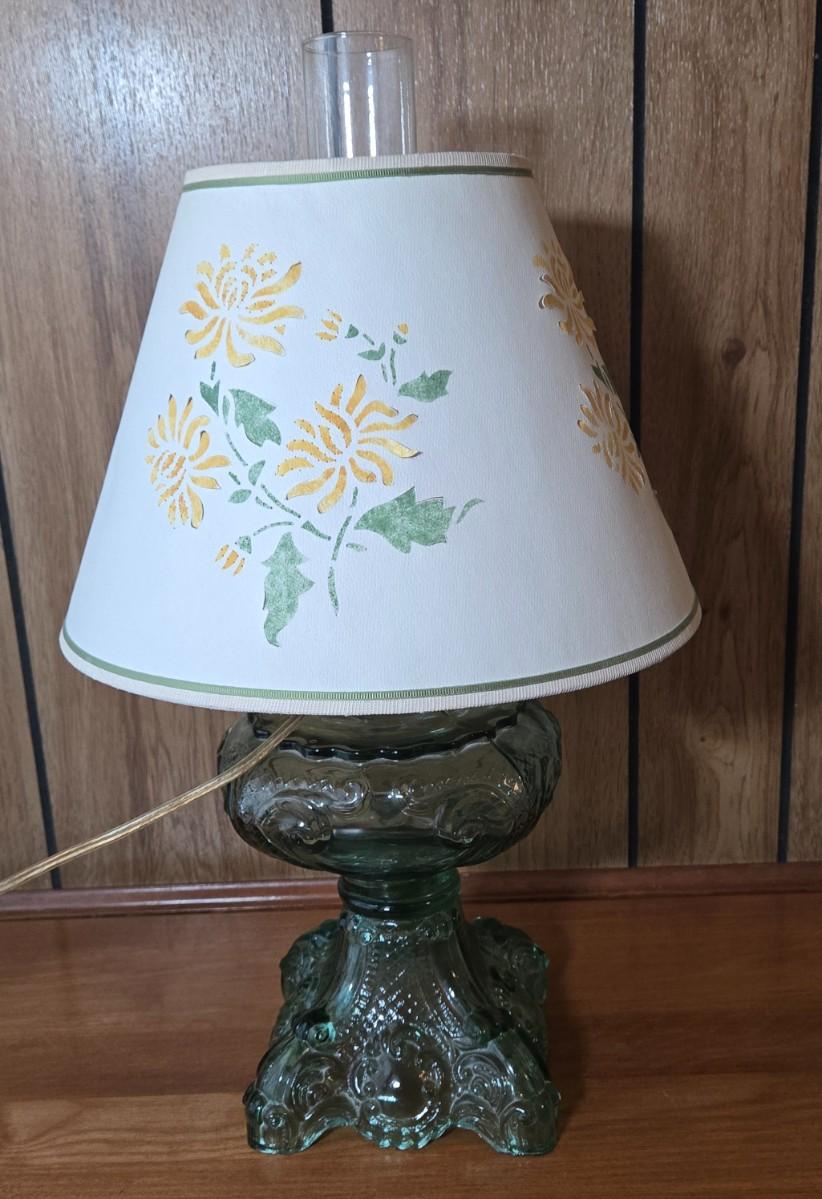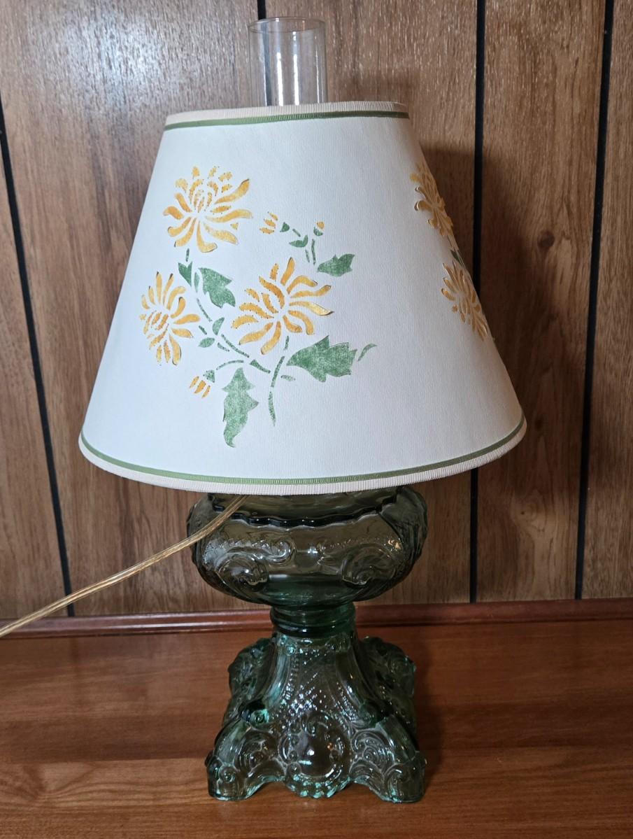 LOT 67L: Vintage Green Glass Table Lamp with Water Color Painted Shade
