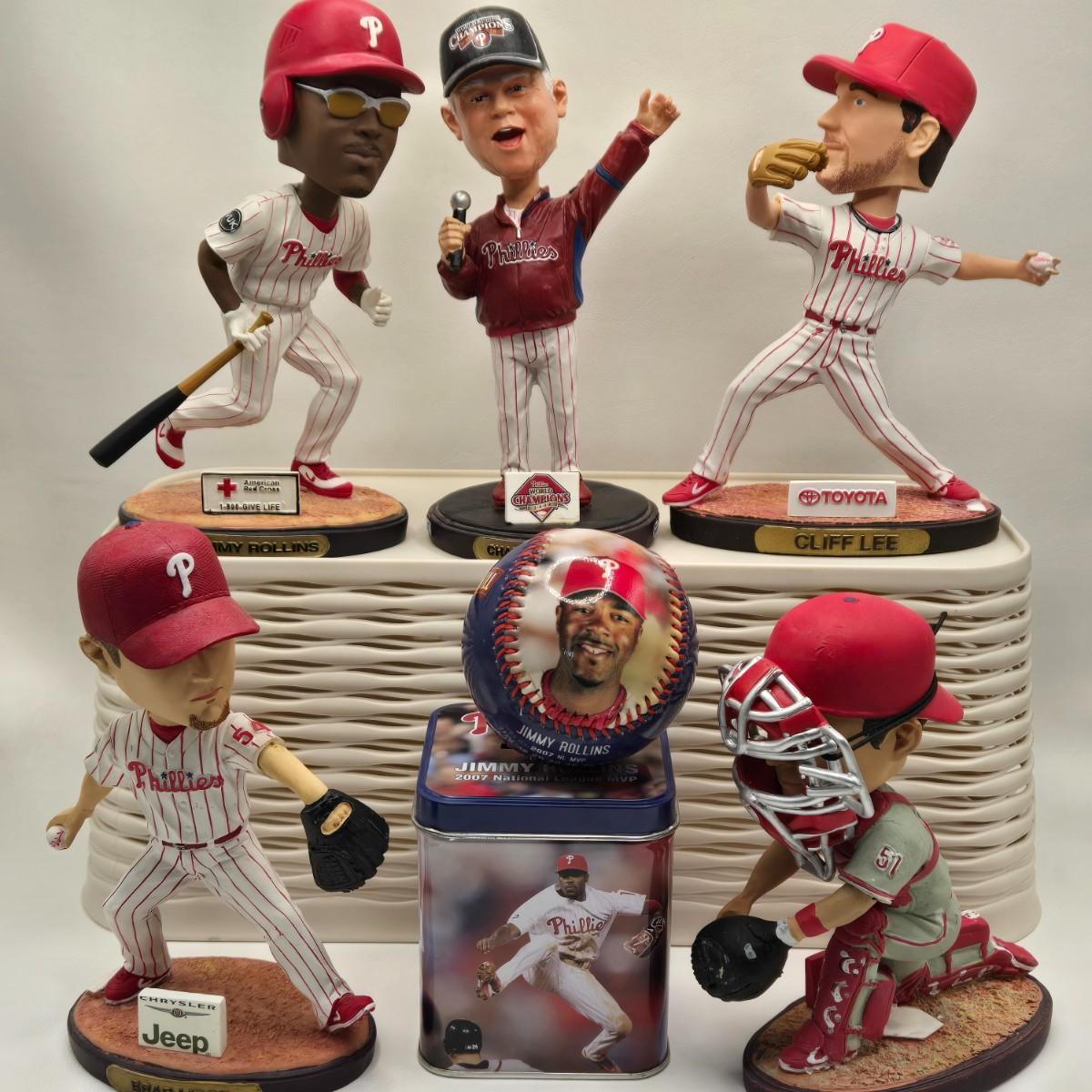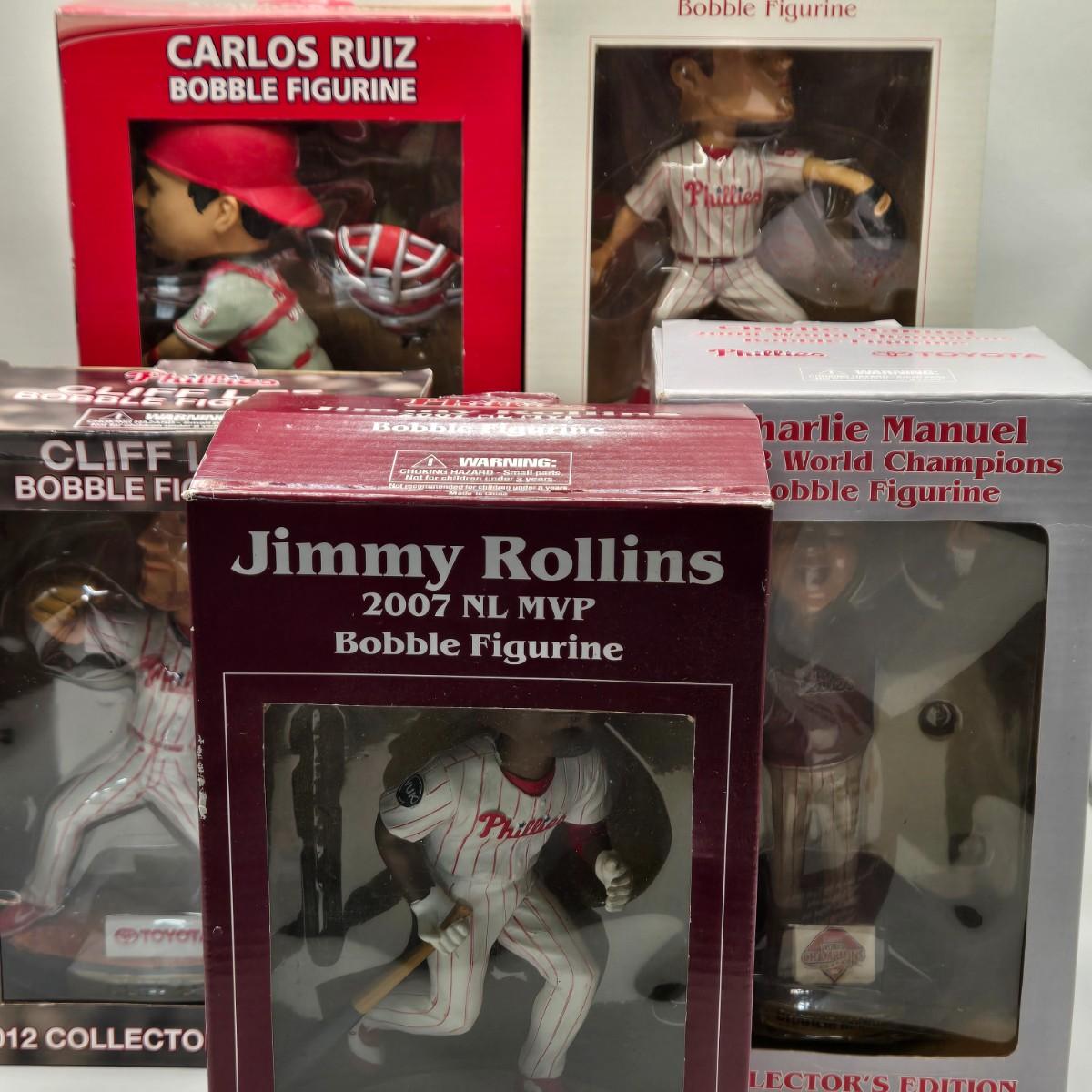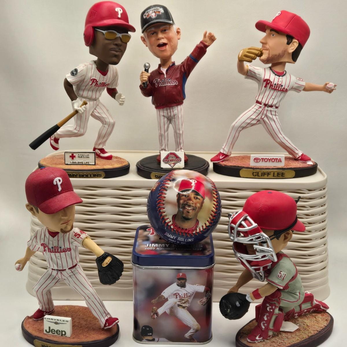LOT 79X: Charlie Manuel, J-Roll, Cliff Lee, "Lights out Lidge" & "Chooch" Bobble Heads and J-Roll 2007 MVP Ball with Coin Bank/Let's Go Phillies!!