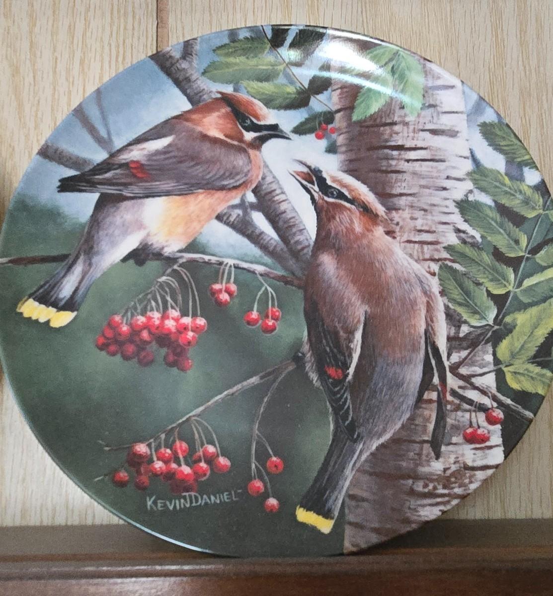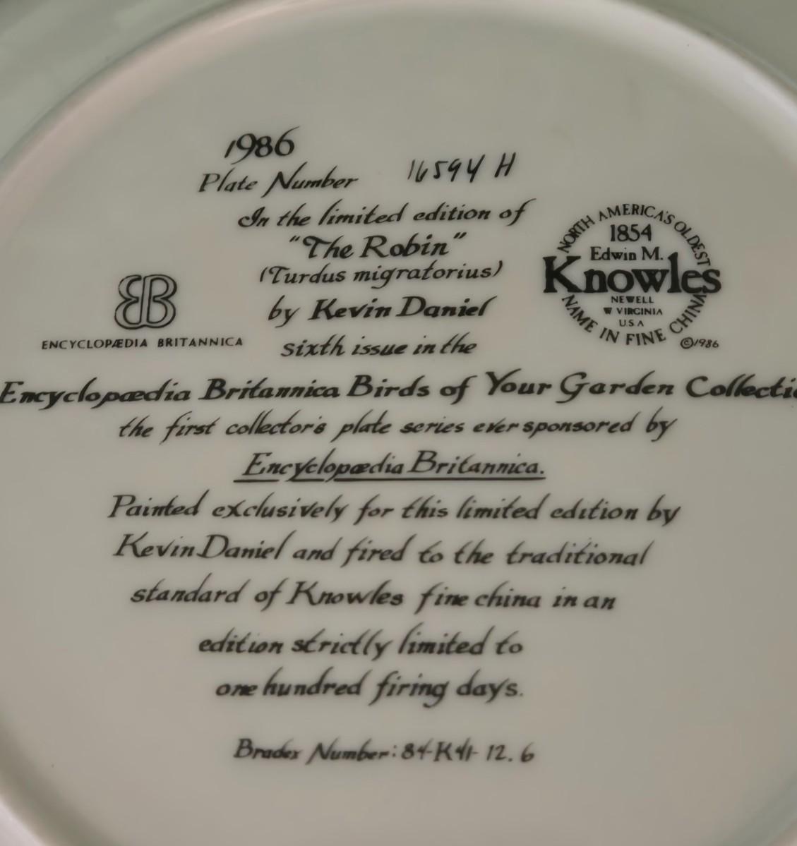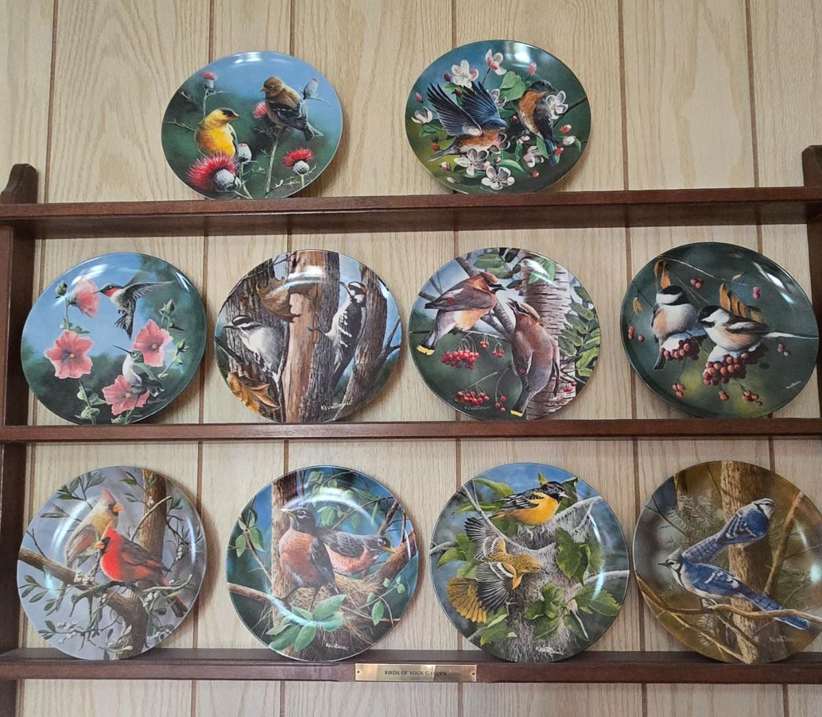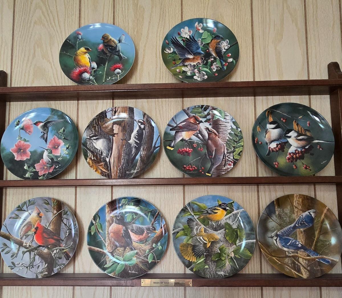 LOT 88X: Encyclopedia Britannica Birds of Your Garden Limited Edition & Numbered Knowels China Plates Painted by Kevin Daniel with Wooden Plate Rack