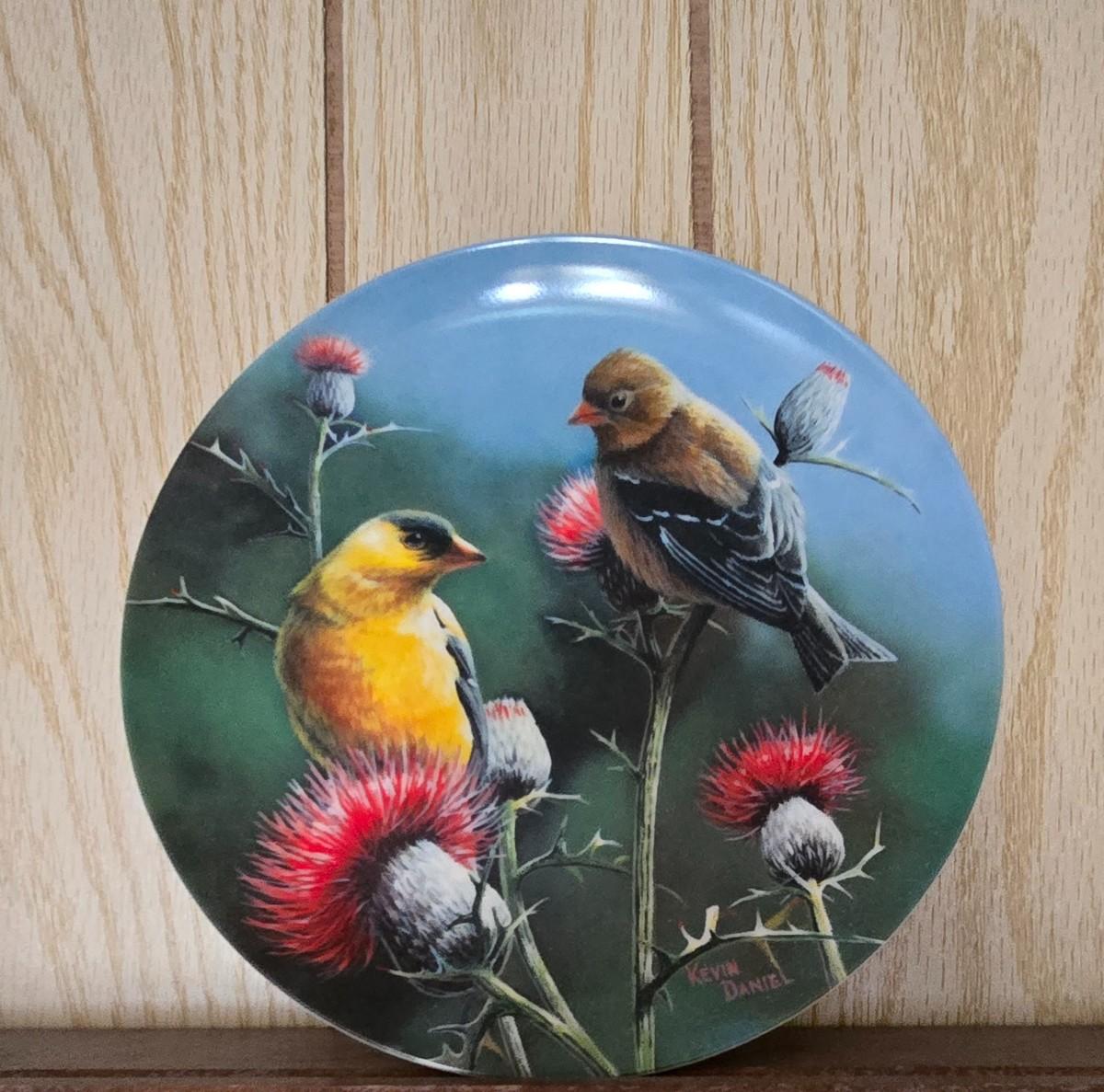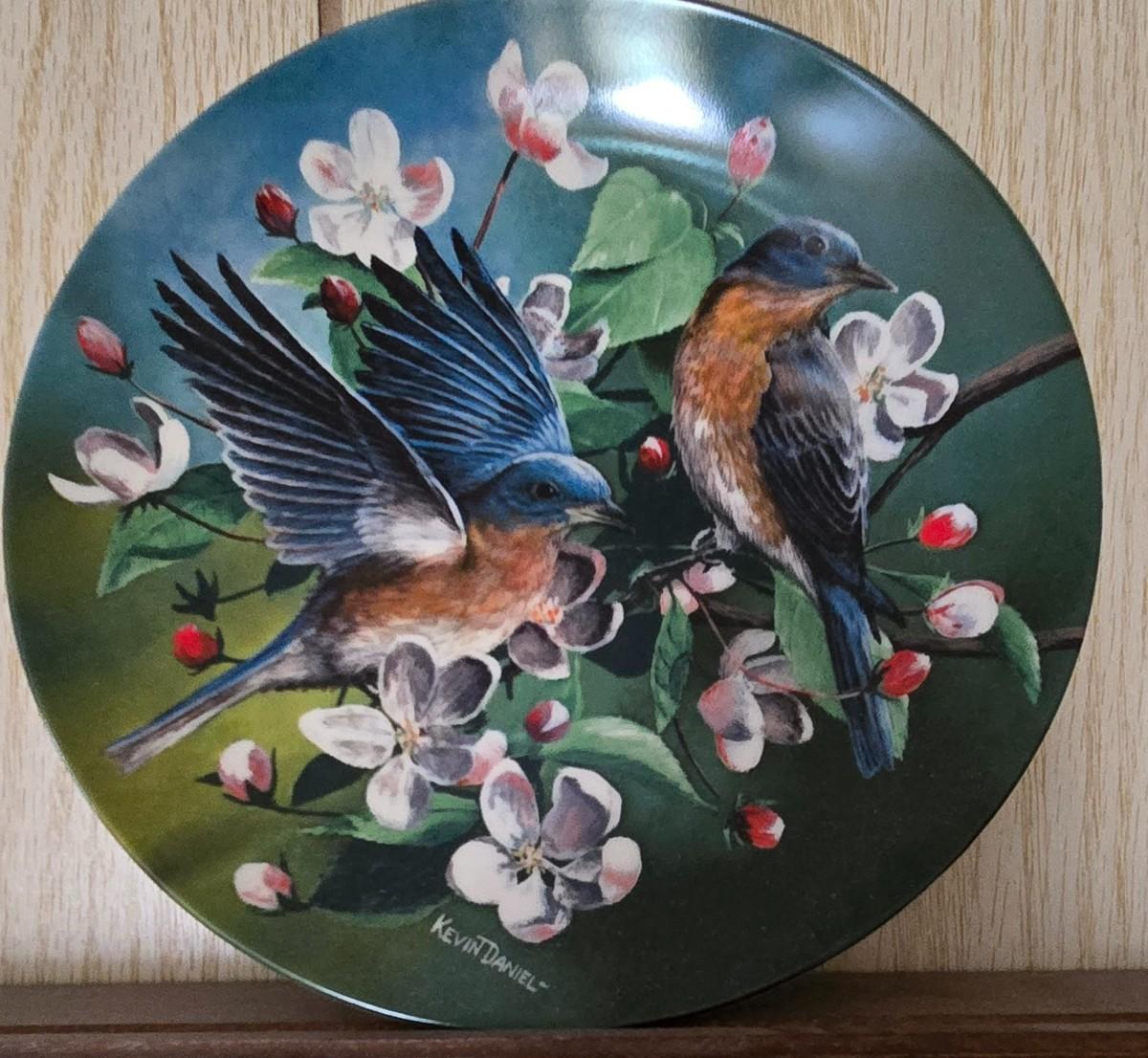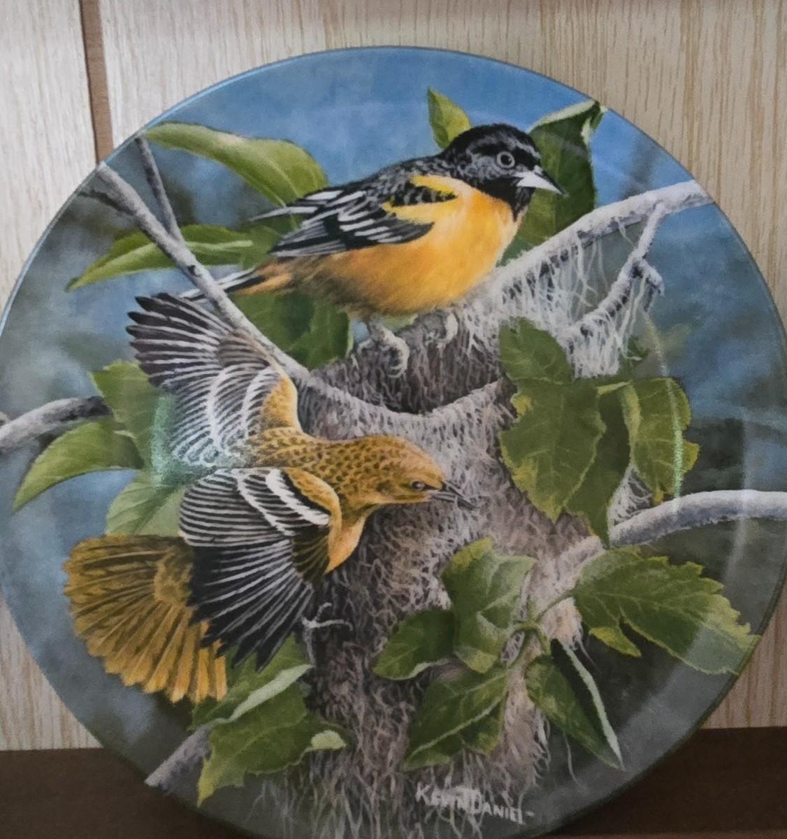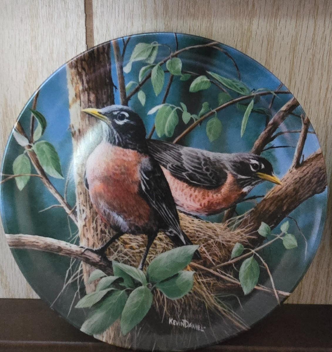 LOT 88X: Encyclopedia Britannica Birds of Your Garden Limited Edition & Numbered Knowels China Plates Painted by Kevin Daniel with Wooden Plate Rack