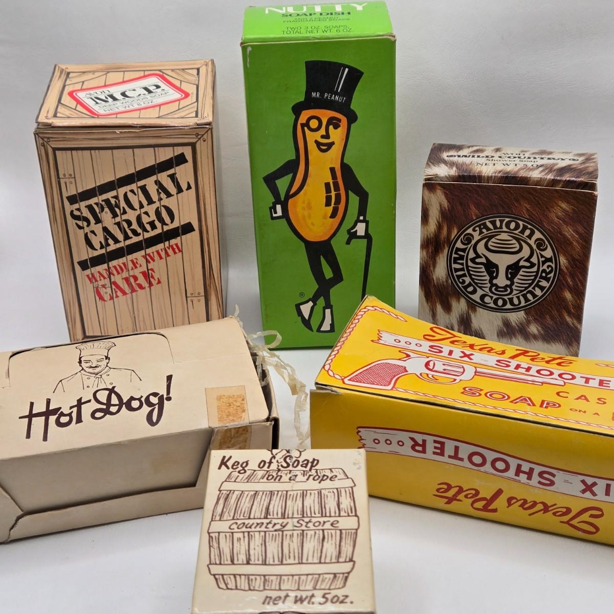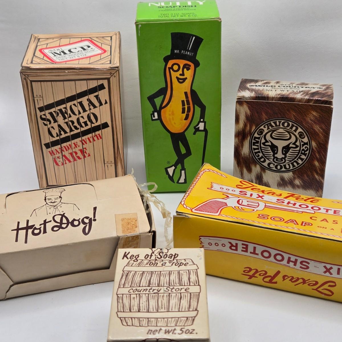 LOT 95X: Vintage Soaps Including Avon Mr. Peanut, Wild Country, and More/ Yes, and a Hot Dog Soap....