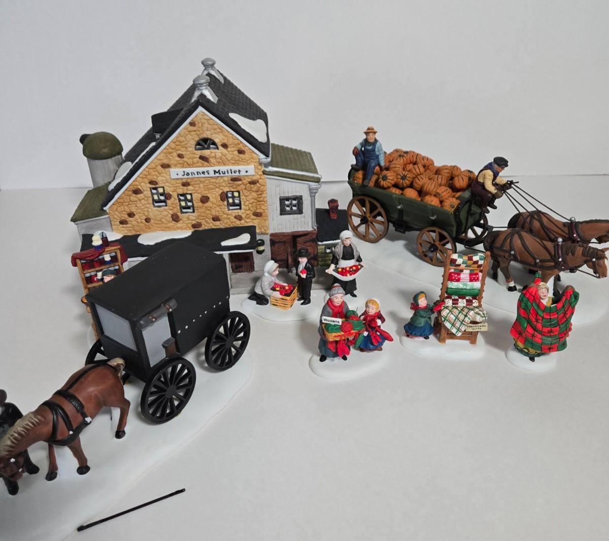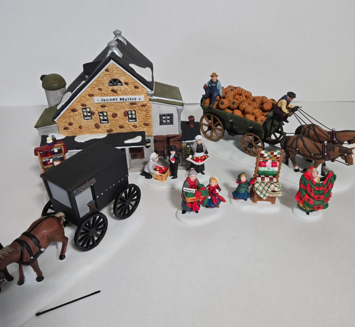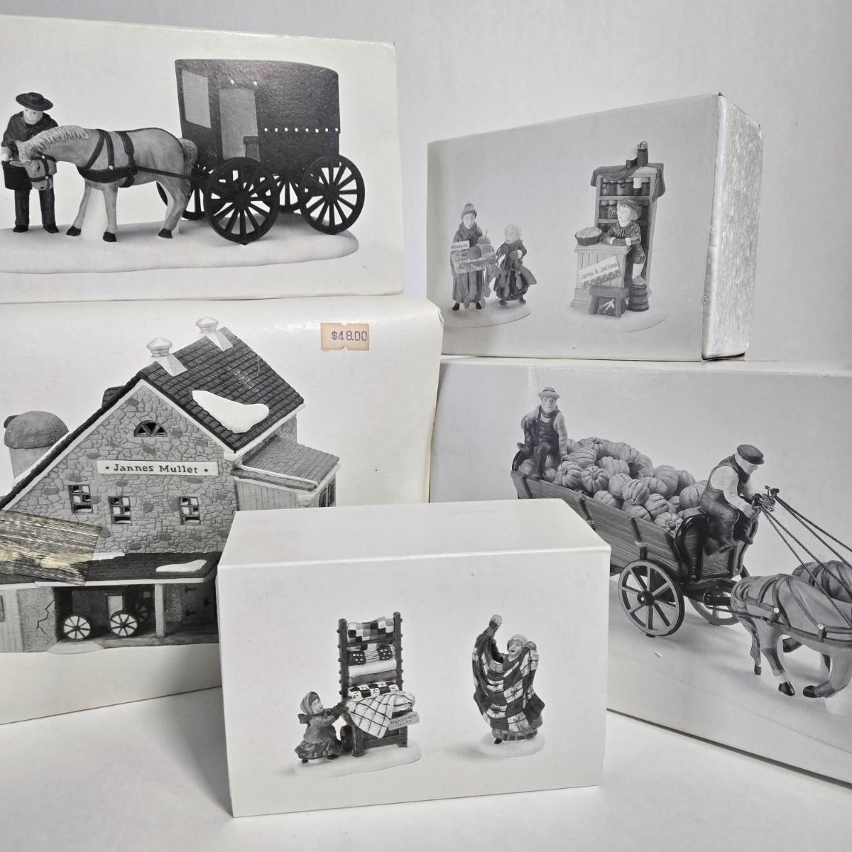 LOT 120X: Dept. 56 "Jannes Mullet Amish Barn", "Handmade Quilts", "Woolens and Preserves", "Amish Buggy", and " Harvest Pumpkin Wagon" /All with original Boxes