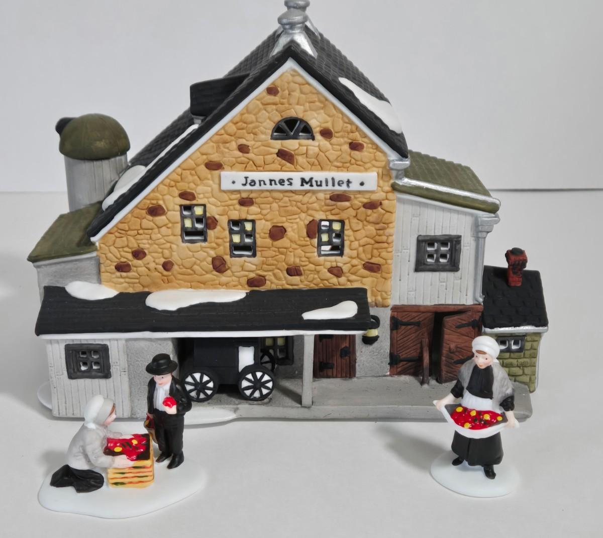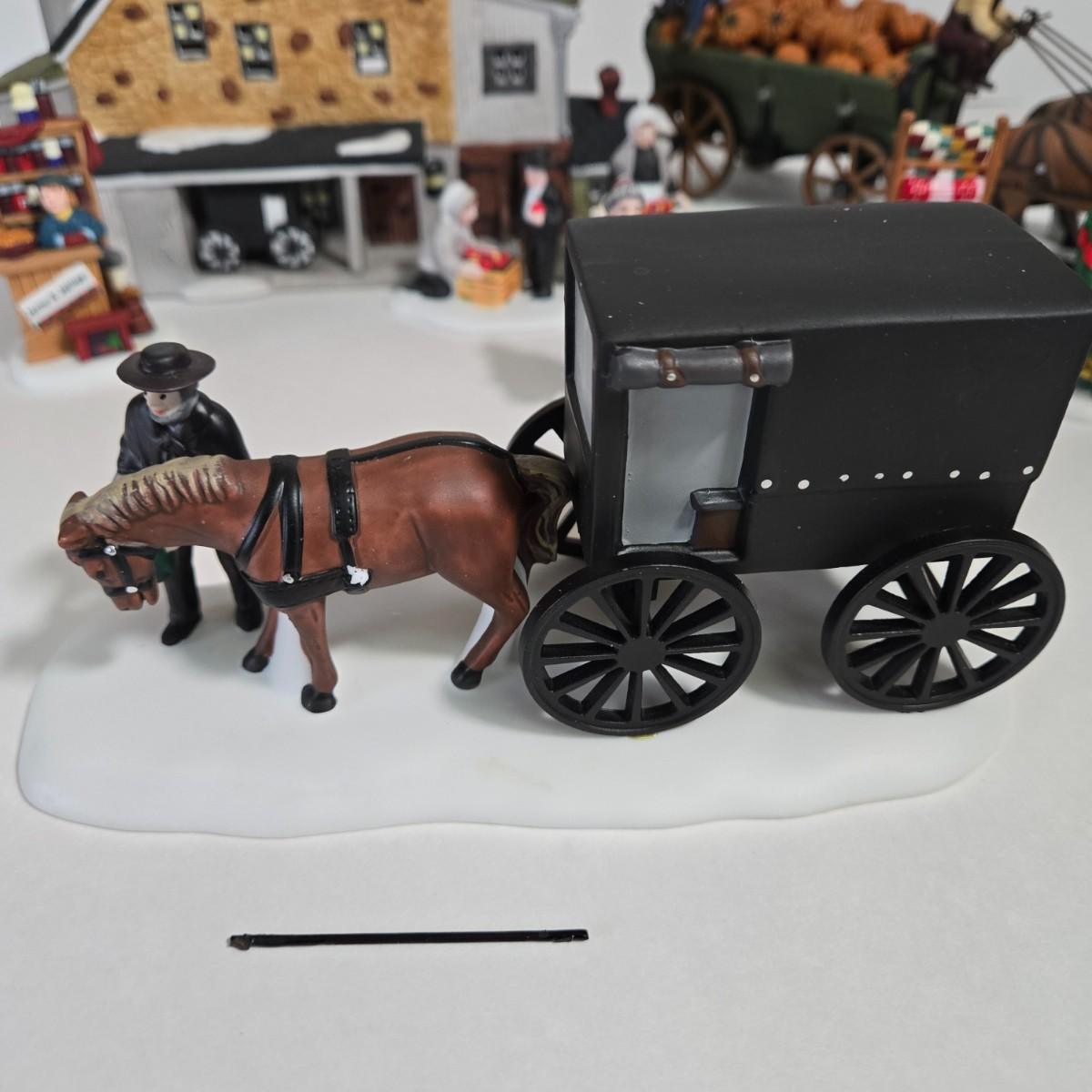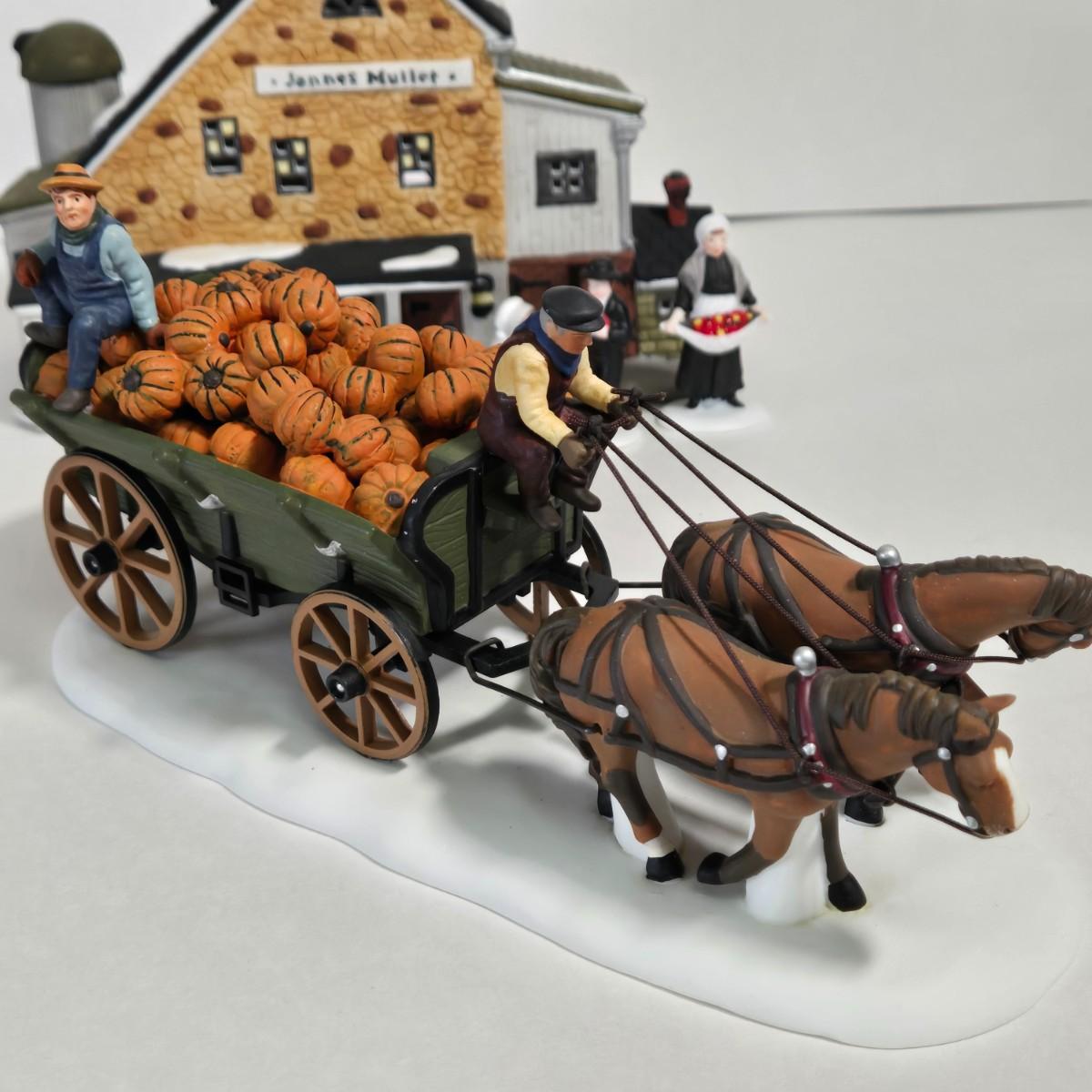 LOT 120X: Dept. 56 "Jannes Mullet Amish Barn", "Handmade Quilts", "Woolens and Preserves", "Amish Buggy", and " Harvest Pumpkin Wagon" /All with original Boxes