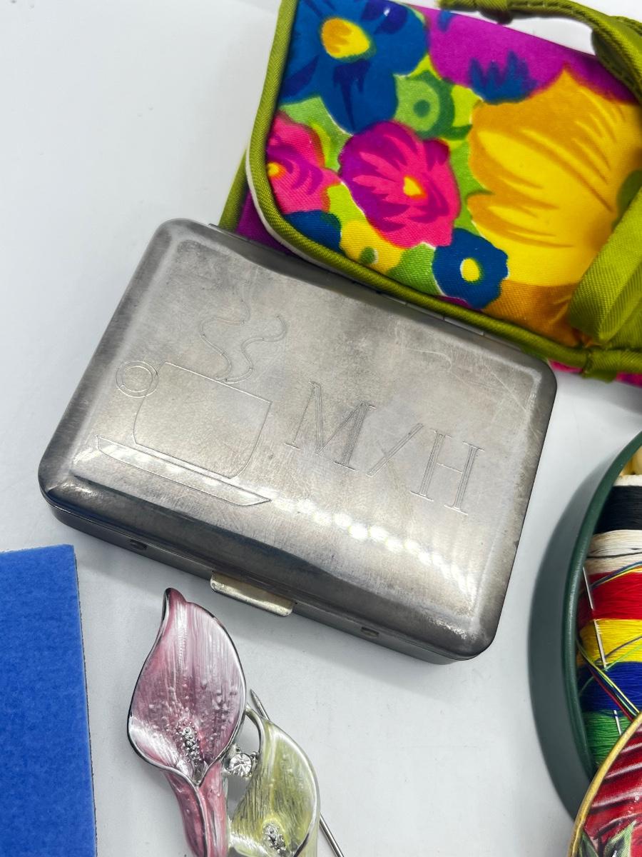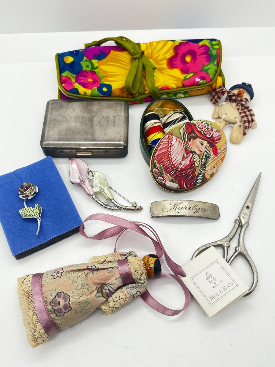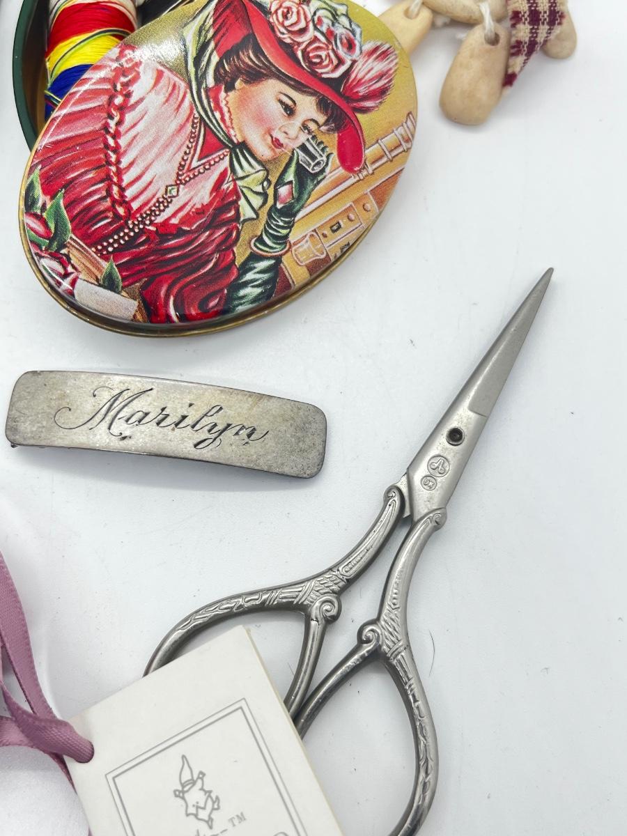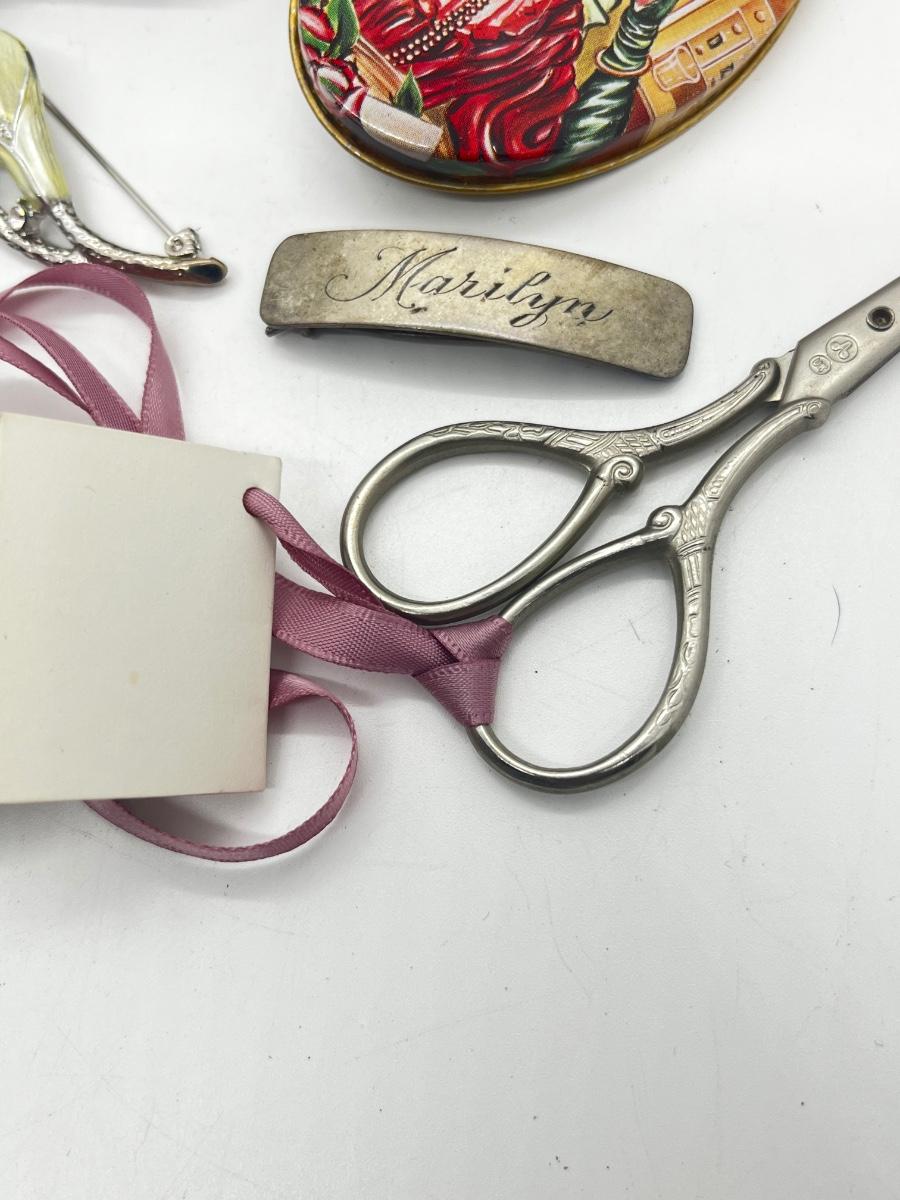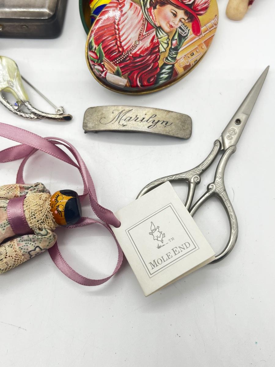LOT 139J: Vintage Odds and Ends Collection: Silver Plated Box for Sweetener Packets, "Marilyn" Barette, Sewing Tin, Scissors and More!
