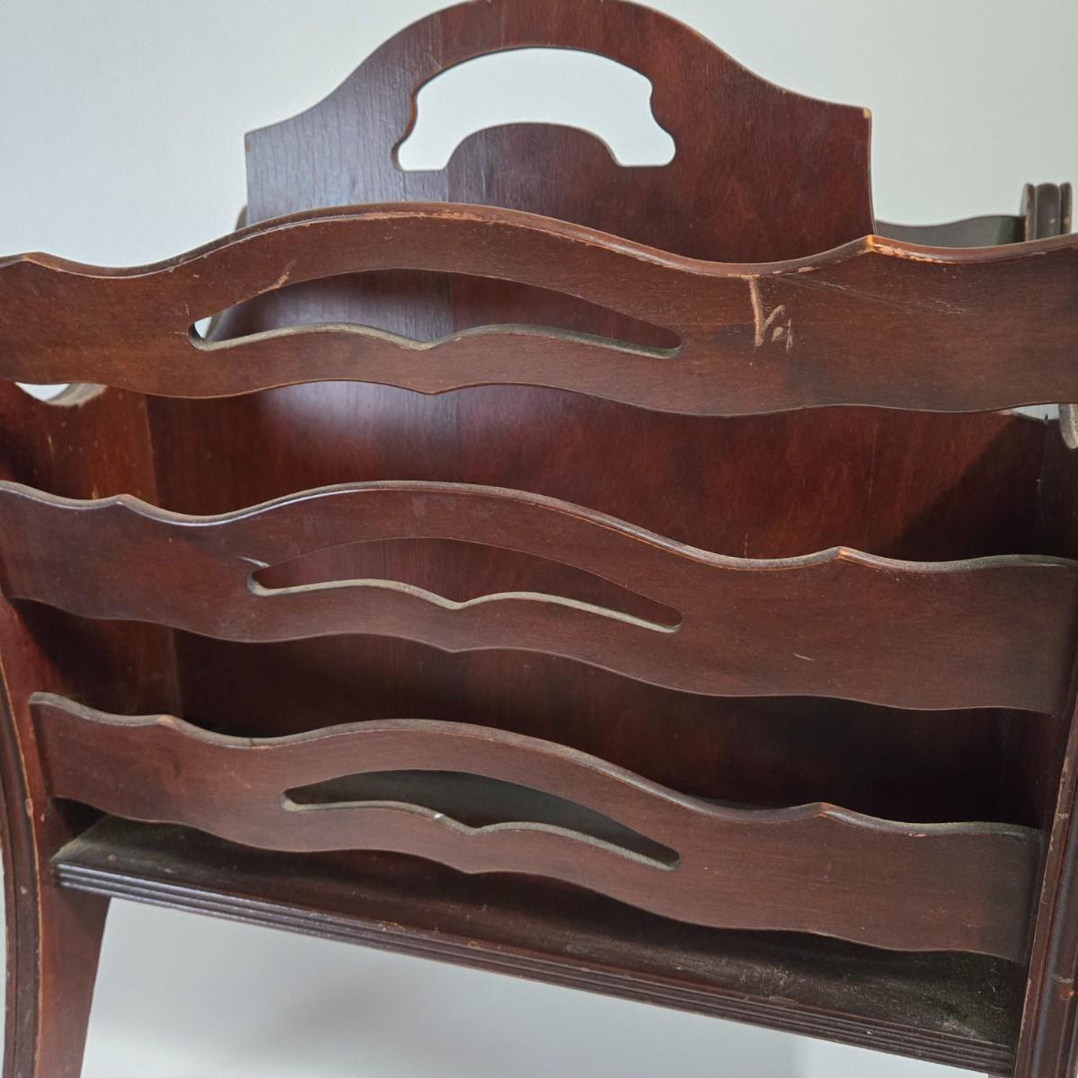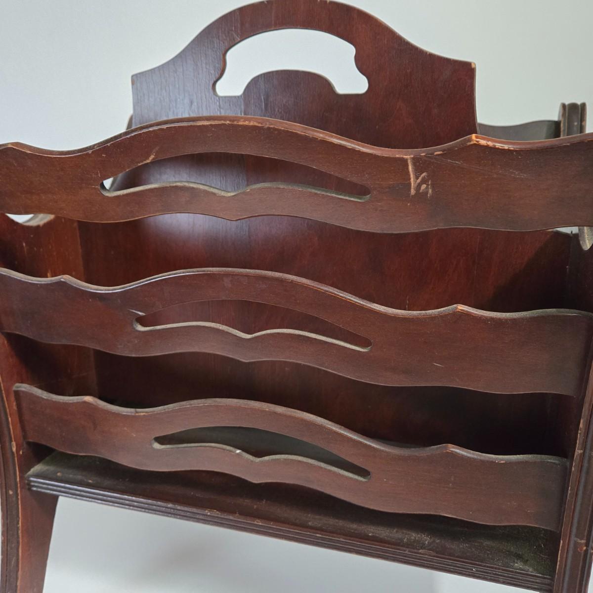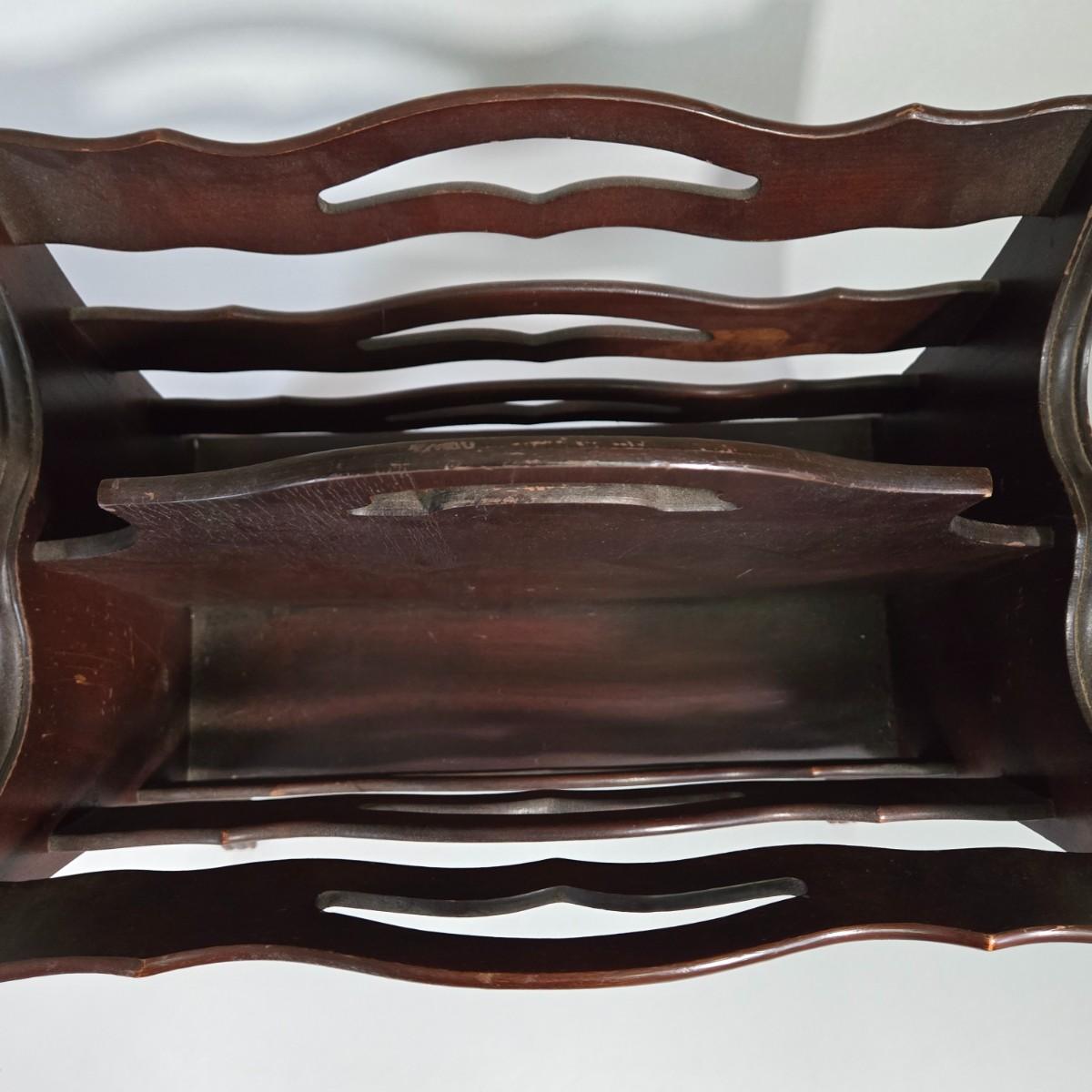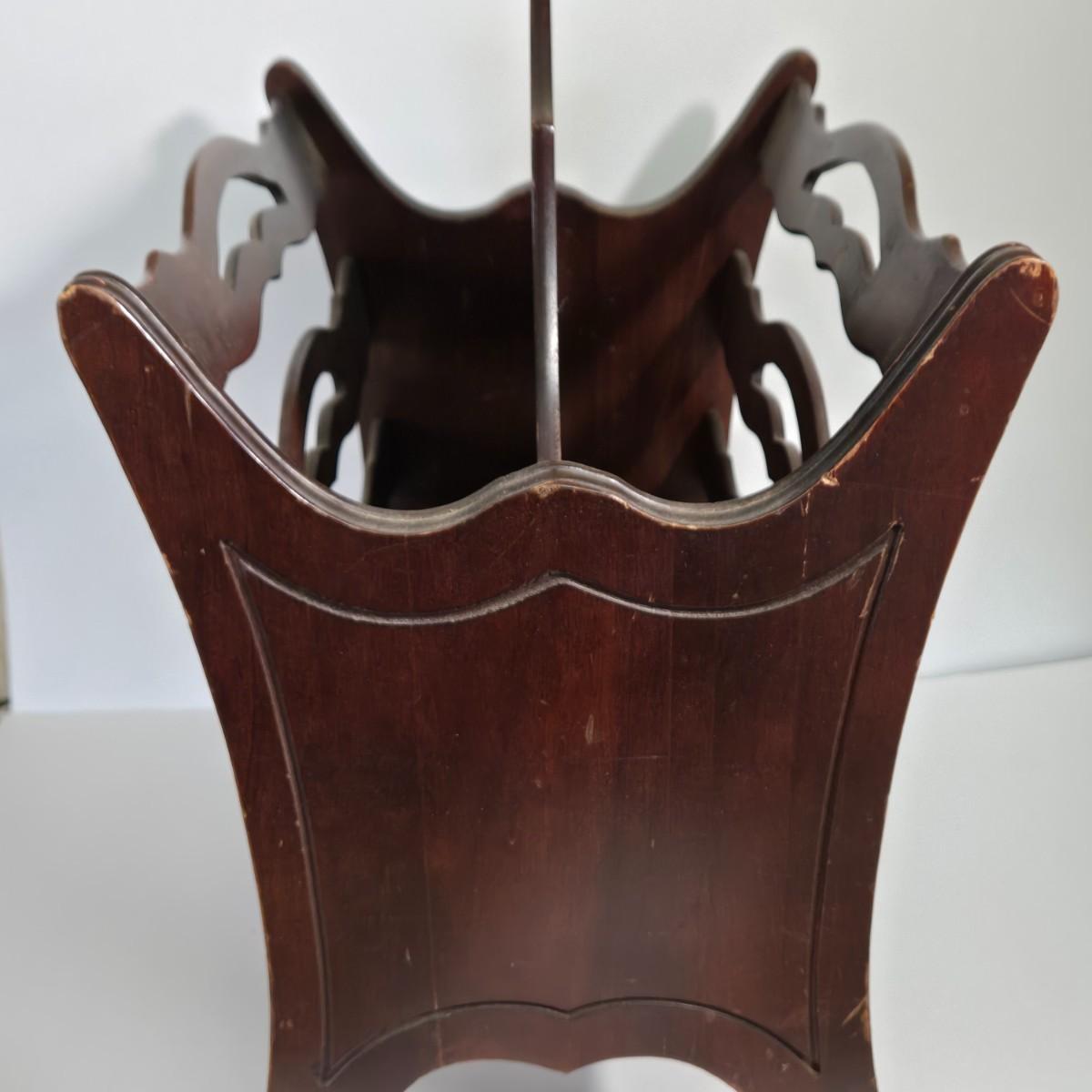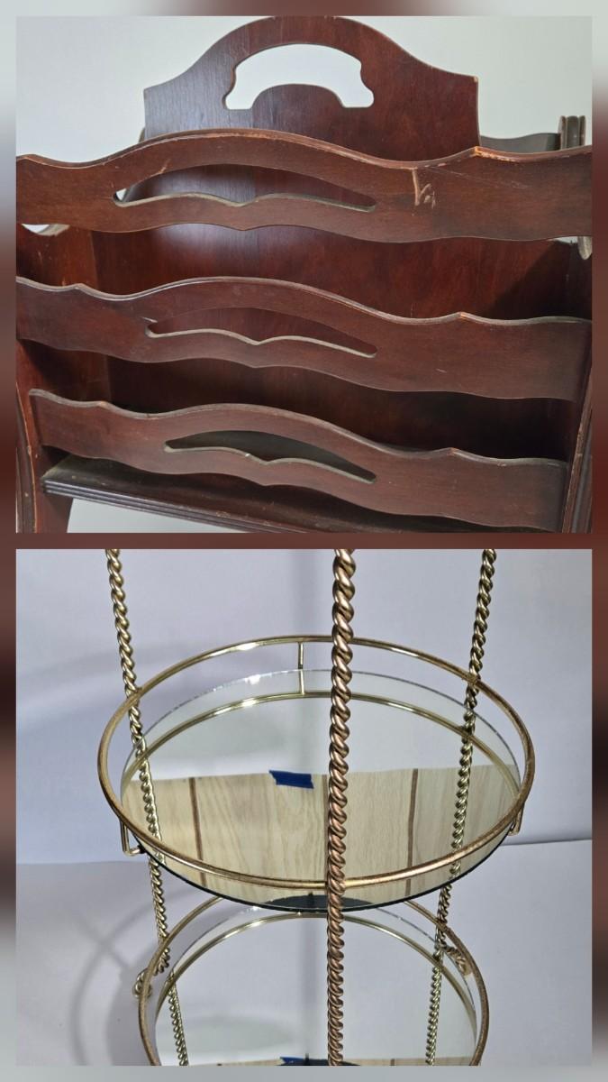 LOT 165X: MCM Wooden Magazine Holder and Brass-tone and Mirror Round Plant Stand/Side Table