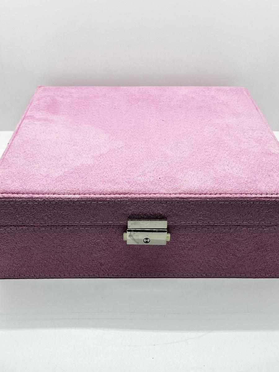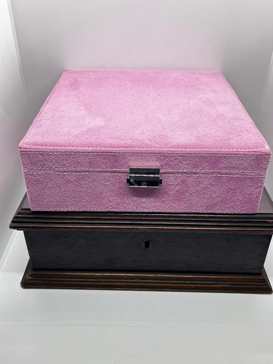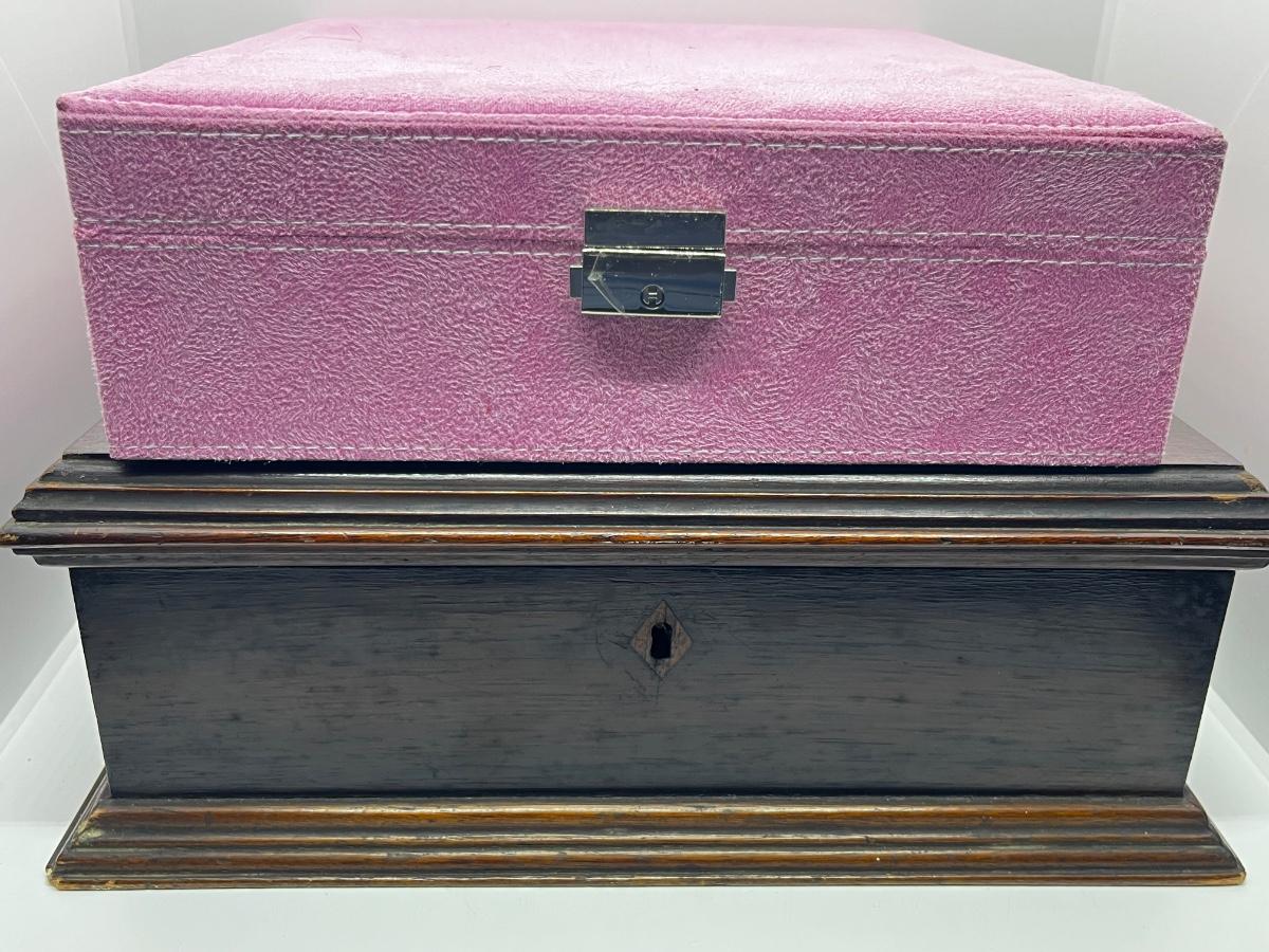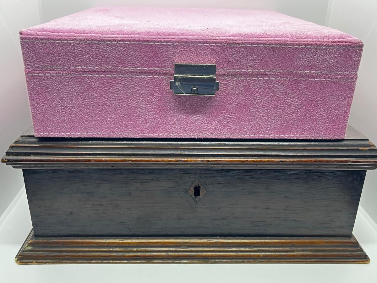 LOT 279: Jewelry Boxes: Vintage Wooden Red Velvet Lined + Pink Faux Suede