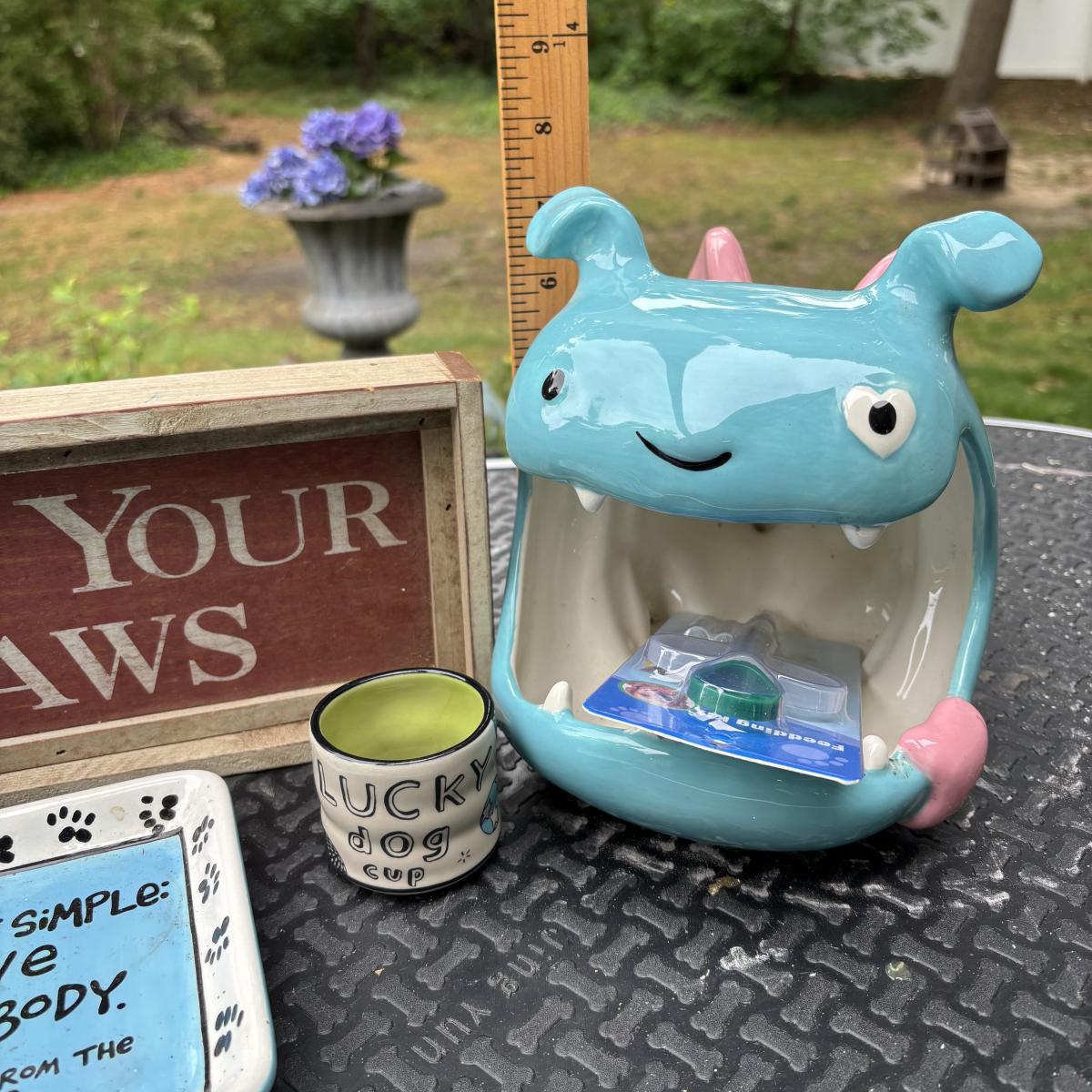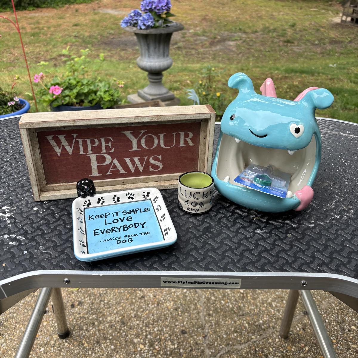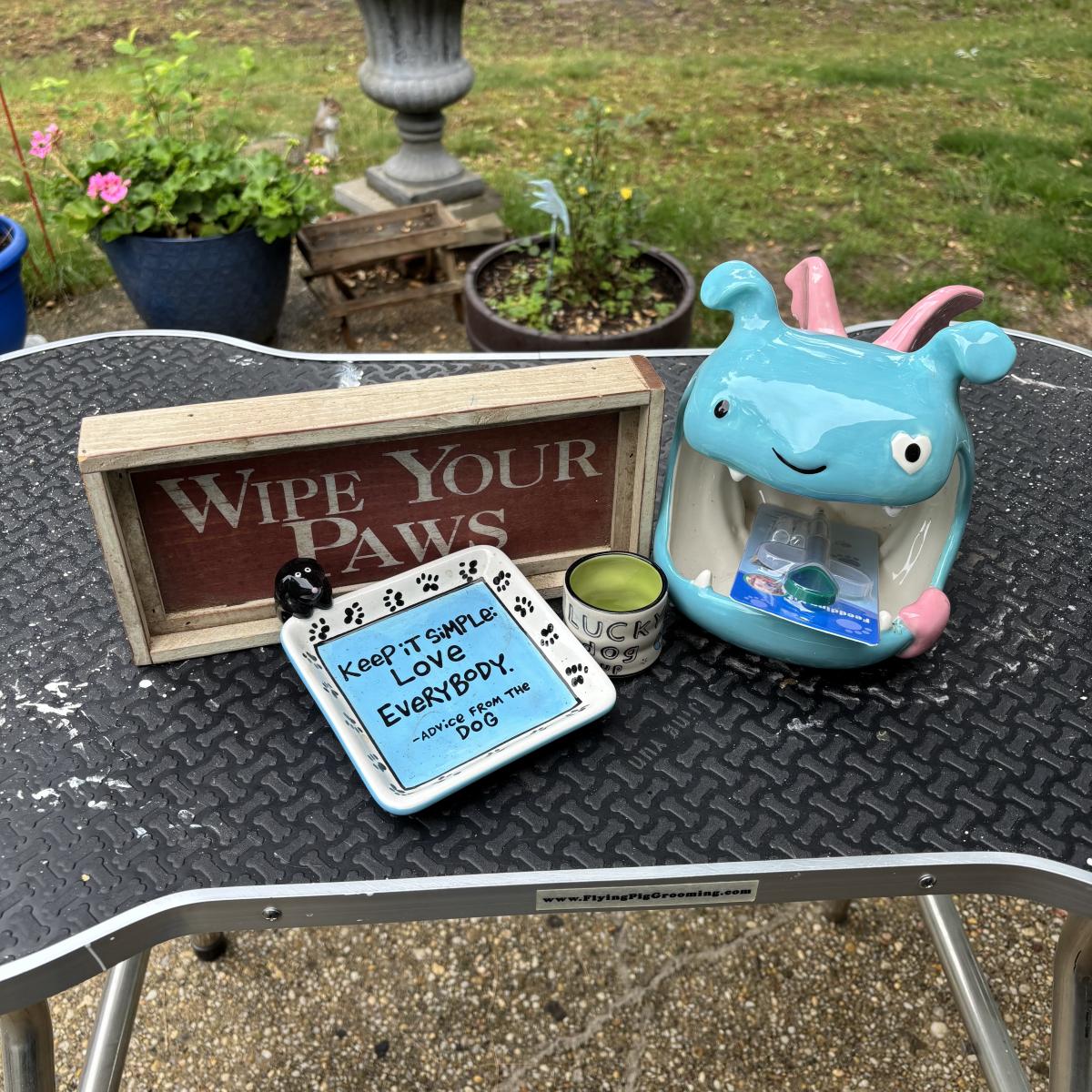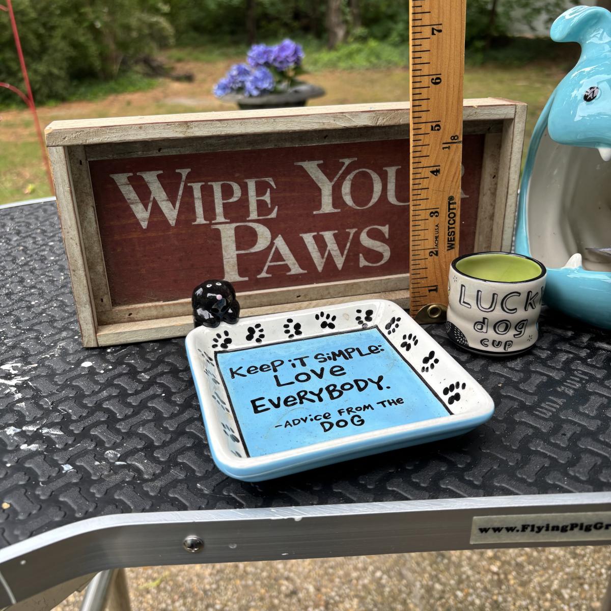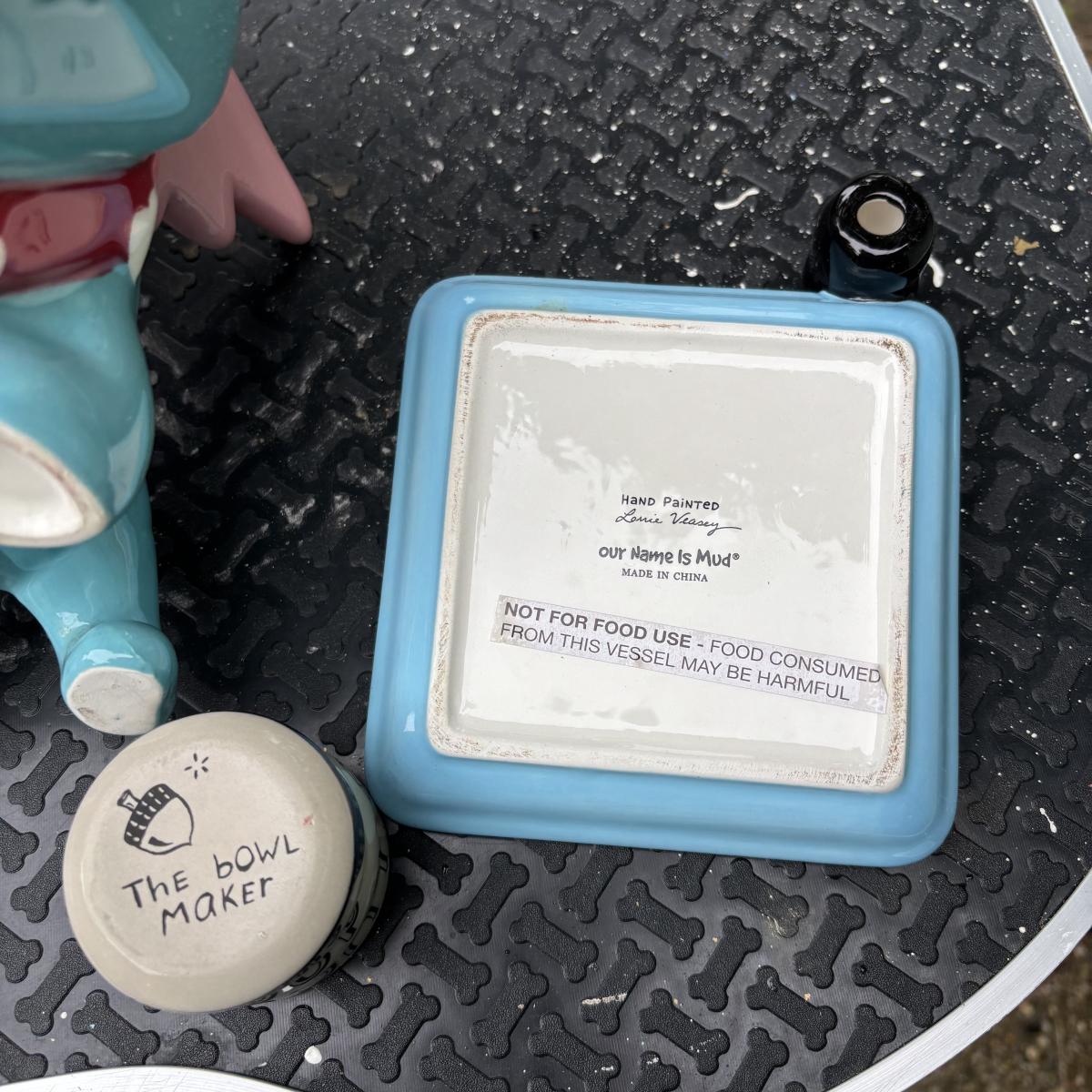 LOT 289: Flying Pig Pet Grooming Table: Valentines Bulldog Candy Dish: Hand Painted Louie Veasey Dish & Lucky Dog Cup by The Bowl Maker