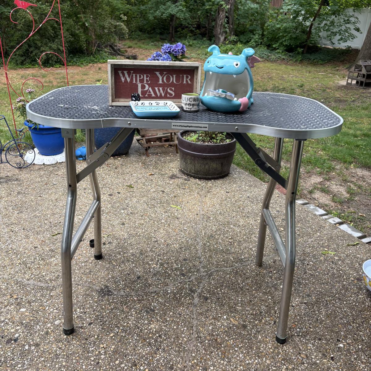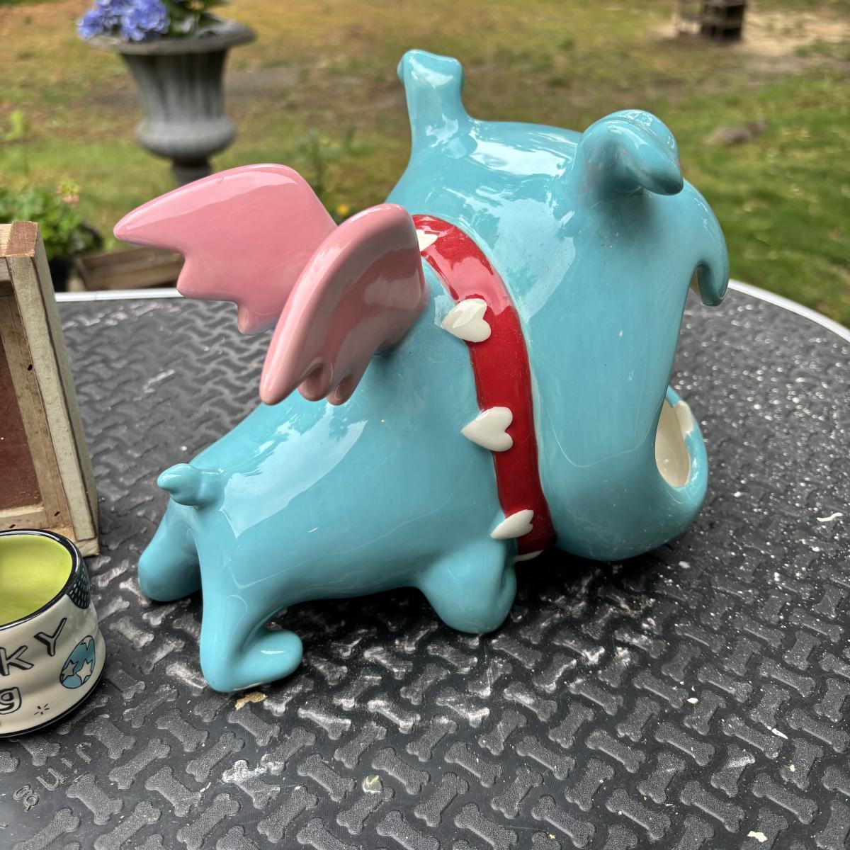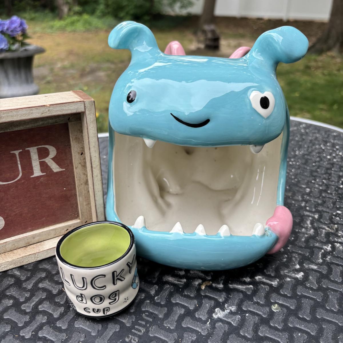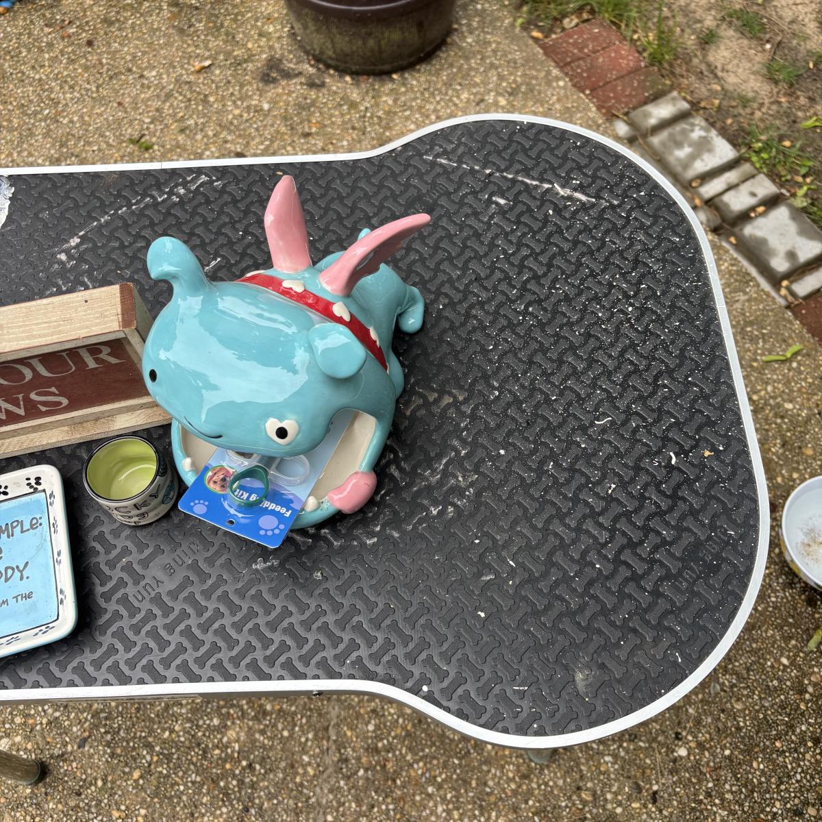 LOT 289: Flying Pig Pet Grooming Table: Valentines Bulldog Candy Dish: Hand Painted Louie Veasey Dish & Lucky Dog Cup by The Bowl Maker