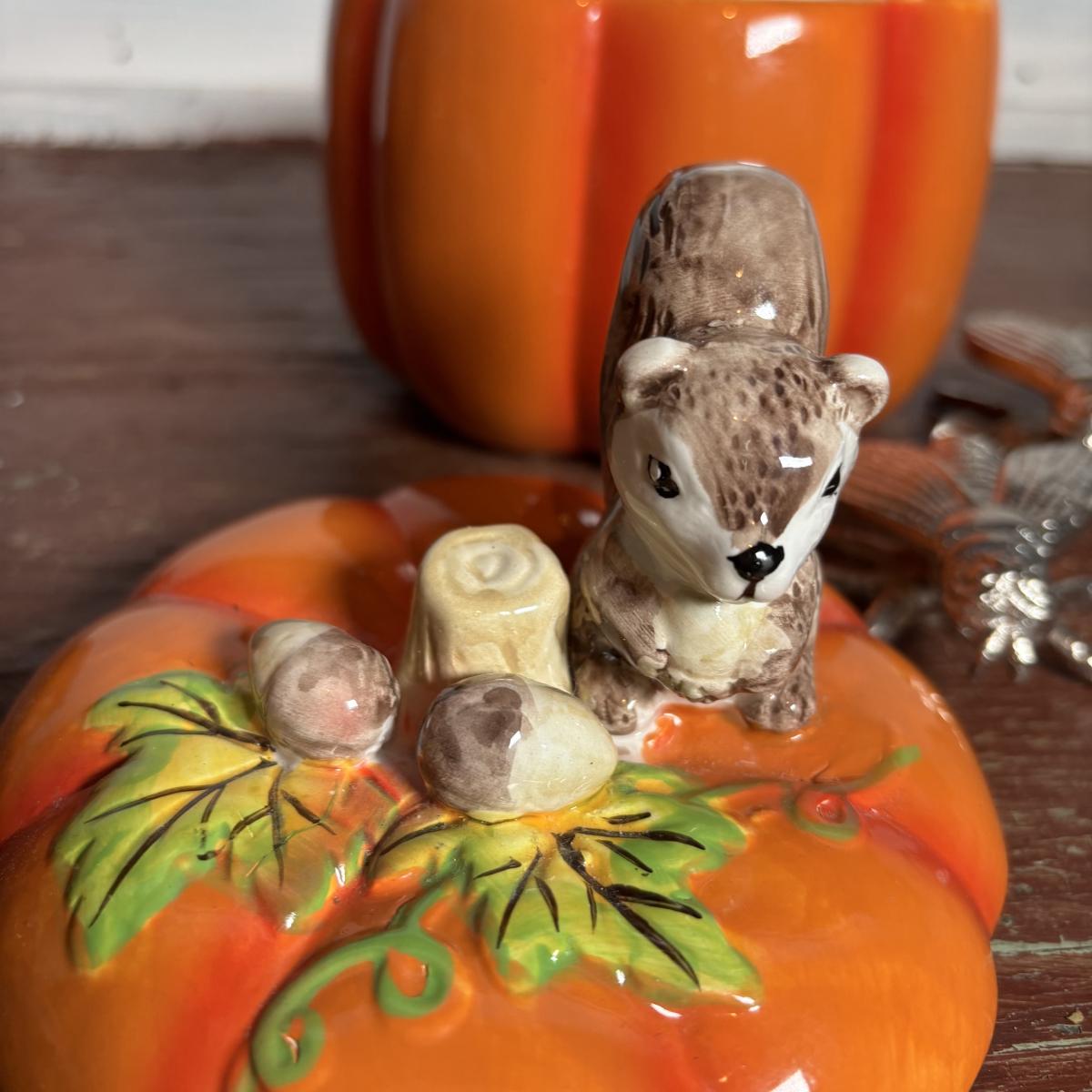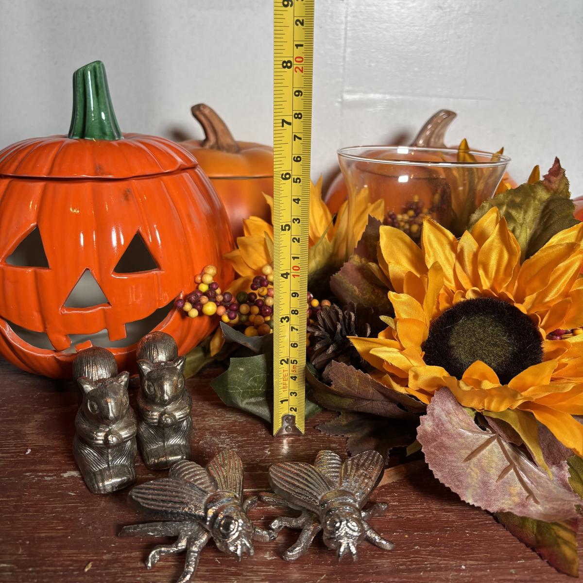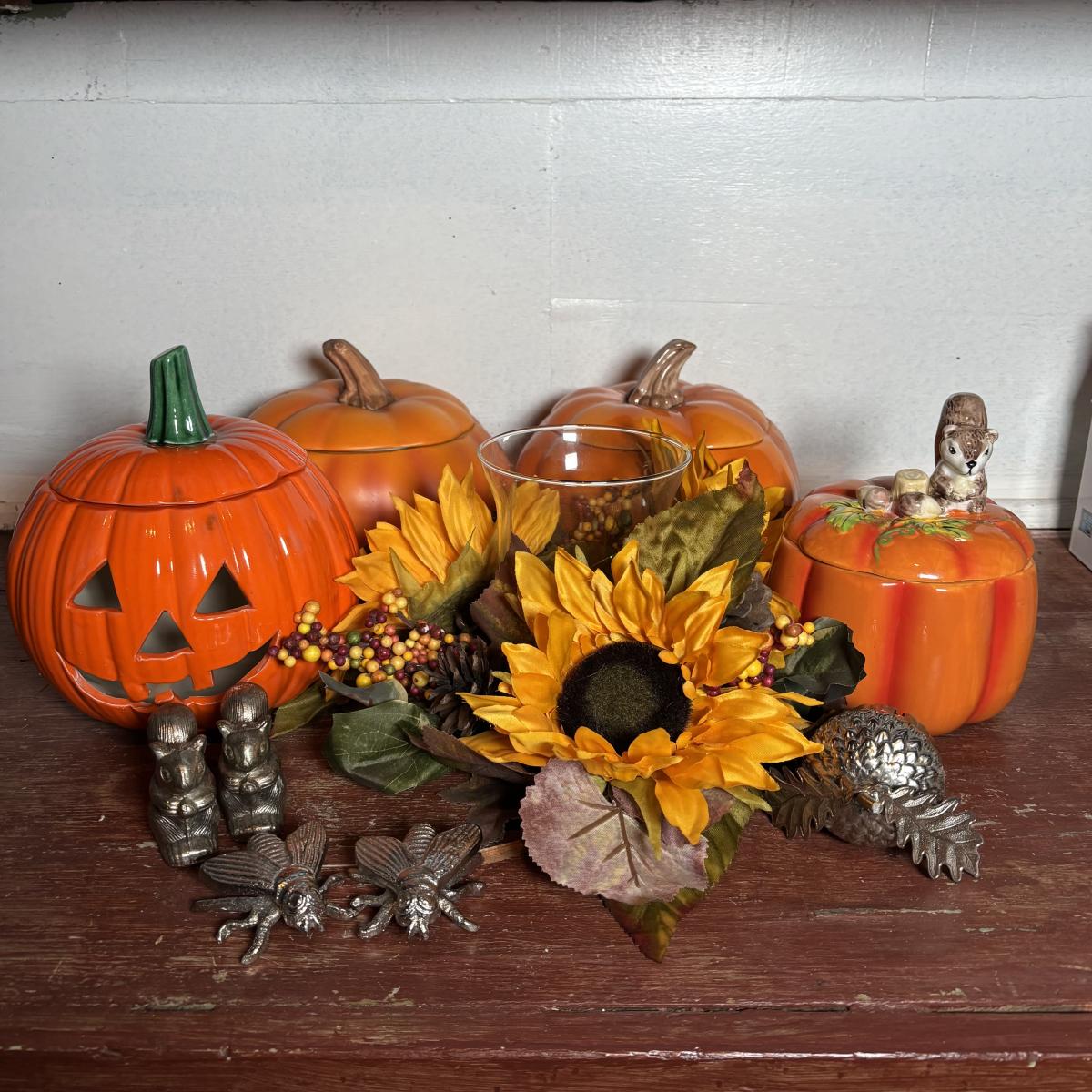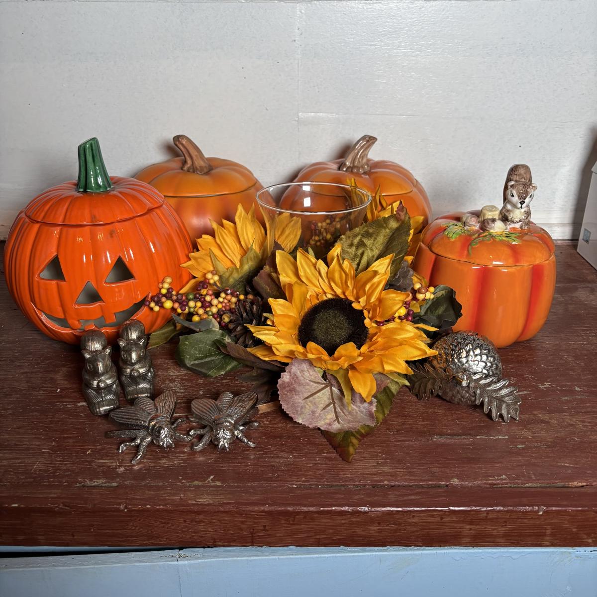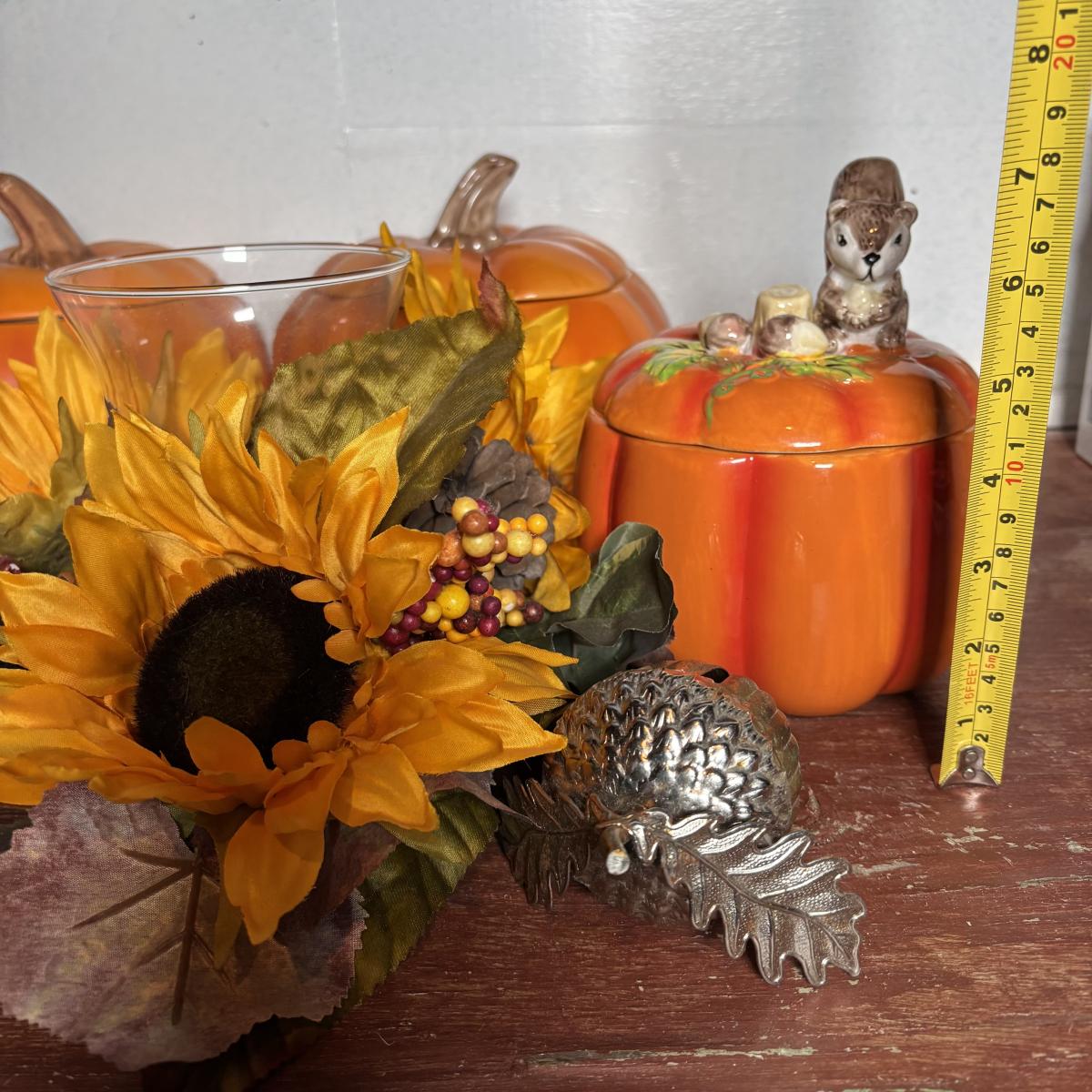 LOT 291: Fall Decor: Ceramic Pumpkins, Squirrel Salt/Pepper Shakers, Floral Center Piece and More
