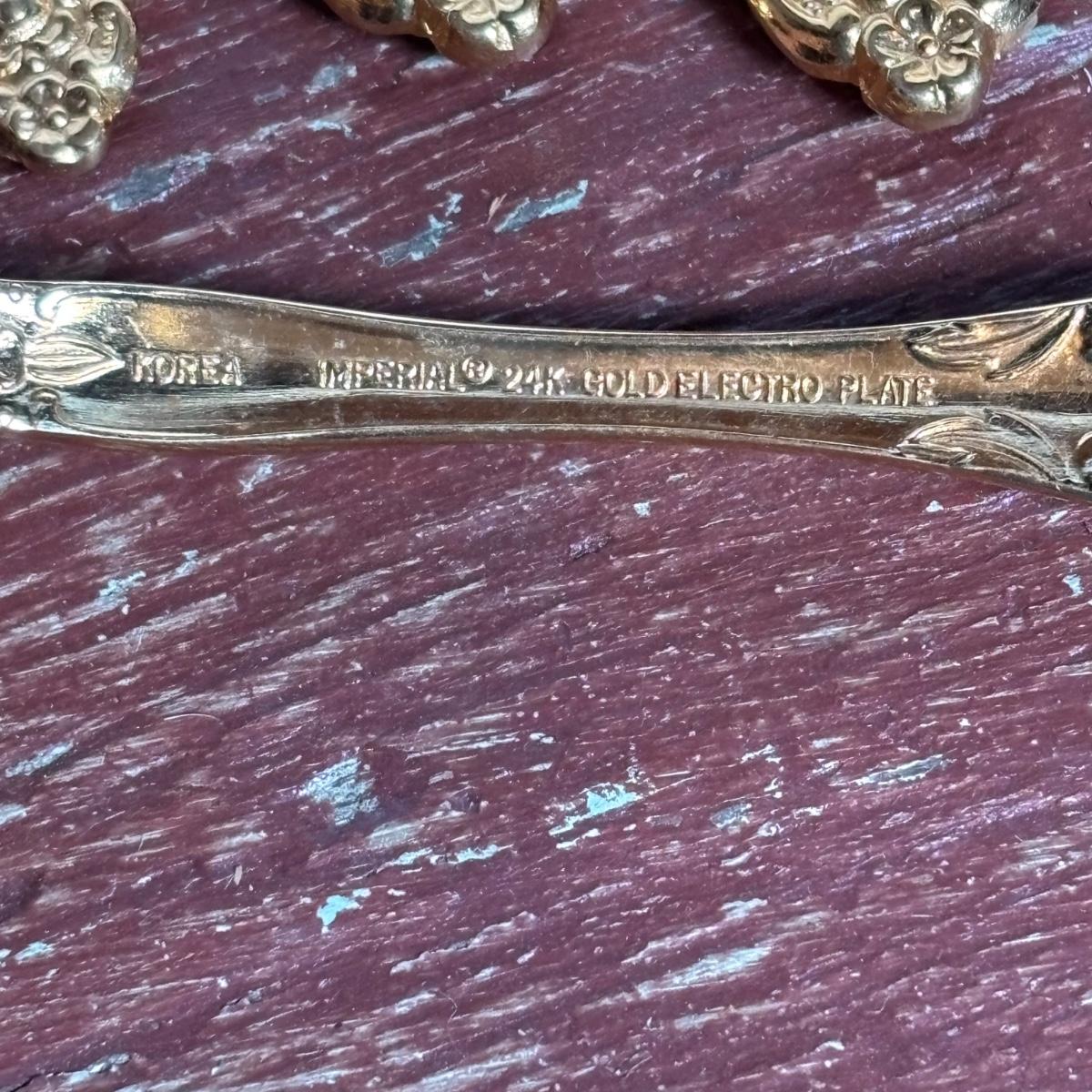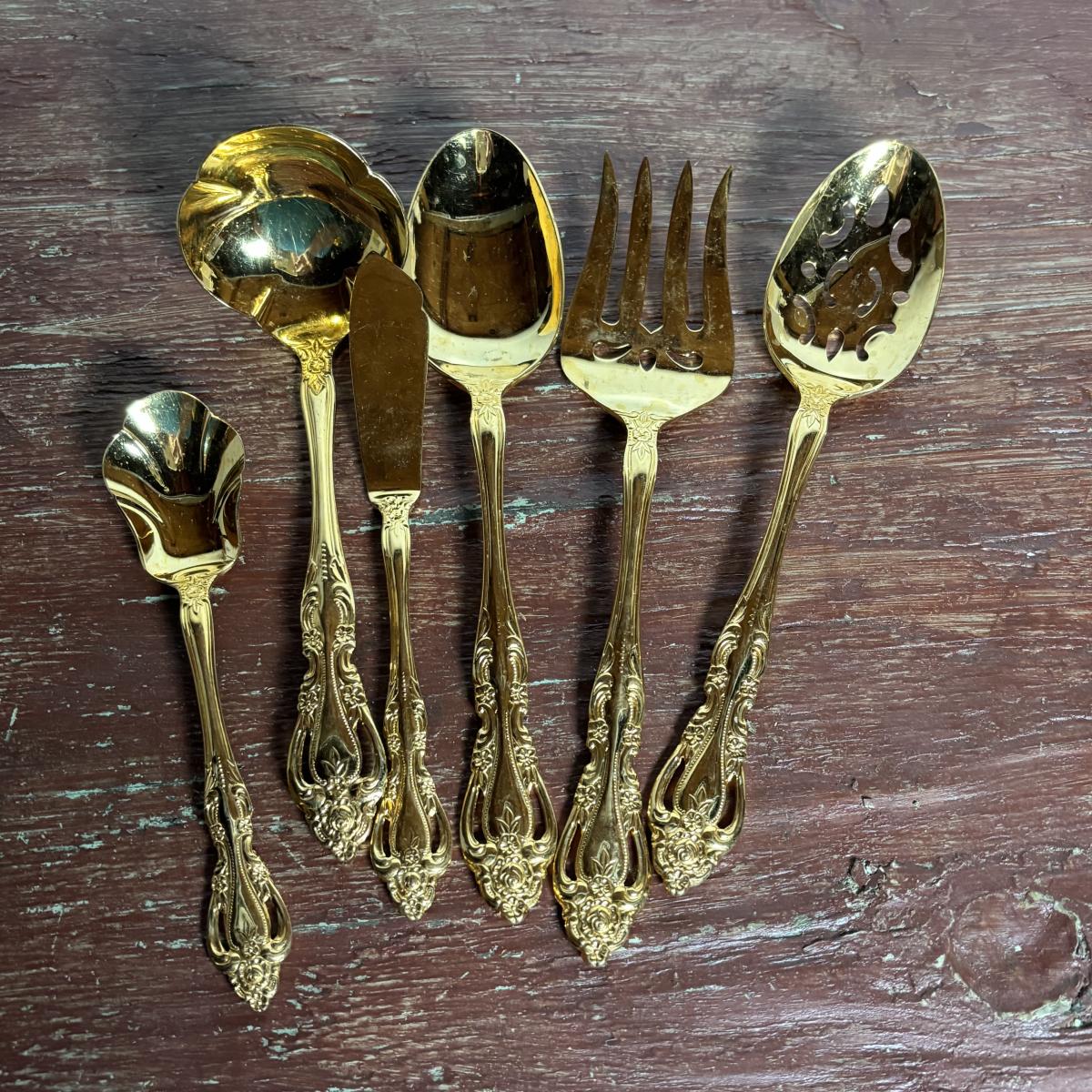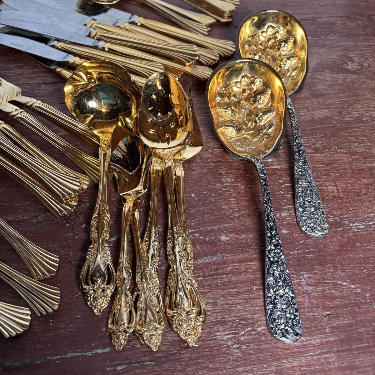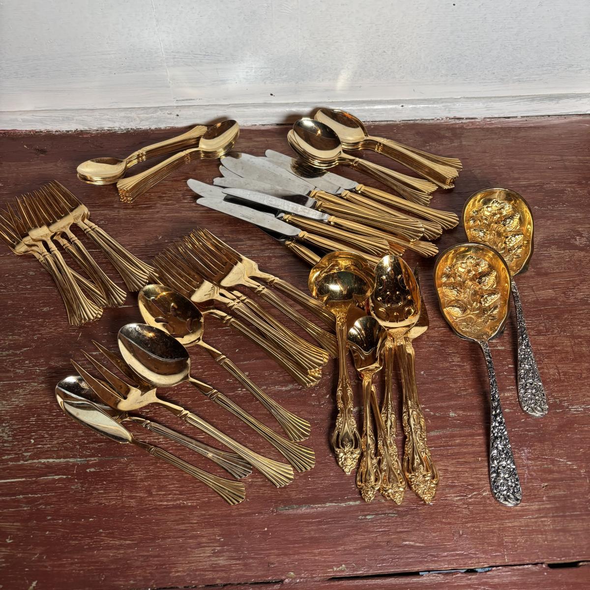 LOT 295: Godinger, Imperial 24k Gold Electro Plate and Cambridge Tracy Stainless Gold-Plated Flatware