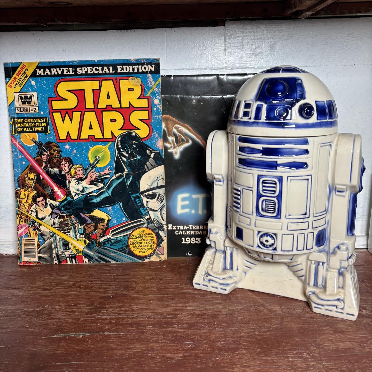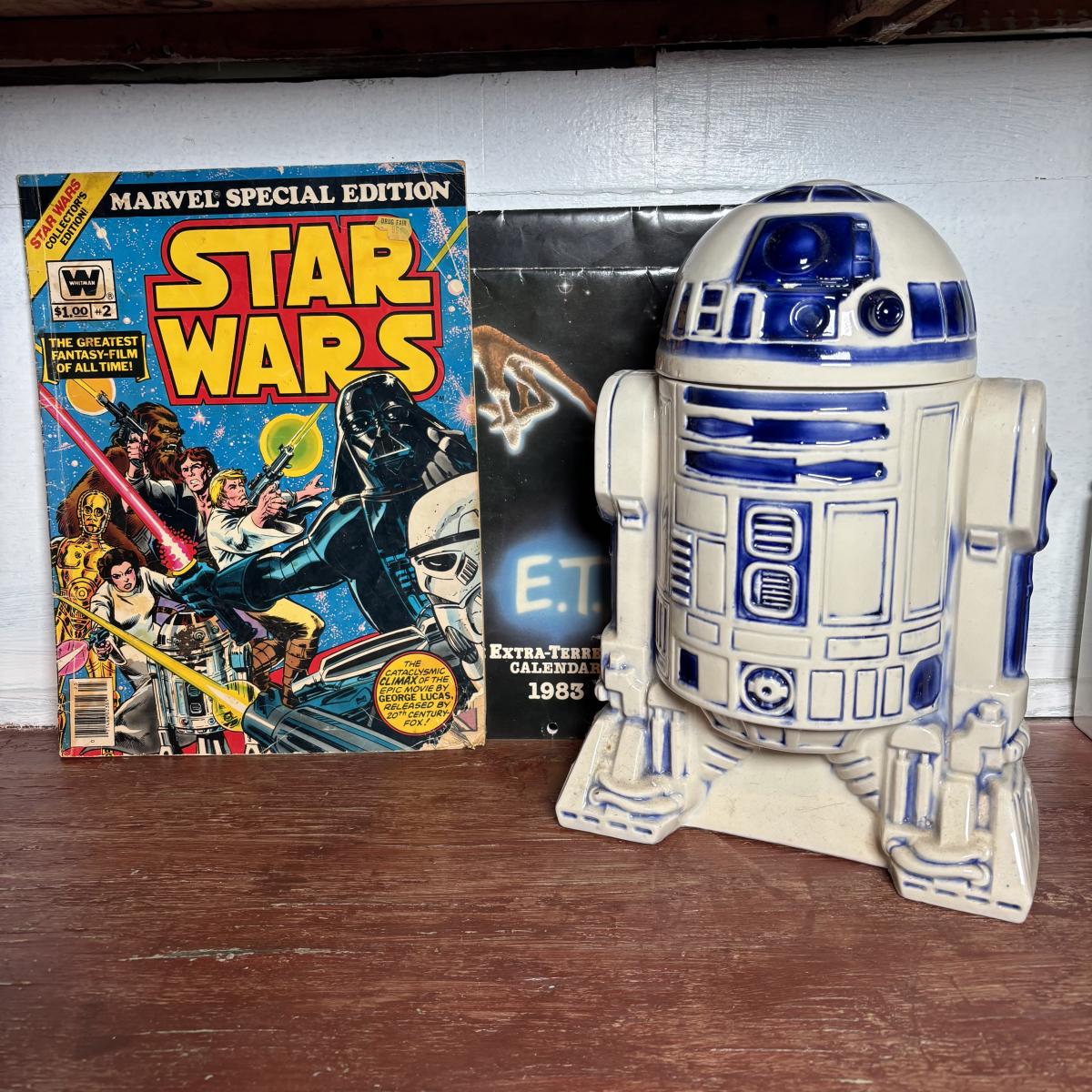 LOT 296: Vintage R2-D2 Cookies Jar (1977), Twentieth Century Fox Film Corporation, Marvel Special Edition Star Wars Comic Book, 1979 Star Wars Calendar & 1983 ET Calendar