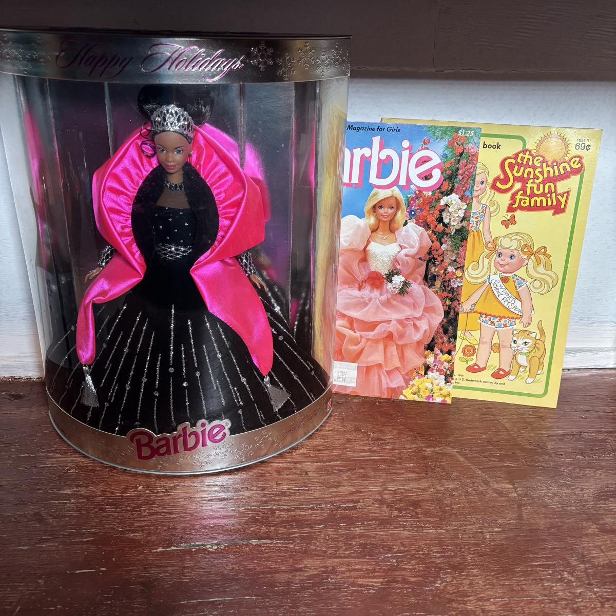 LOT 297: NIP 1998 Happy Holiday Barbie, 1985 Barbie Magazine & 1979 Sunshine Family Coloring Book