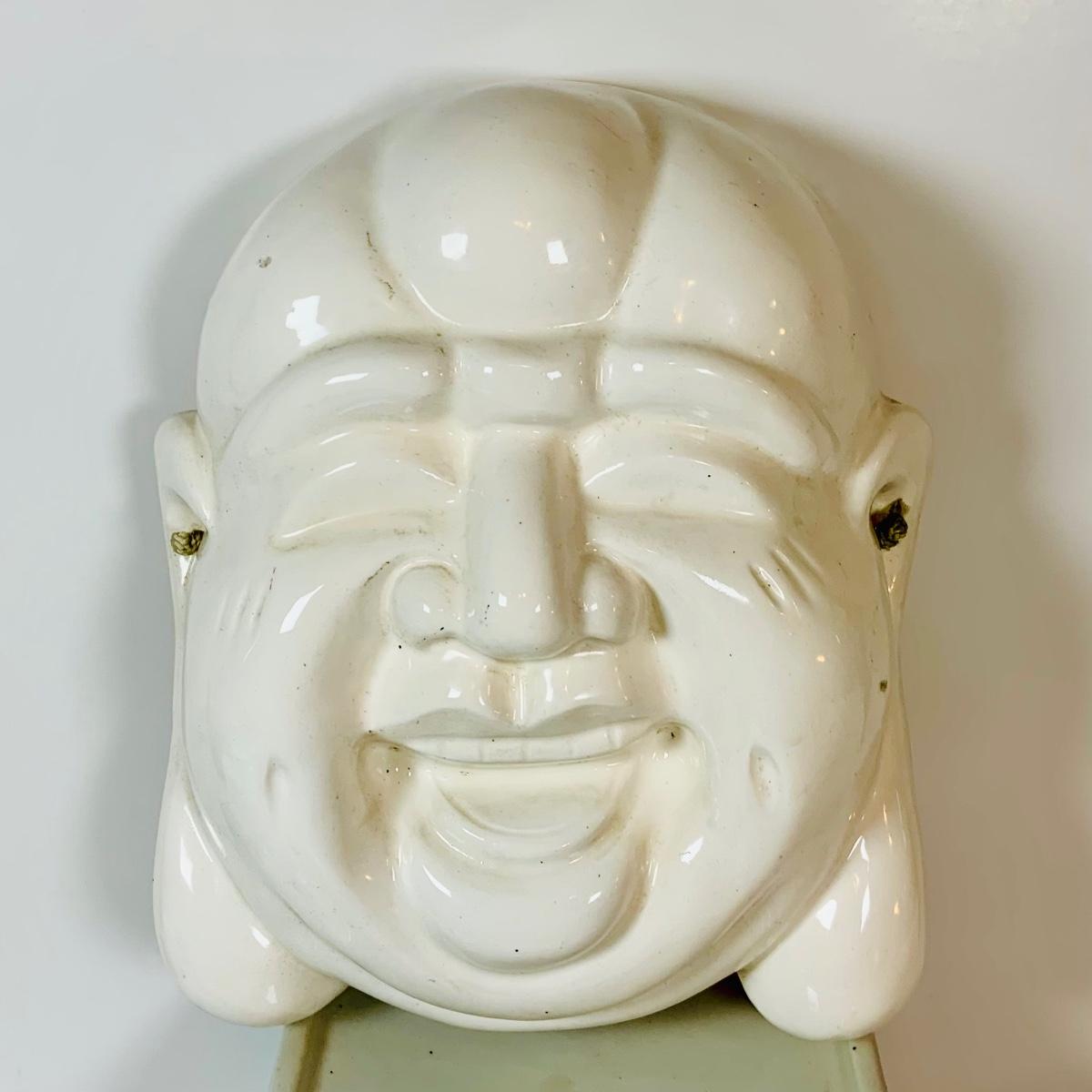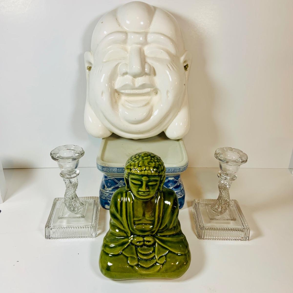 LOT 304: Buddha Mask and Kamokura Incense Burner, Glass Fish Candle Holder and Pedestal